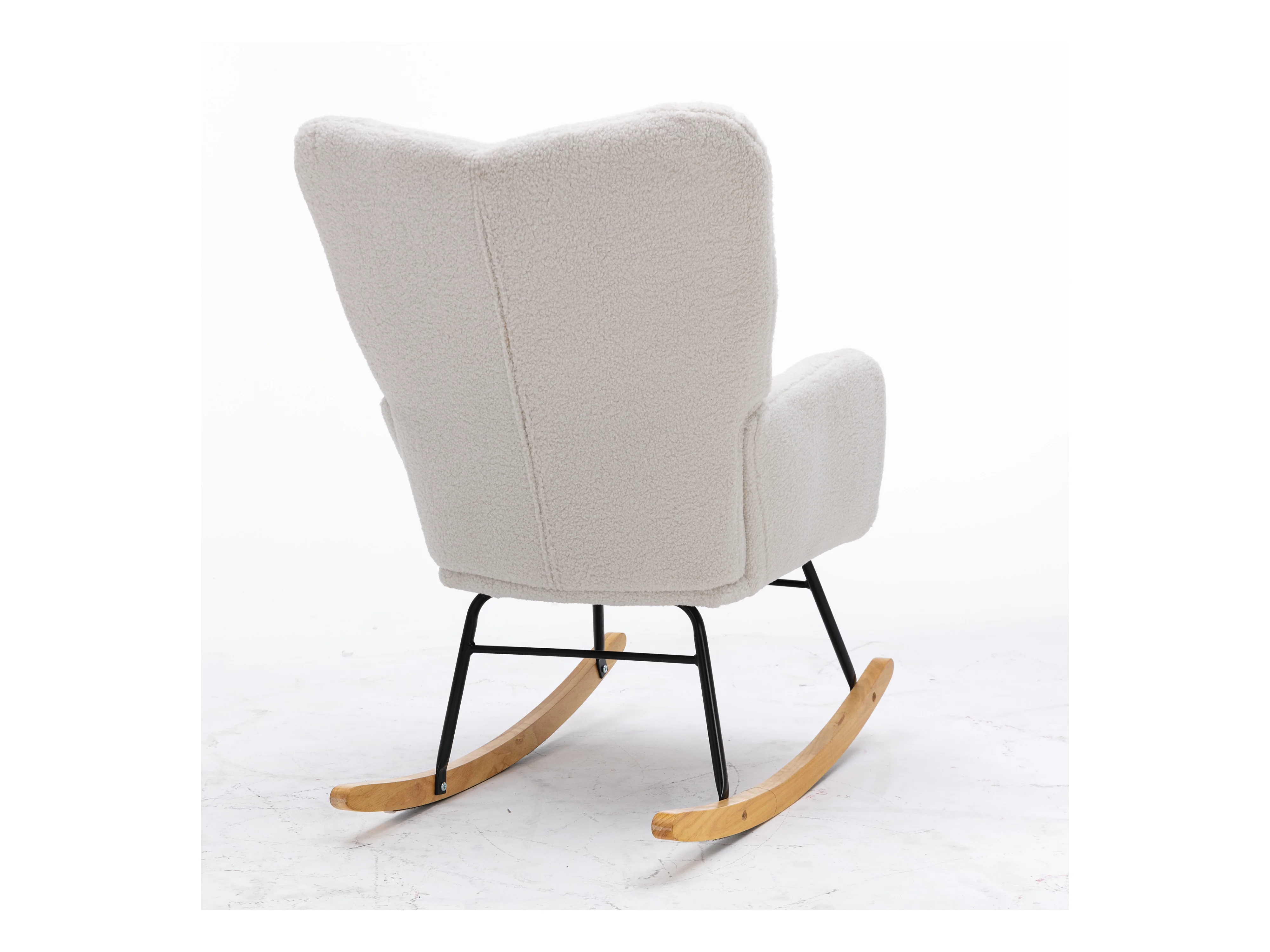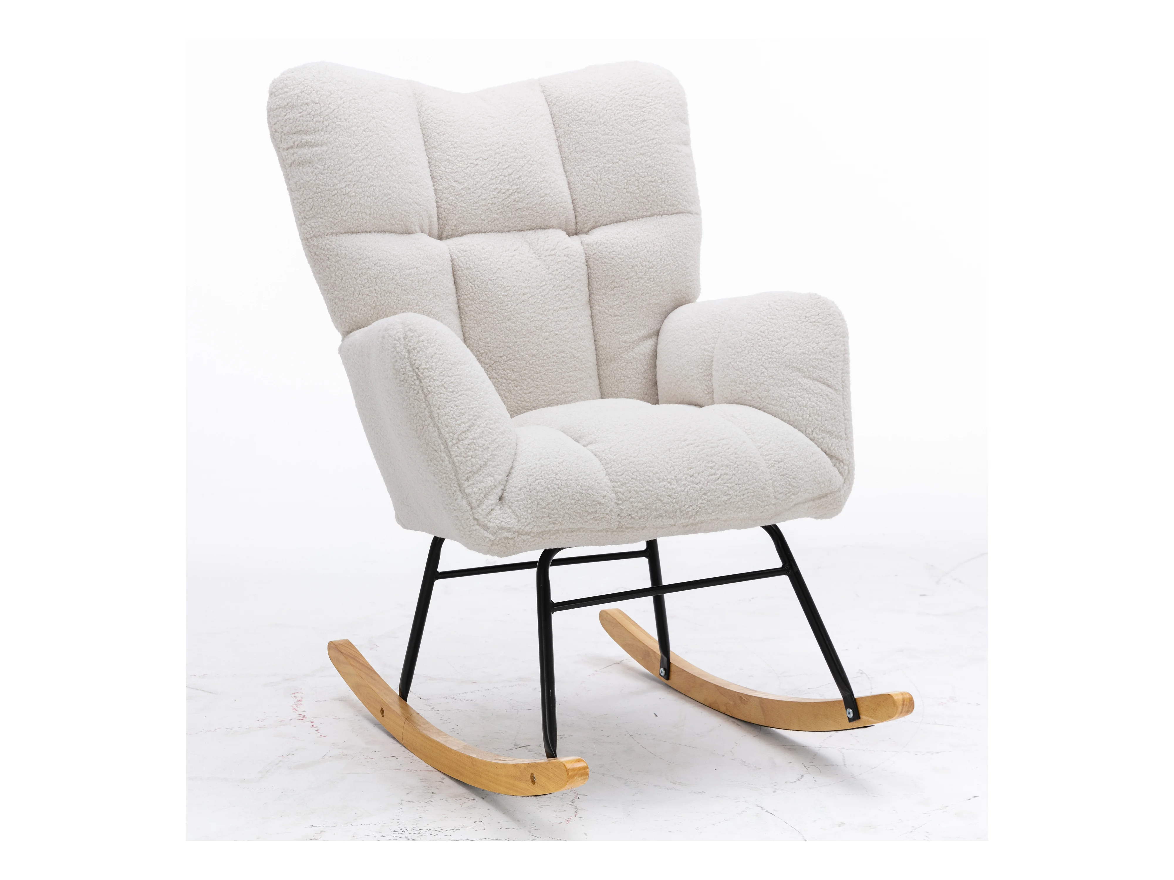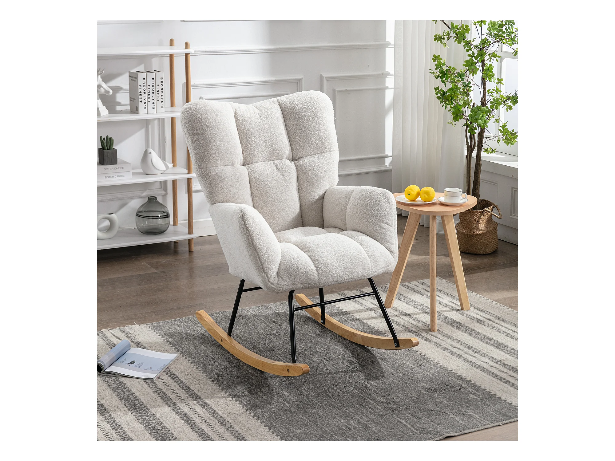 Sedia a dondolo moderna di metà secolo, in tessuto felpato, imbottita, in legno e metallo, bianca (80x70x95 cm)