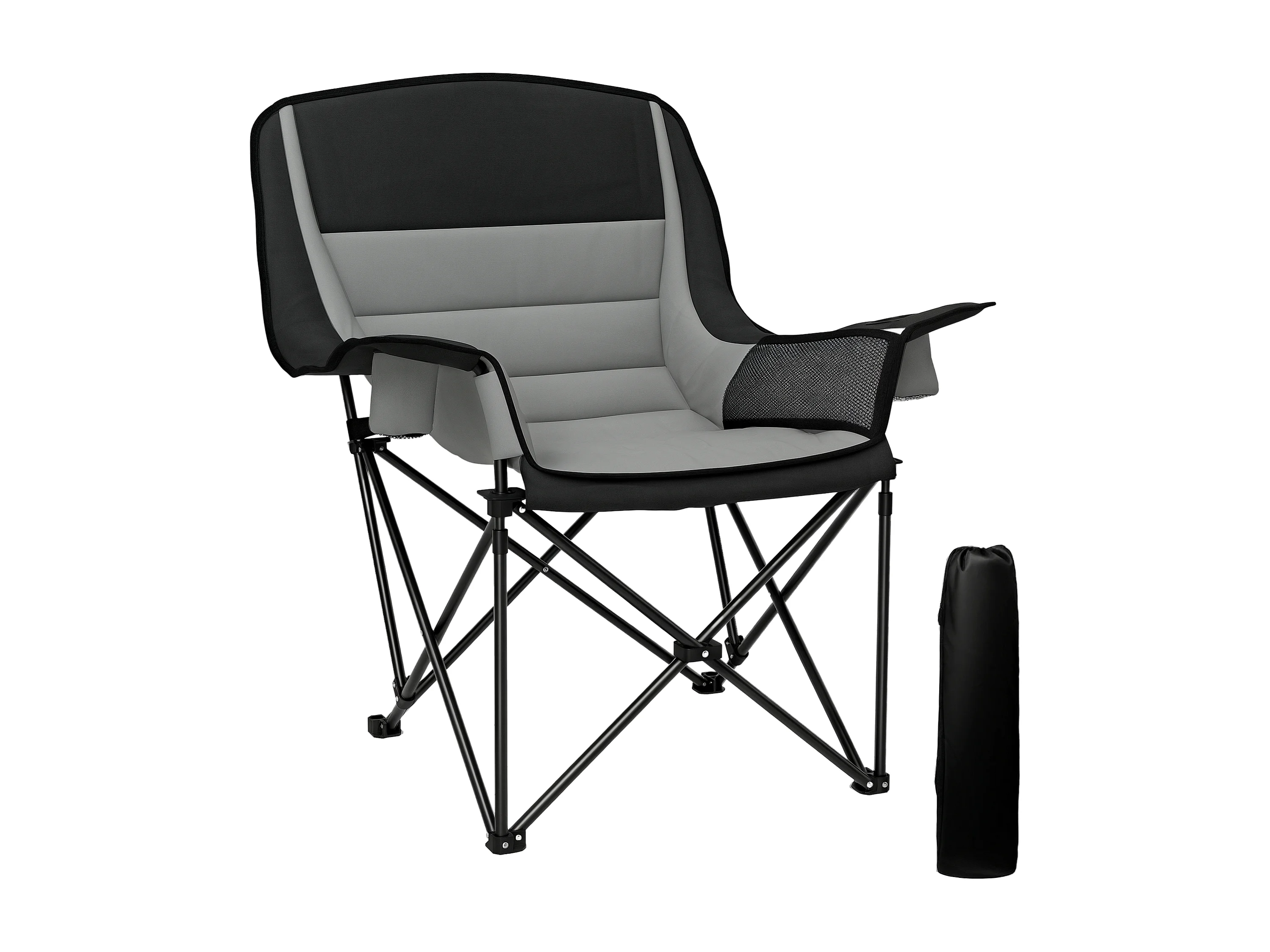 Sedia da campeggio pieghevole con portabicchieri e tasche grigio nero