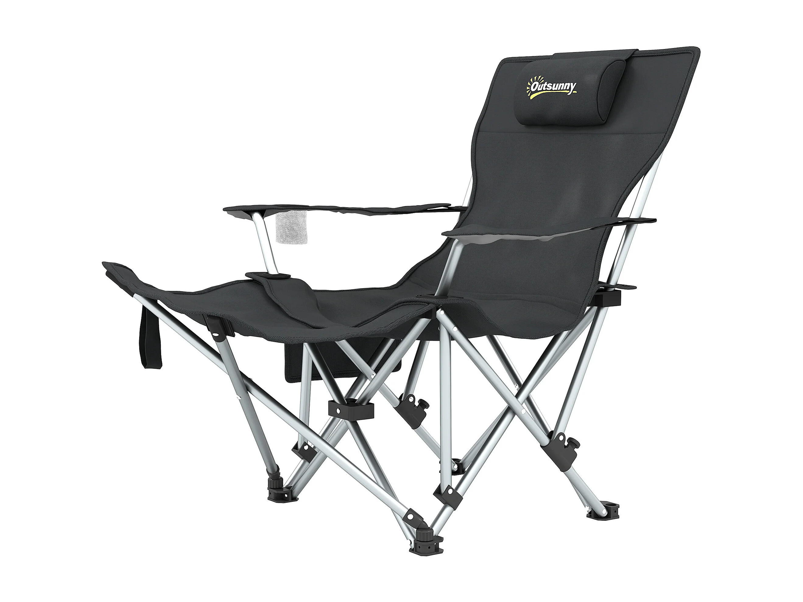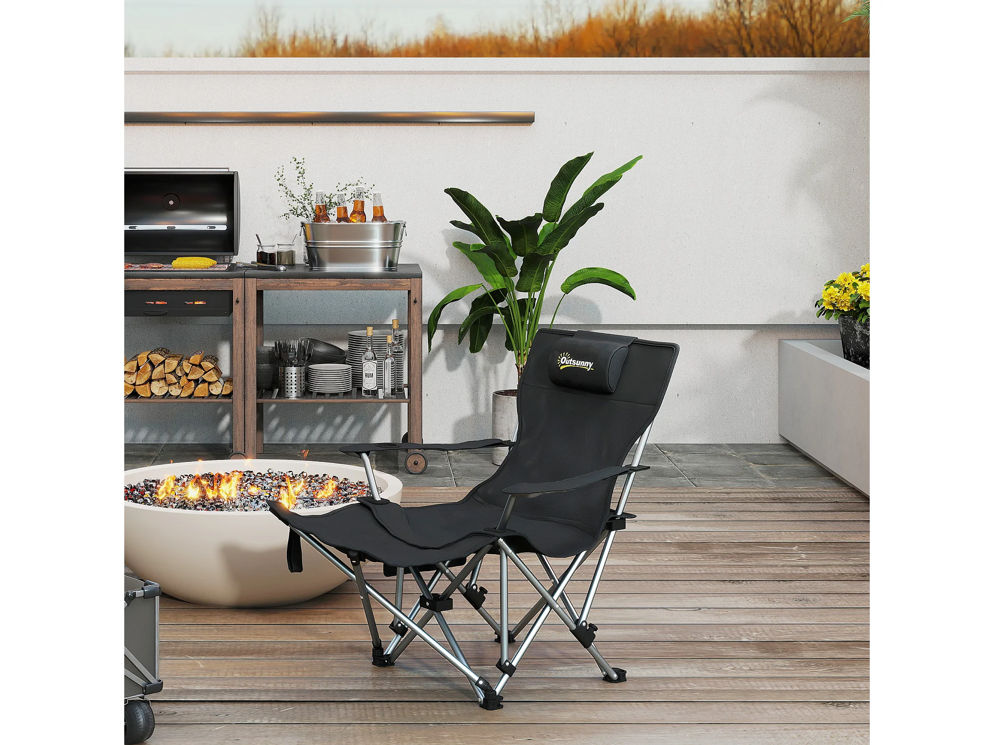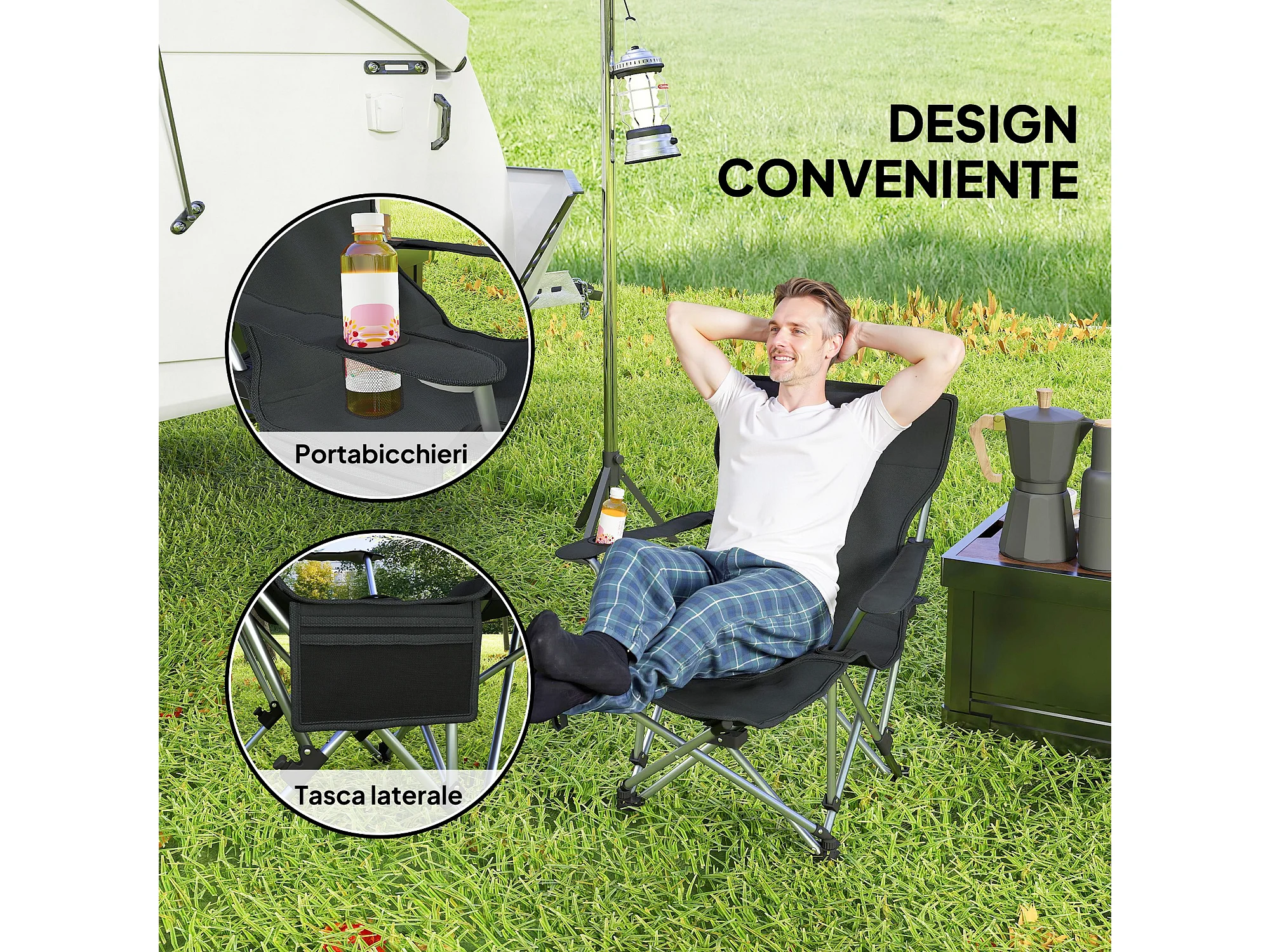 Sedia da campeggio pieghevole reclinabile con poggiapiedi nero
