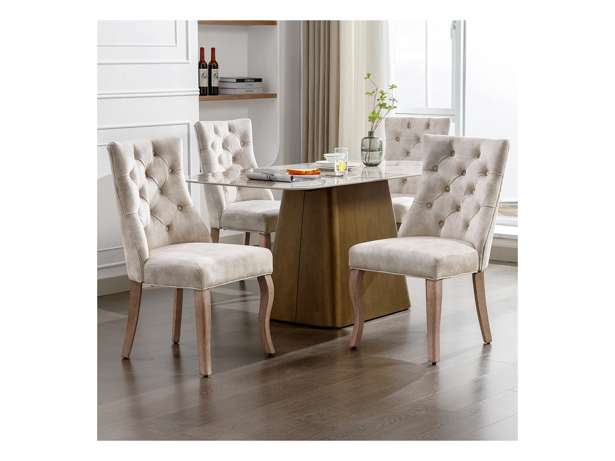 Sedia da pranzo, schienale alto in velluto beige, con lavorazione capitonné, gambe in legno massello, set da 4 (45x40x86 cm)