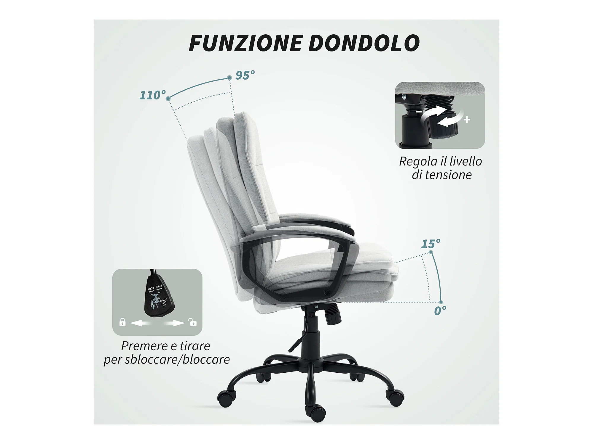 Sedia da ufficio con funzione massaggio, reclinabile, altezza regolabile, tessuto in poliestere, grigio chiaro (65x74x119 cm)