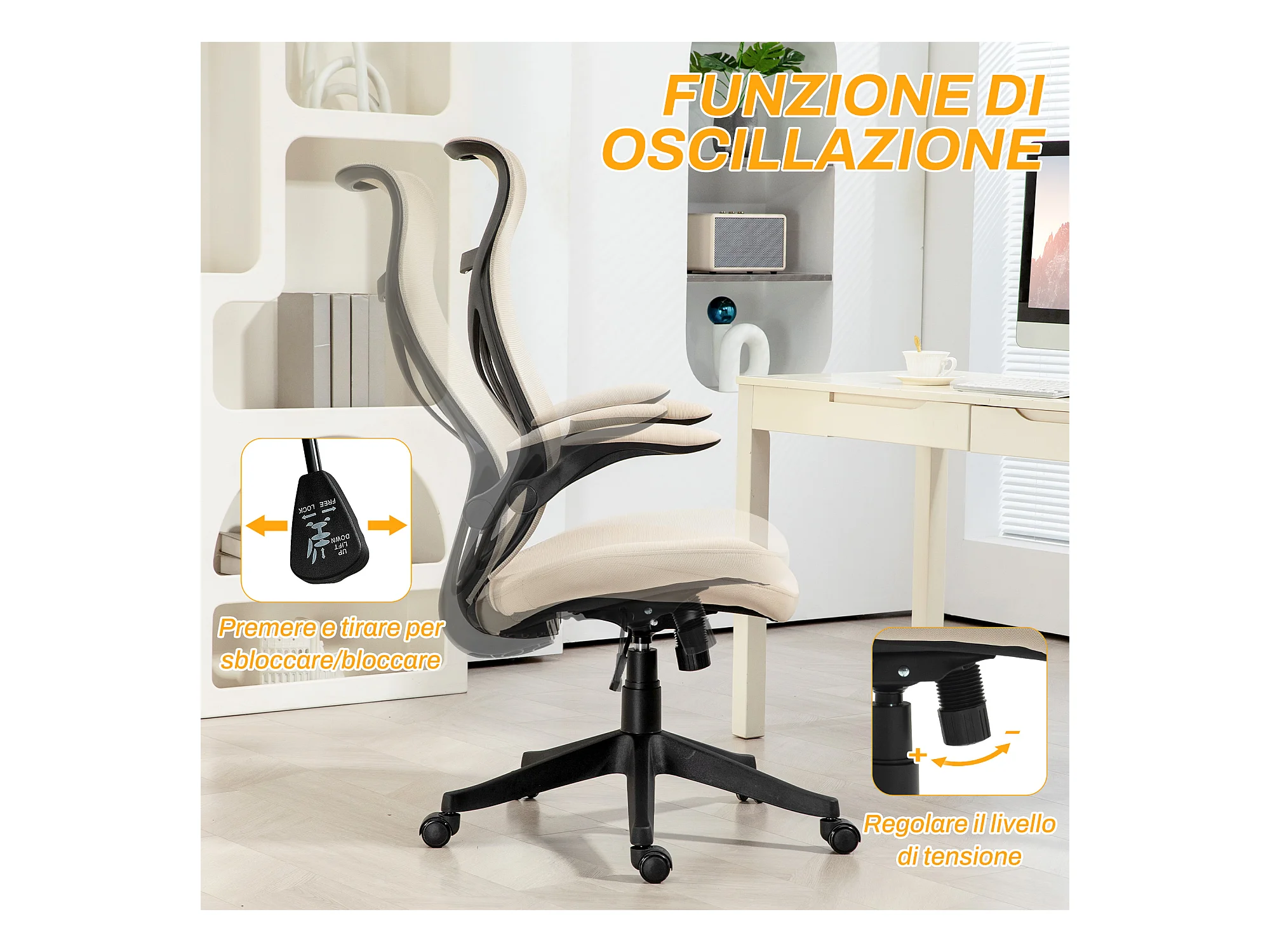 Sedia da ufficio con braccioli ribaltabili e altezza regolabile beige