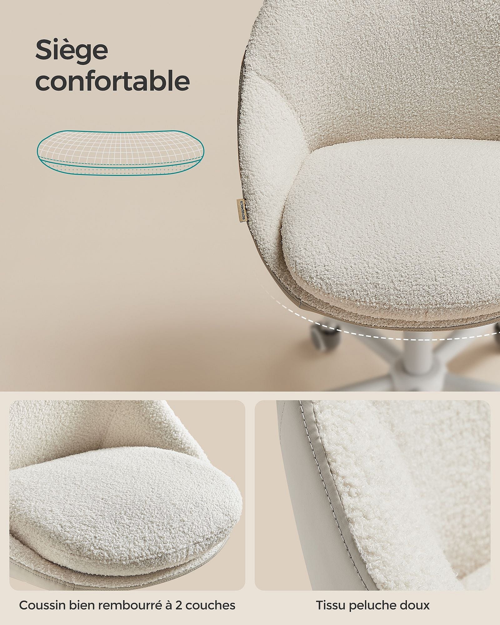 Sedia da ufficio ergonomica rembourré pivotant alta regolabile con dossier inclinabile Beige
