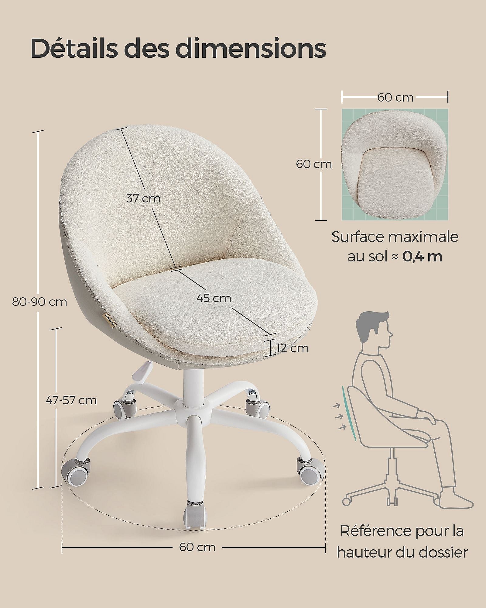 Chaise-office in tessuto ergonomico girevole regolabile beige 49x60x79-91cm salone e scrivania