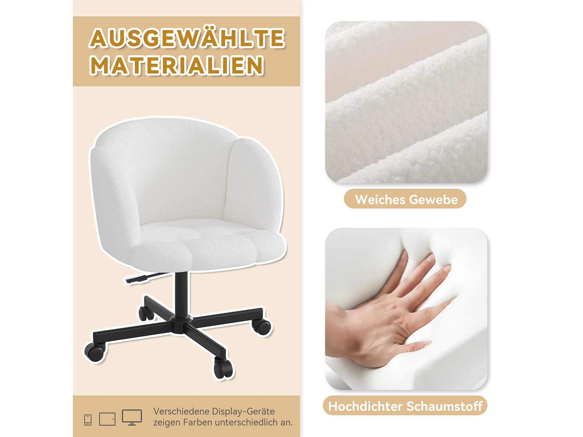 Sedia girevole da ufficio in tessuto Teddy bianco sporco - Altezza regolabile di 10 cm