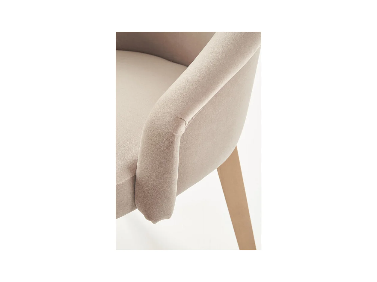 Sedia da pranzo Dora con braccioli in tessuto beige.