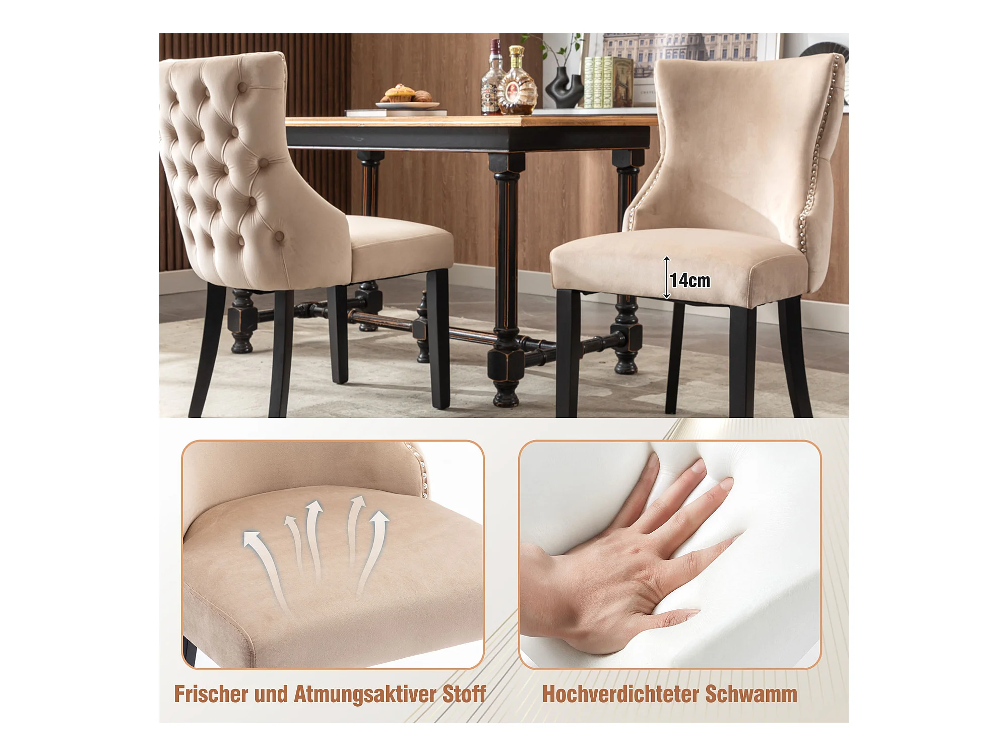 Sedia da pranzo, schienale alto in velluto beige, con lavorazione capitonné, gambe in legno massello, set da 4 (45x40x86 cm)