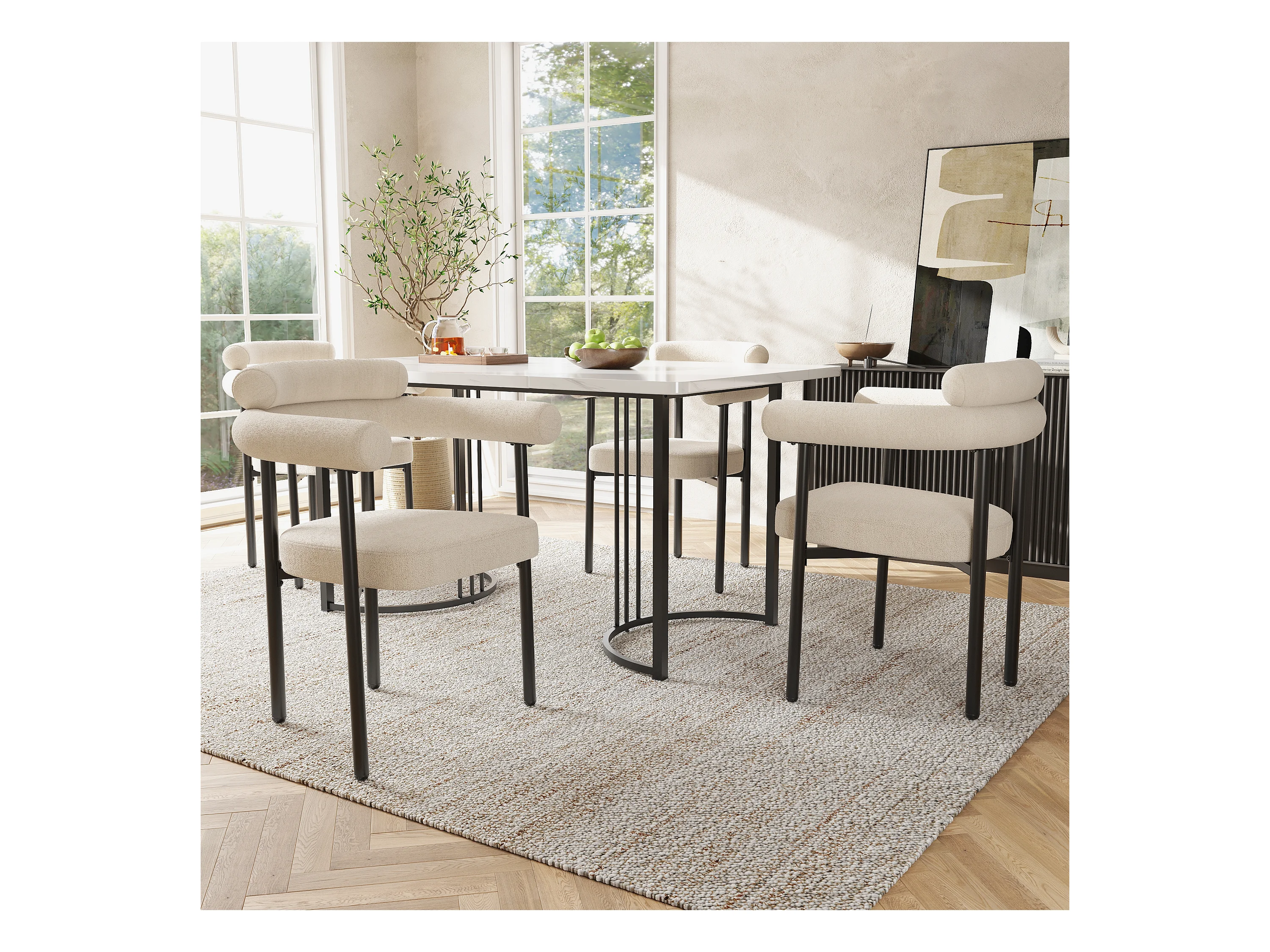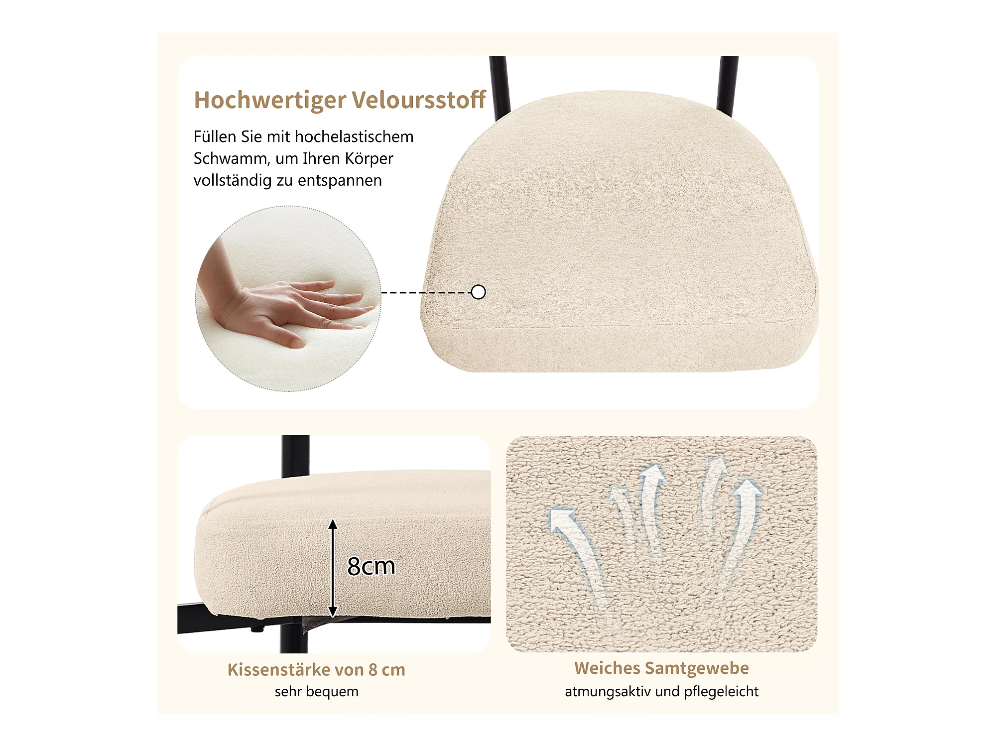 Set di 2 sedie da pranzo in tessuto felpato, imbottitura morbida, struttura in metallo, beige (44x43x84 cm)
