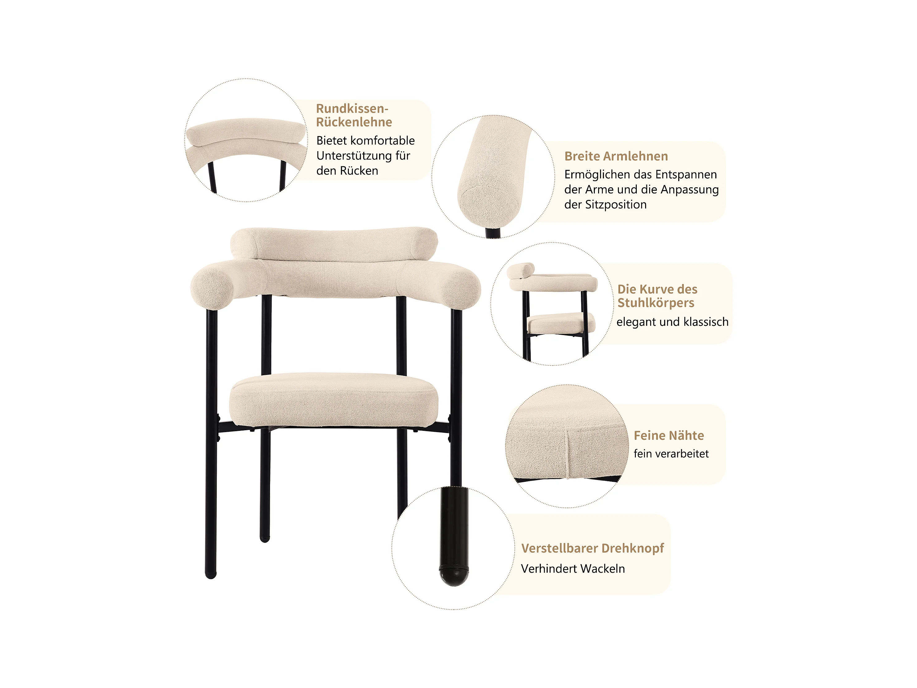 Sedia da pranzo 2 pezzi, con braccioli, tessuto di peluche di agnello, cuscino di seduta spesso, 52,5x48x83,7 cm beige