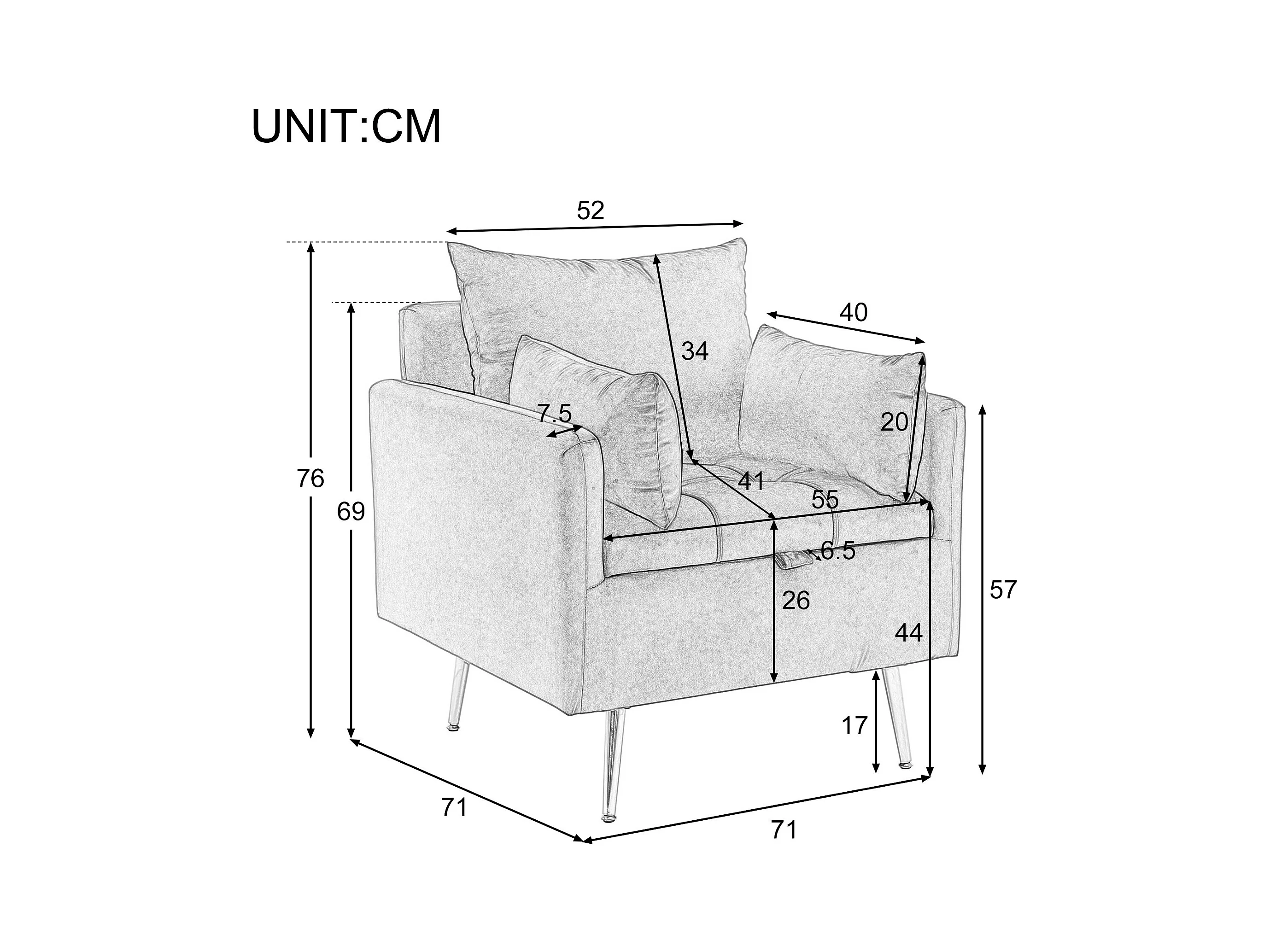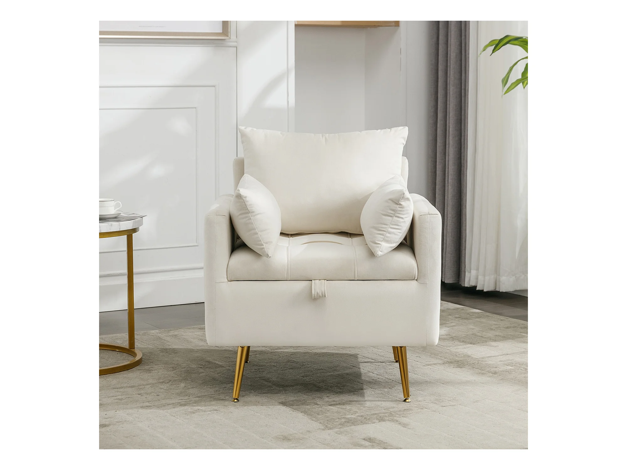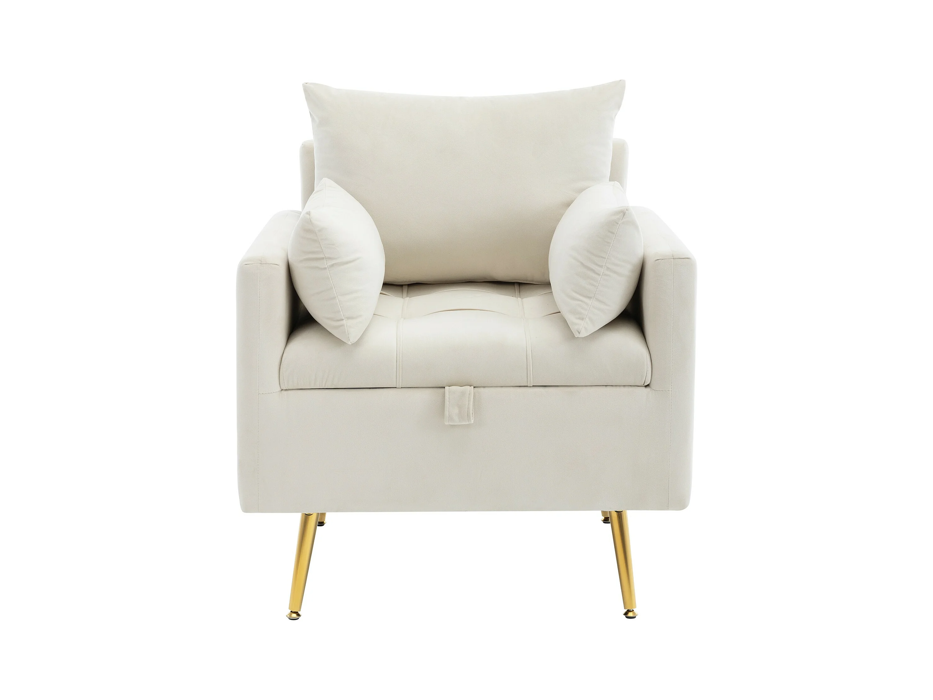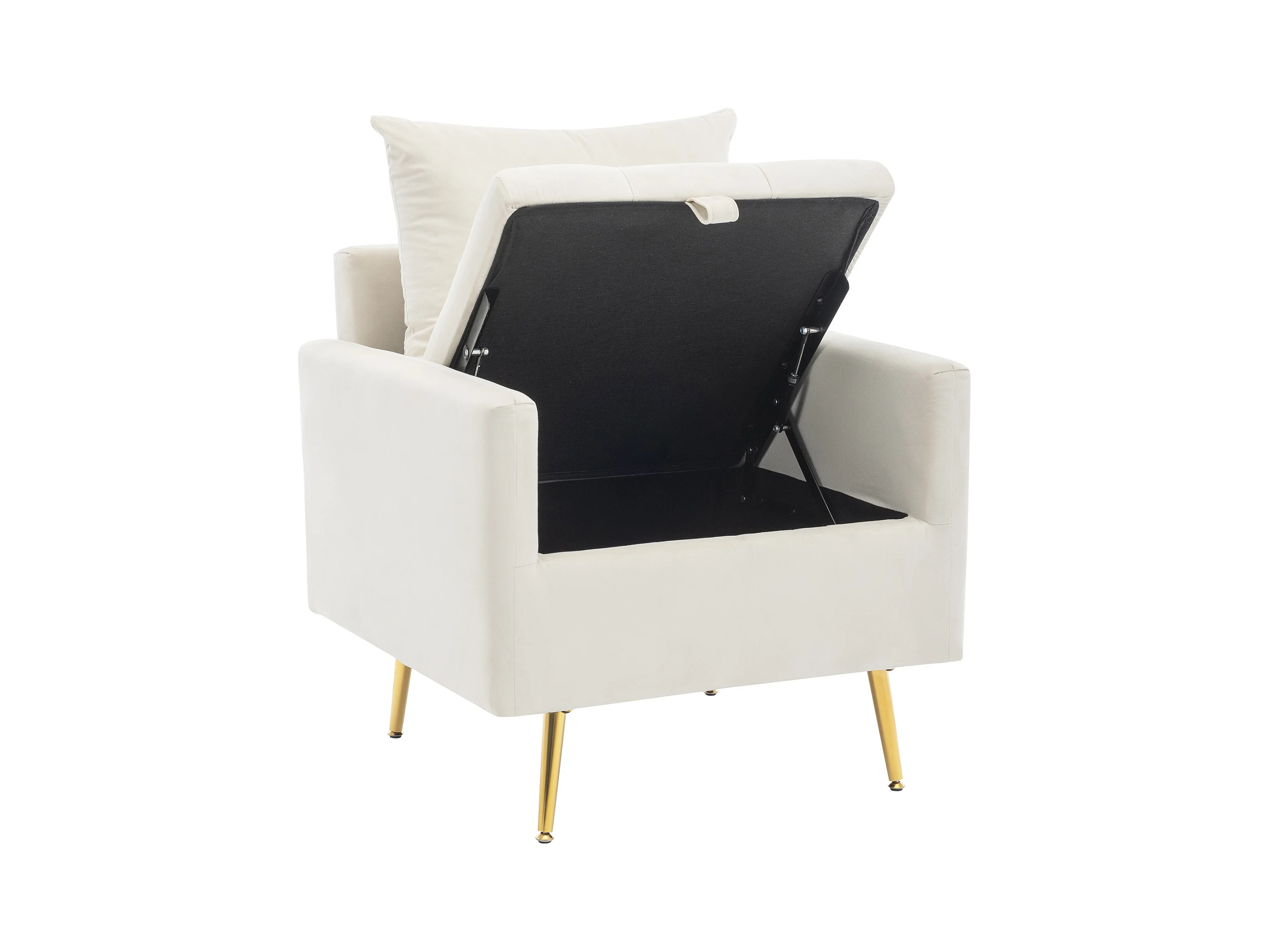 Sedia, poltrona e pouf moderni e minimalisti in velluto con contenitore, cuscini decorativi e gambe in metallo color oro