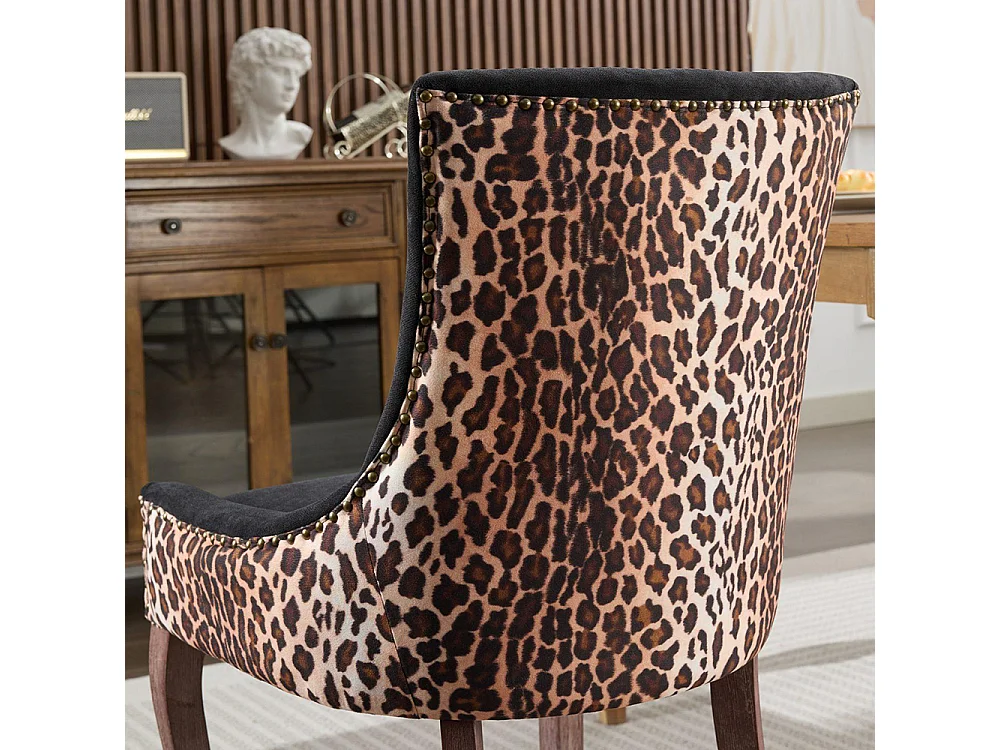 Sedie da pranzo extra larghe, sedute imbottite in tessuto, chiodini in bronzo, set di due, stampa leopardata