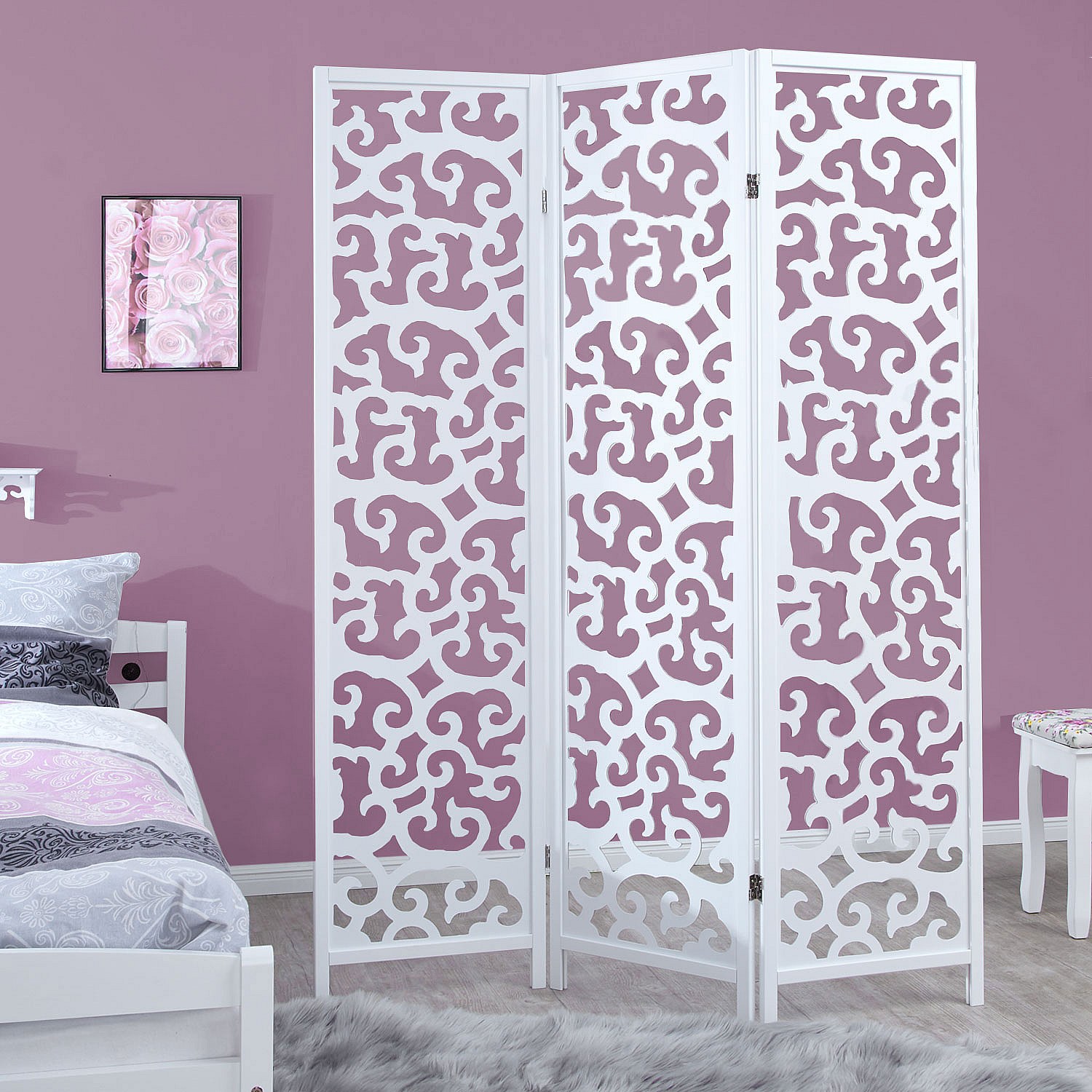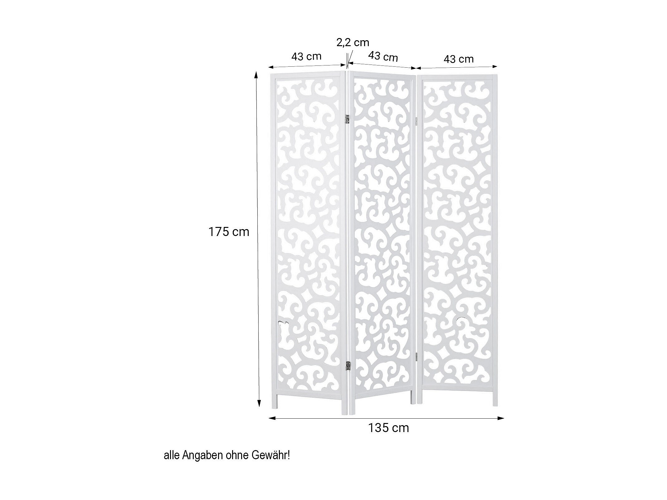 Separé 170x120x2,2 cm bianco, paravento pieghevole in legno a 3 pannelli