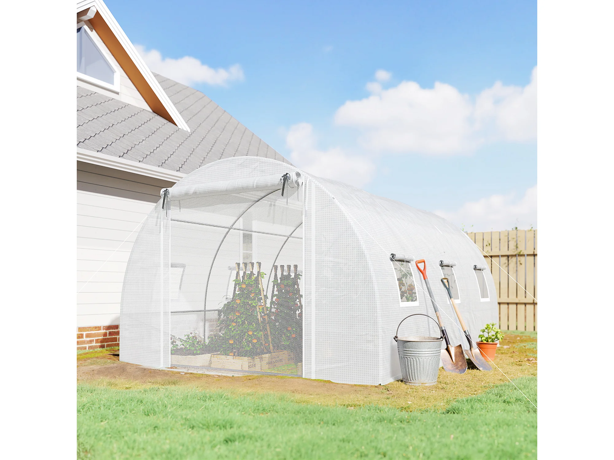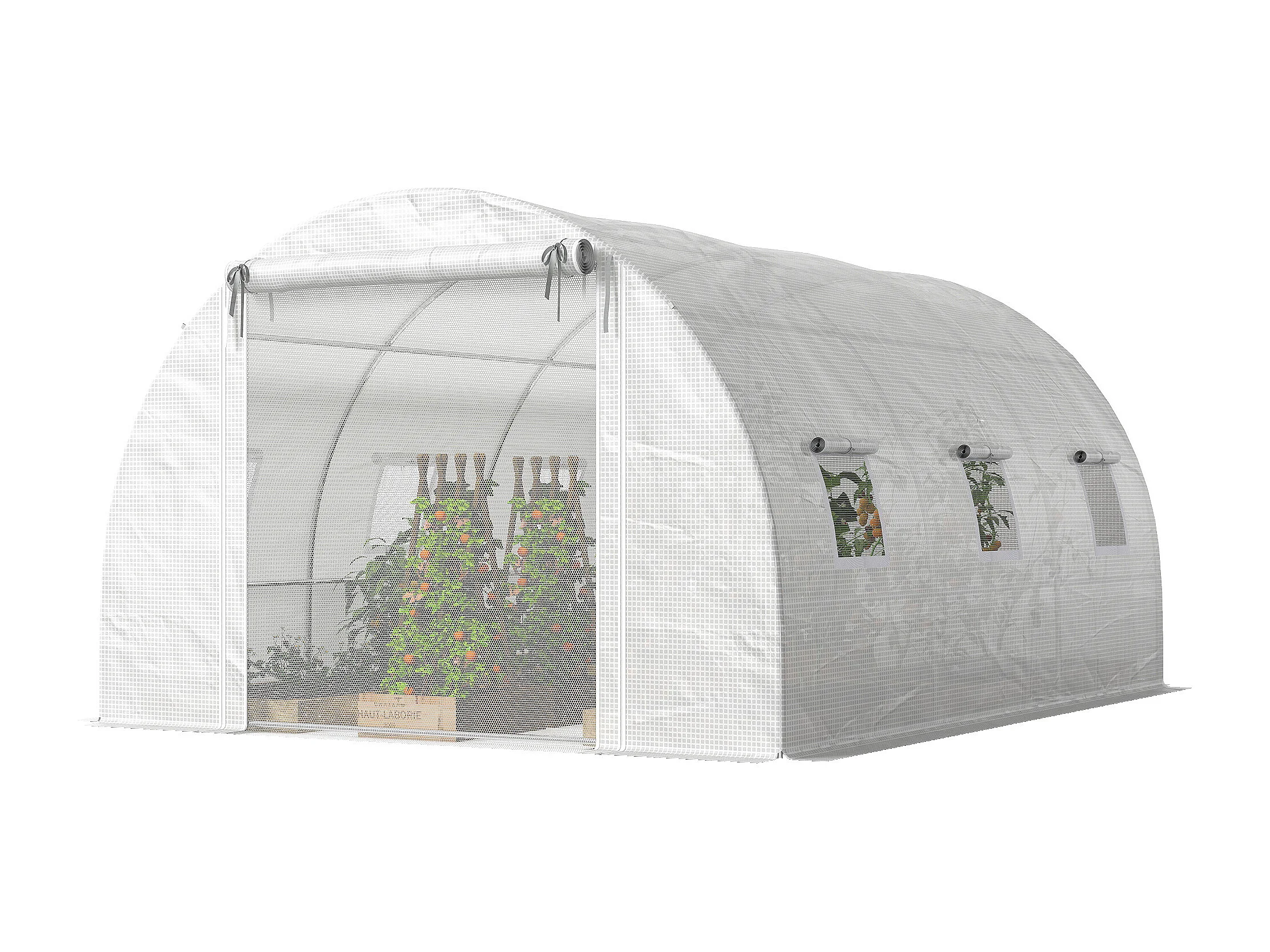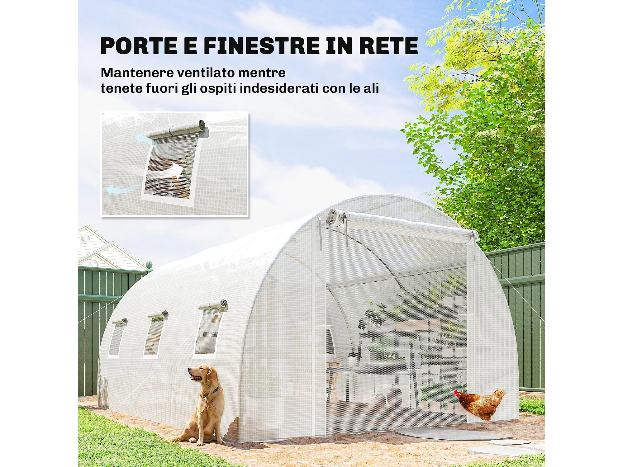 Serra a tunnel con 2 aste rimovibili e porte e finestre a rete bianco