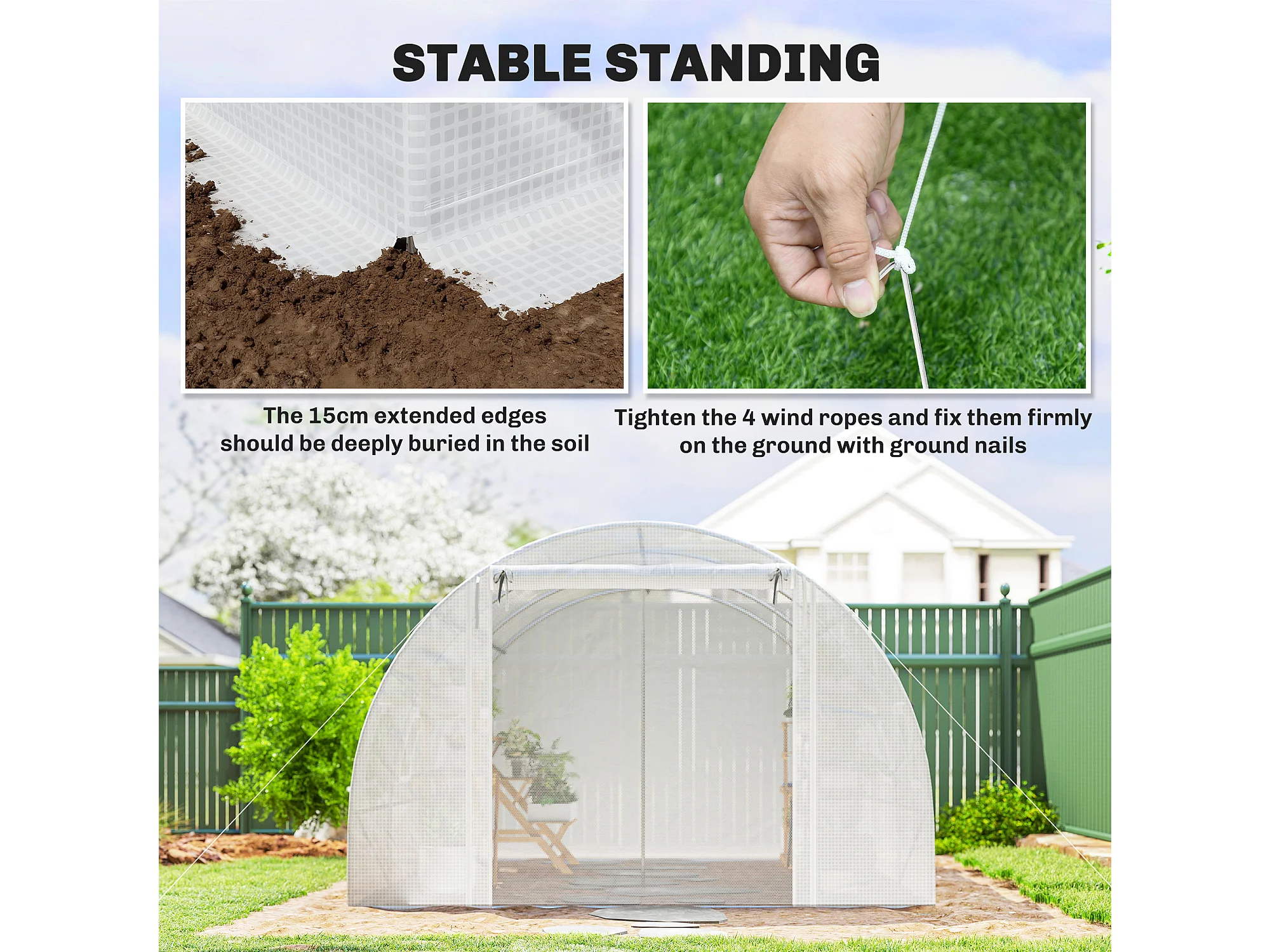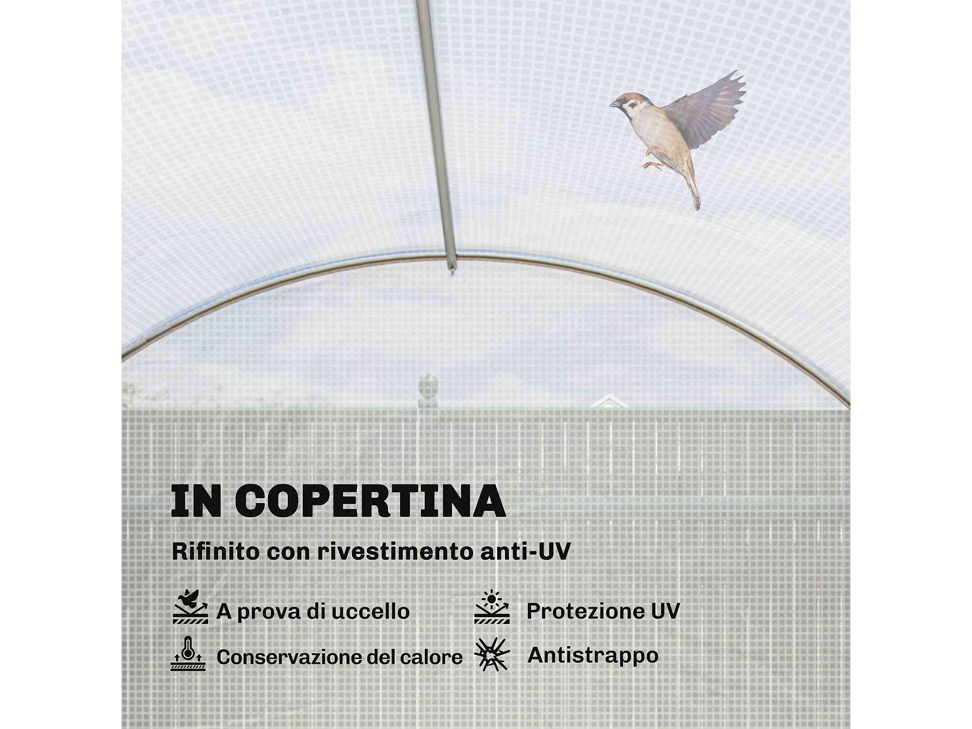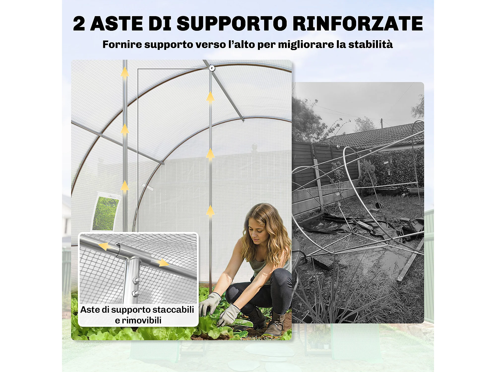 Serra a tunnel con 2 aste rimovibili e porte e finestre a rete bianco