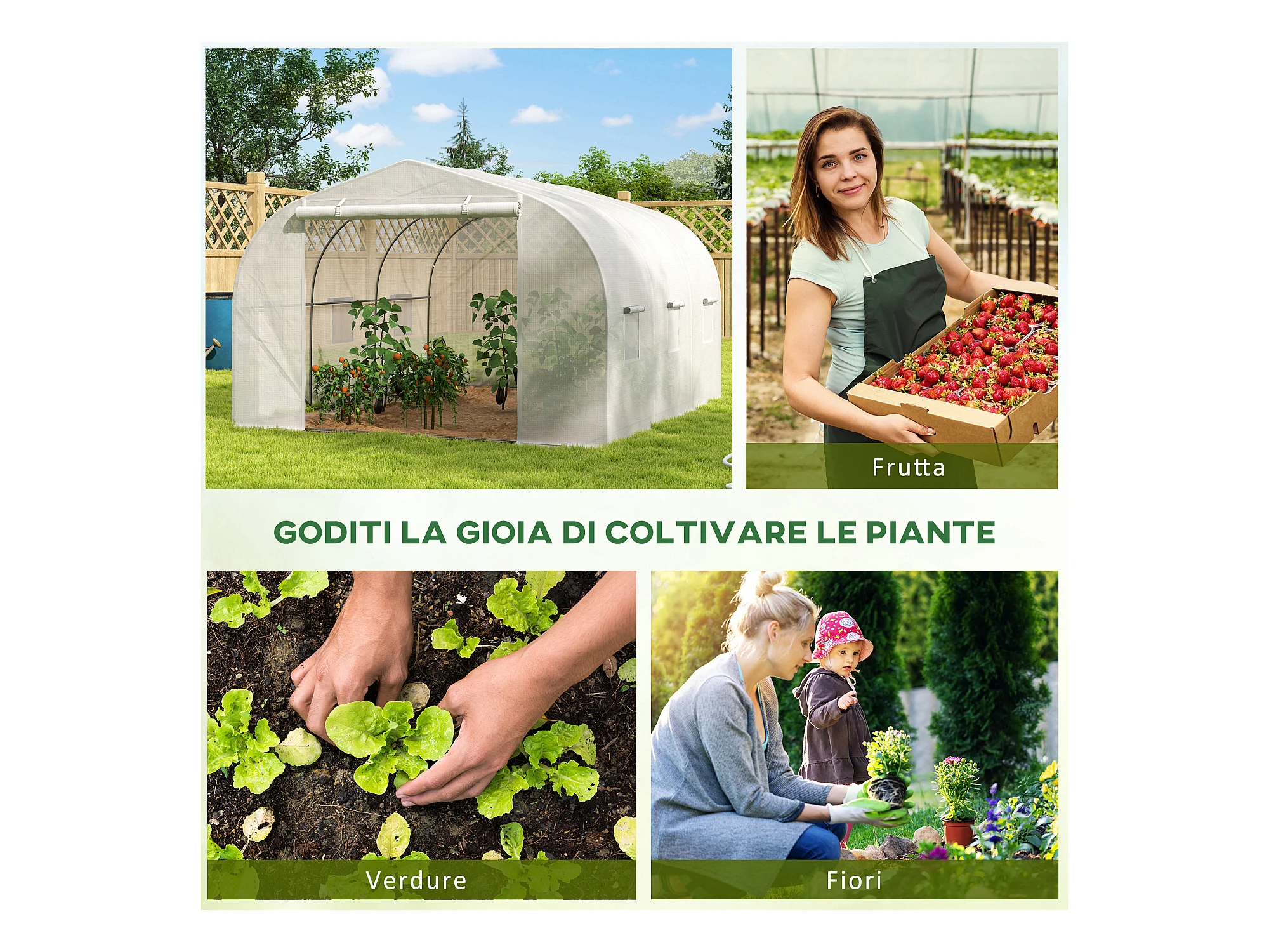 Serra per orto con 8 finestre e porta avvolgibile verde