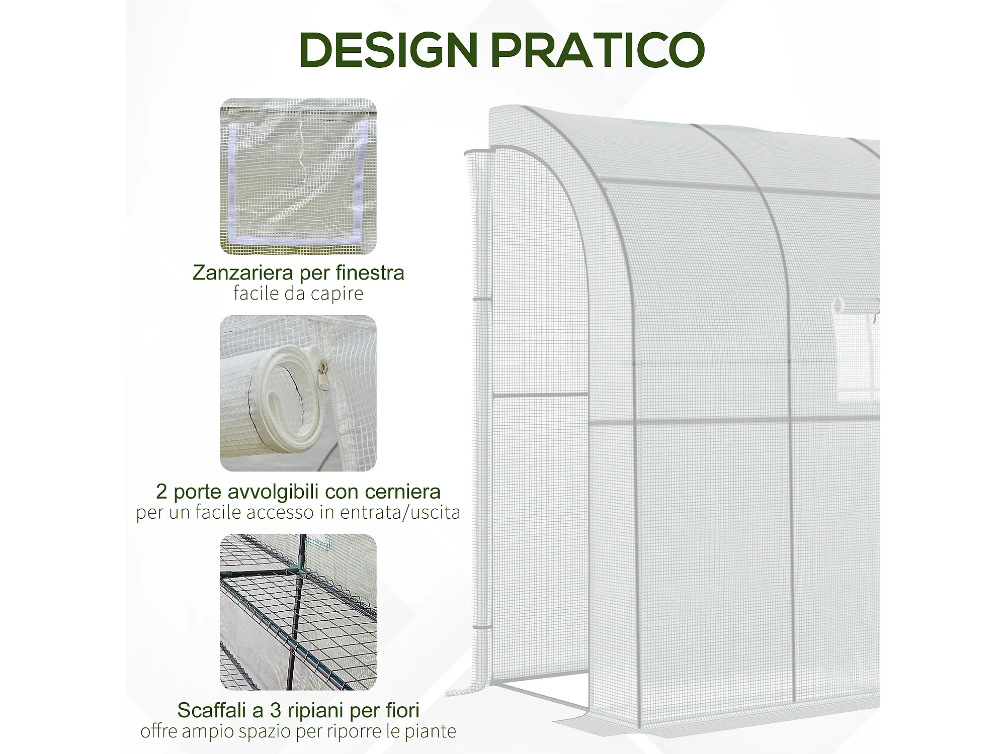 Serra addossata a 3 livelli con porte e finestre a zip verde e bianco