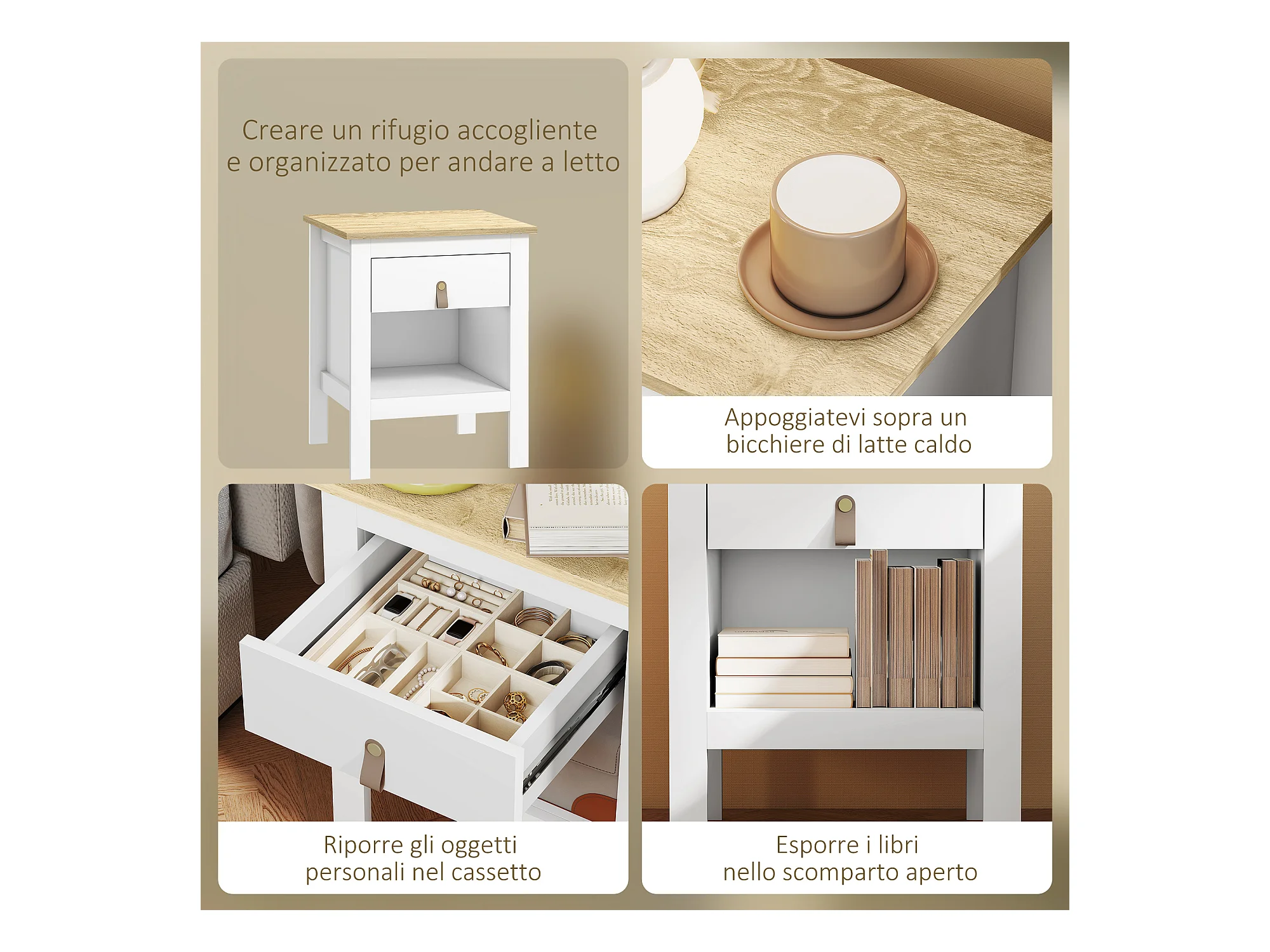 Comodino moderno bianco con un cassetto e 2 ripiani