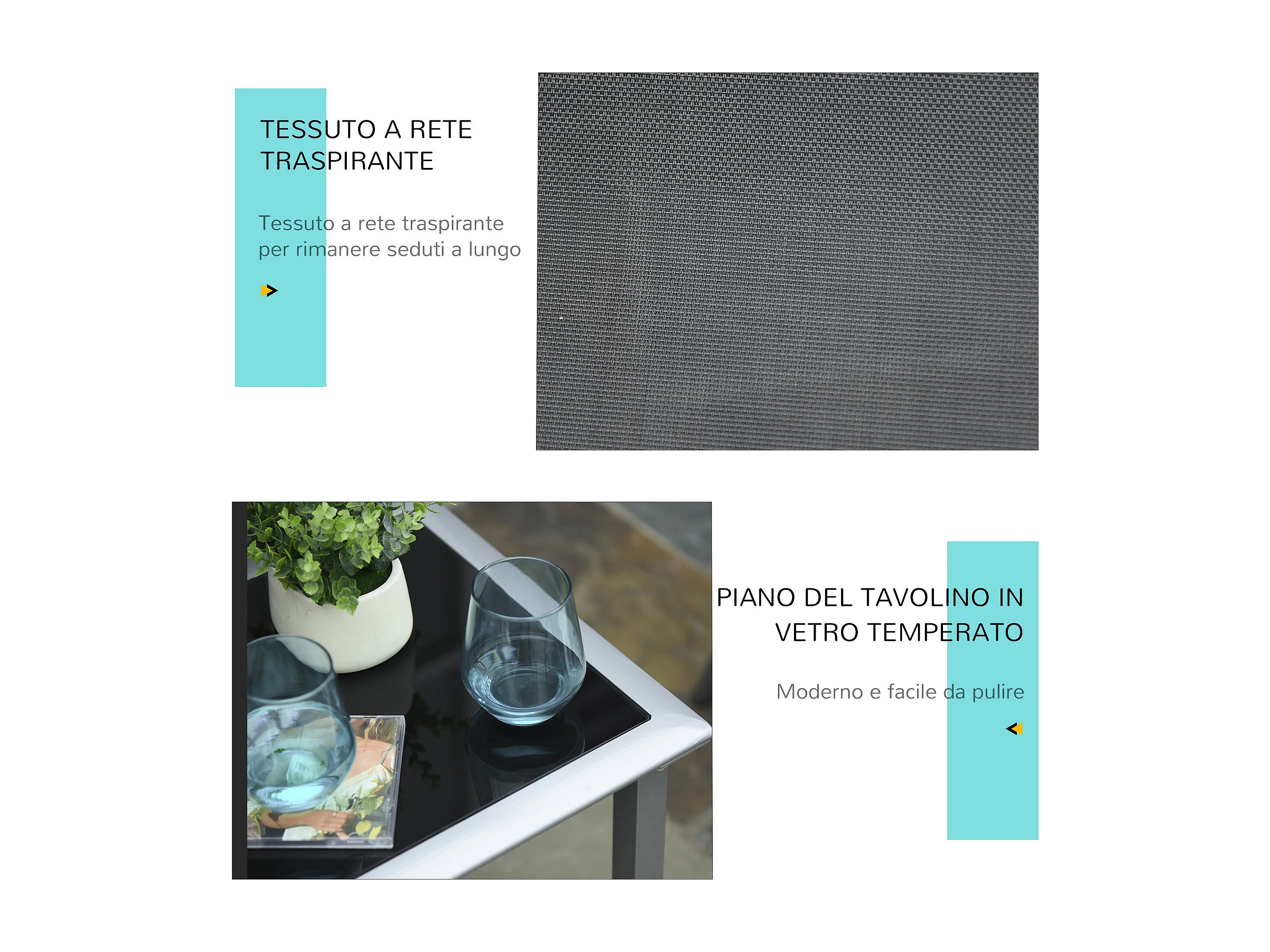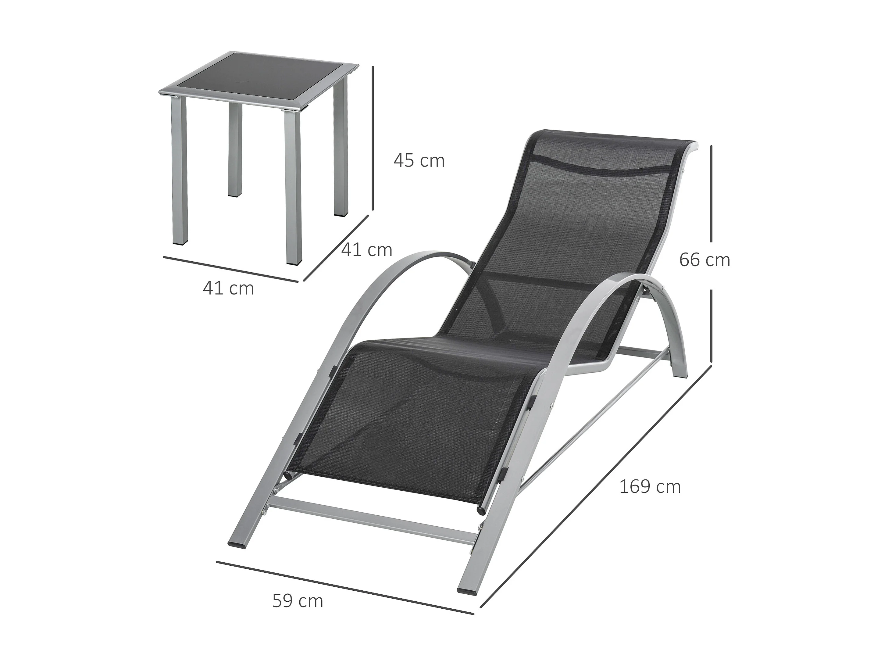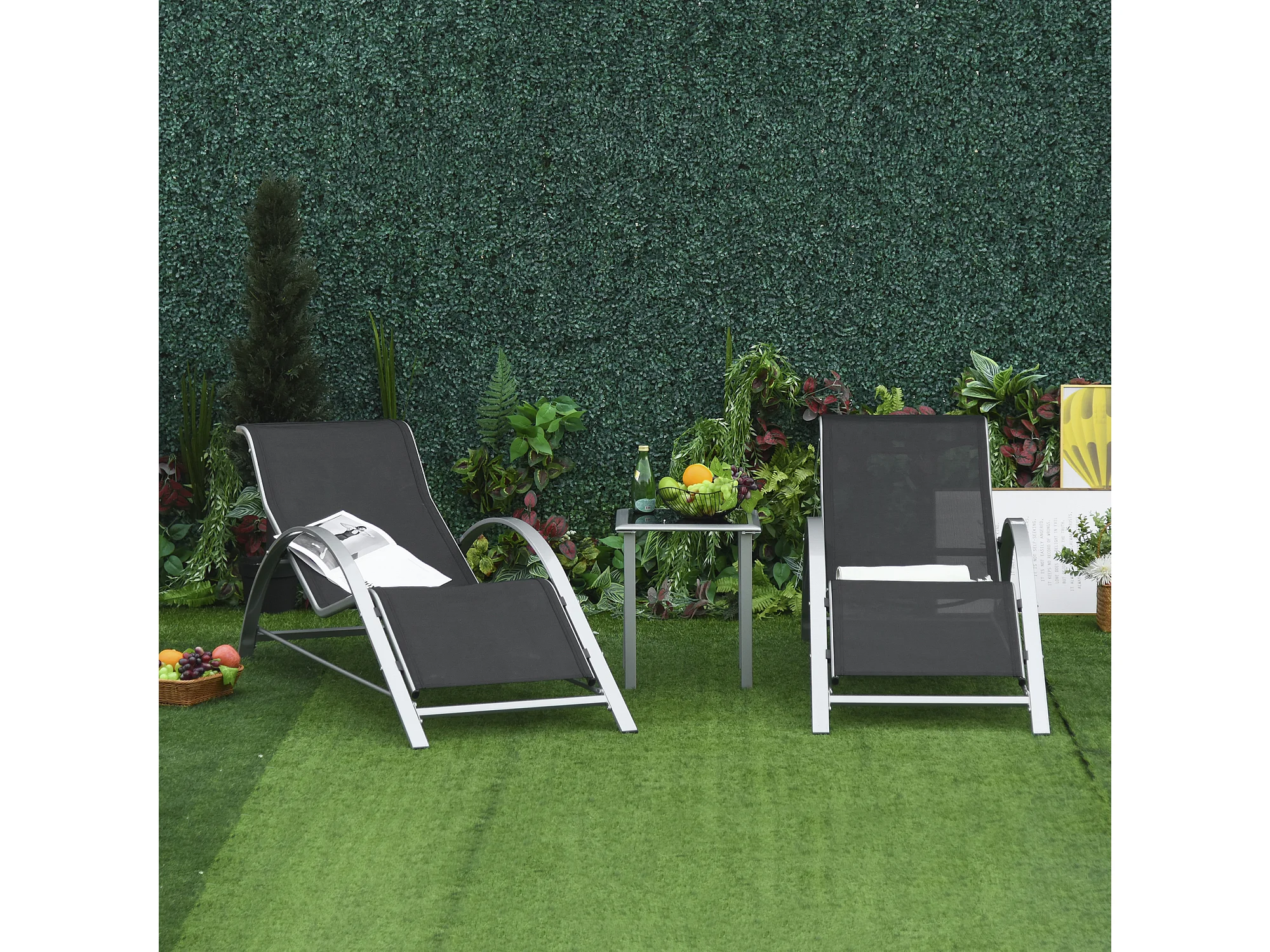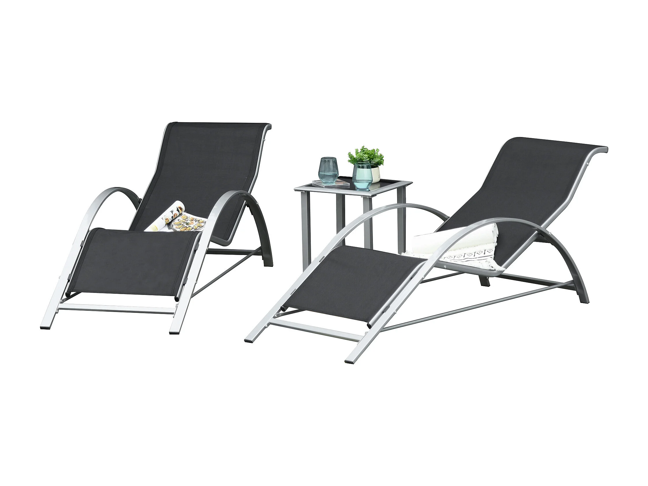 Set 2 Sdraio da Giardino con Tavolino in Vetro e Seduta in Tessuto Traspirante