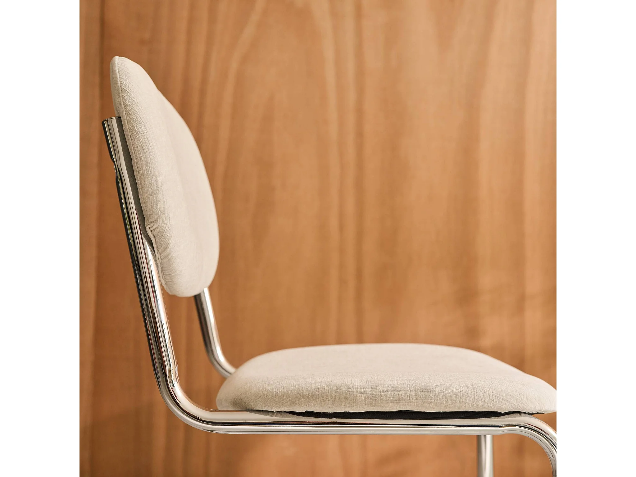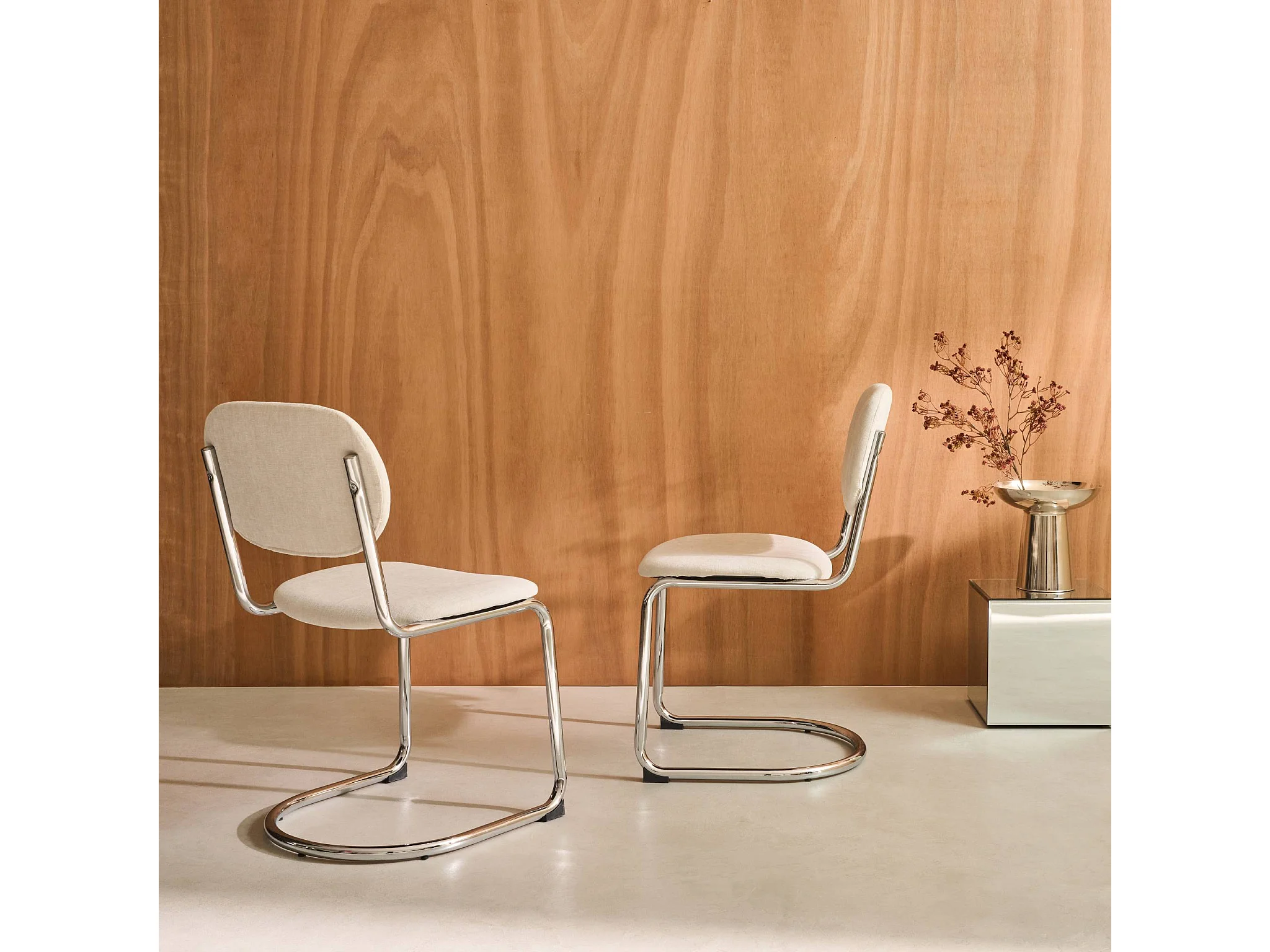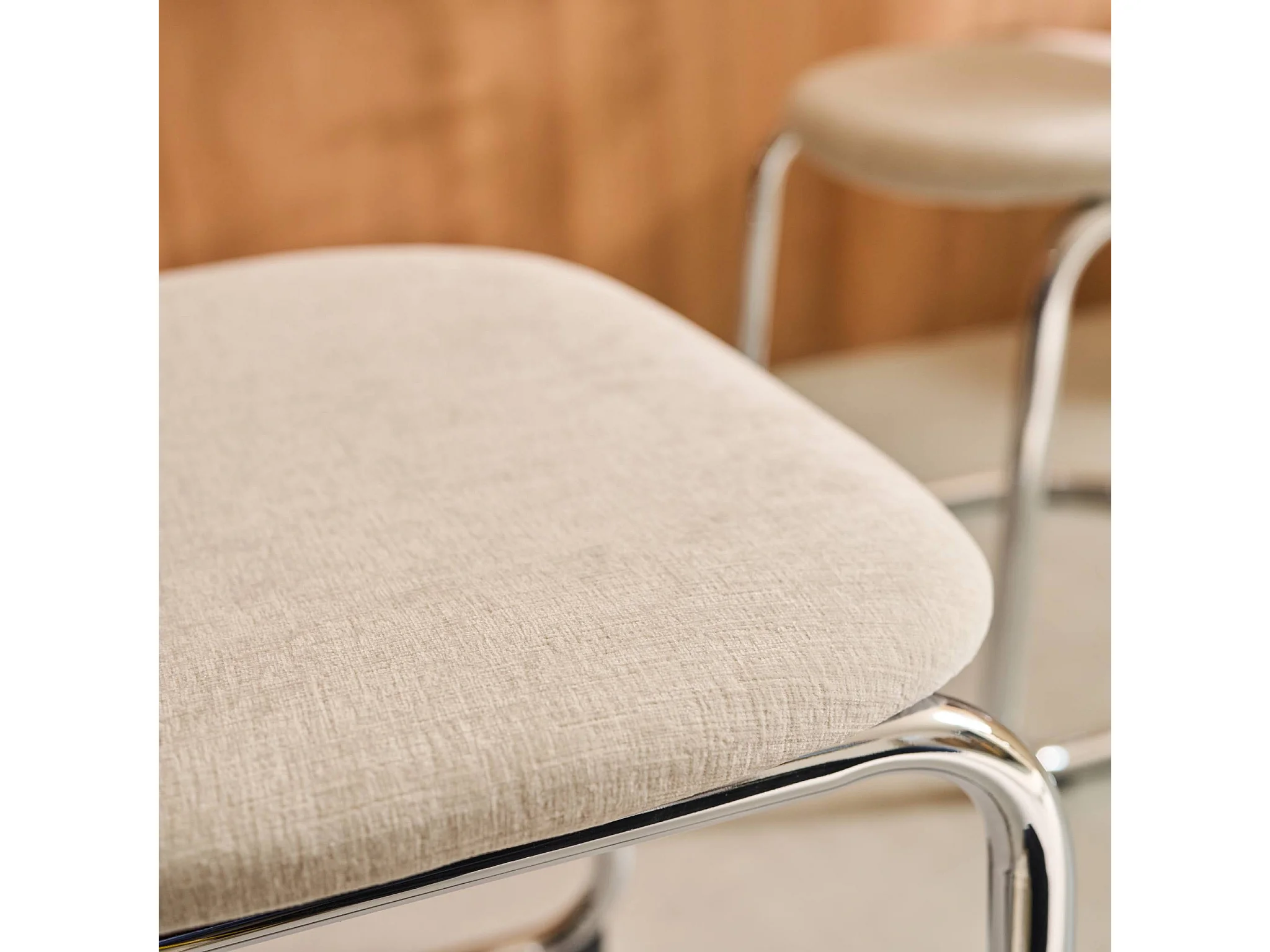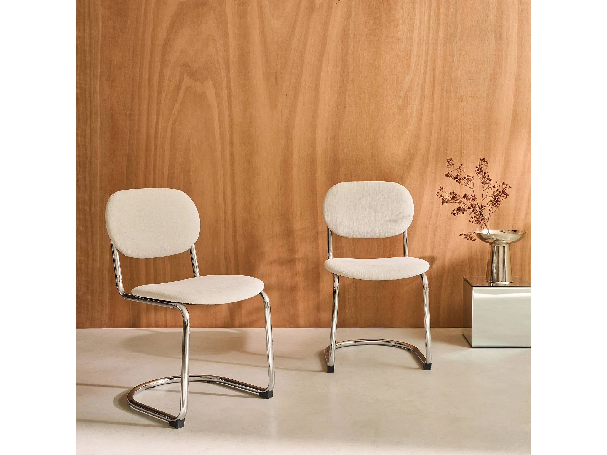 Set 2 sedie arrotondate metallo, tessuto ciniglia e gambe cromate,