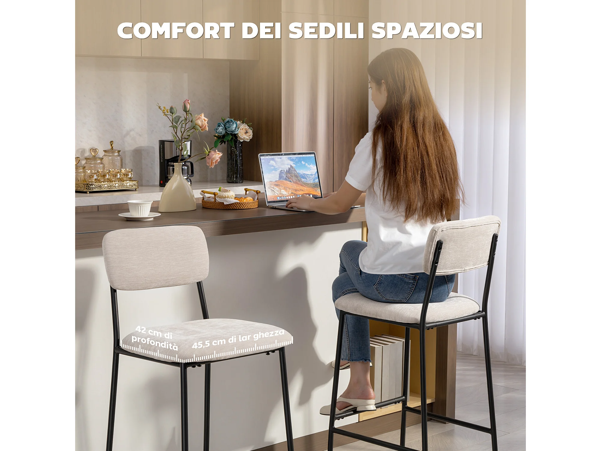 Set 2 sgabelli bar con schienale alto e poggiapiedi in ciniglia crema