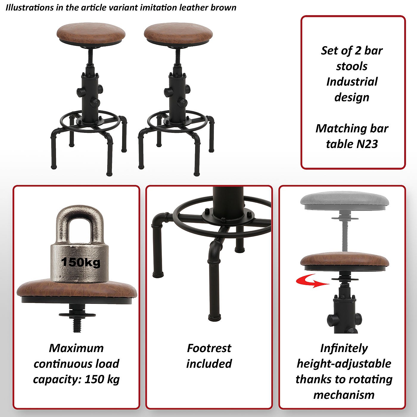 Set 2 sgabelli da bar MCW-N23, regolabile in altezza poggiapiedi girevole acciaio industriale ecopelle ~ marrone nero