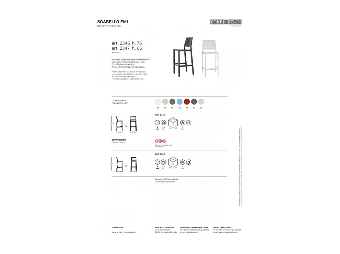 SET 4 SGABELLI EMI TECNOPOLIMERO HT 65CM MADE IN ITALY SCAB DESIGN - Lino 11