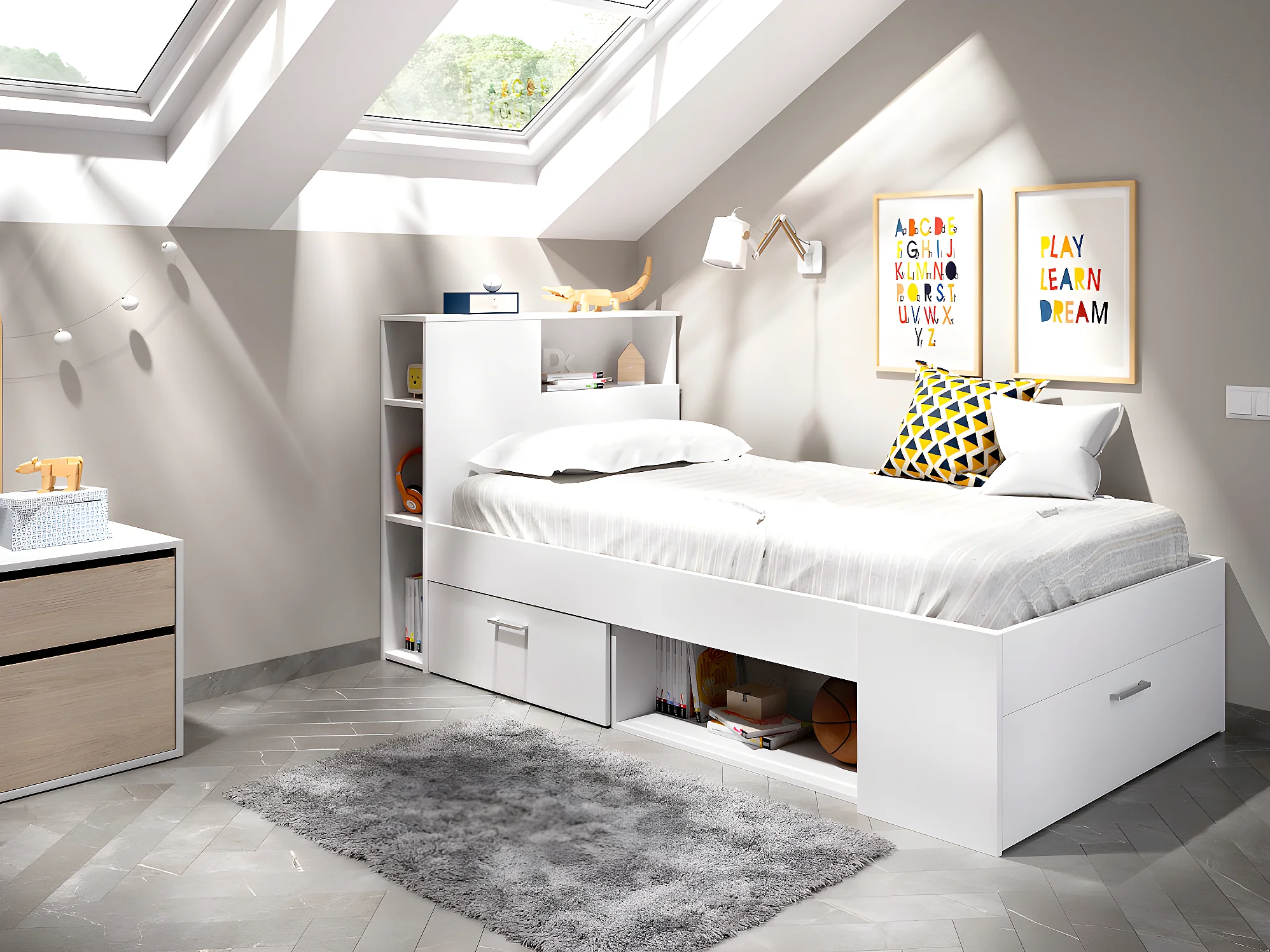 Set letto con vani 90 x 190 cm Bianco + Materasso + Rete + Cuscino + Piumone - LEANDRE