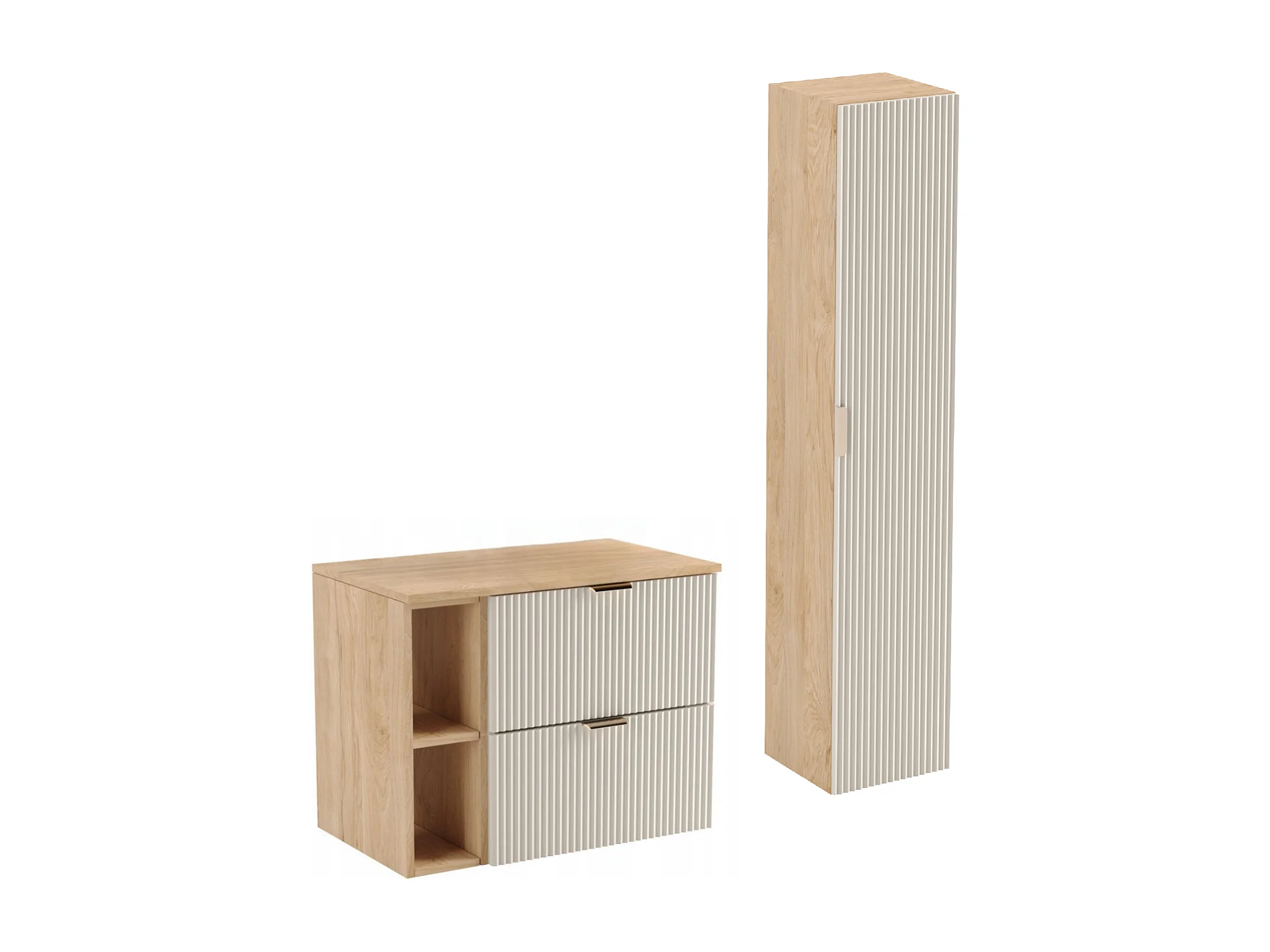 Set da bagno 80 cm Mobile Lavabo Scaffale Colonna Frontali scanalati Cashmere / Rovere Noce