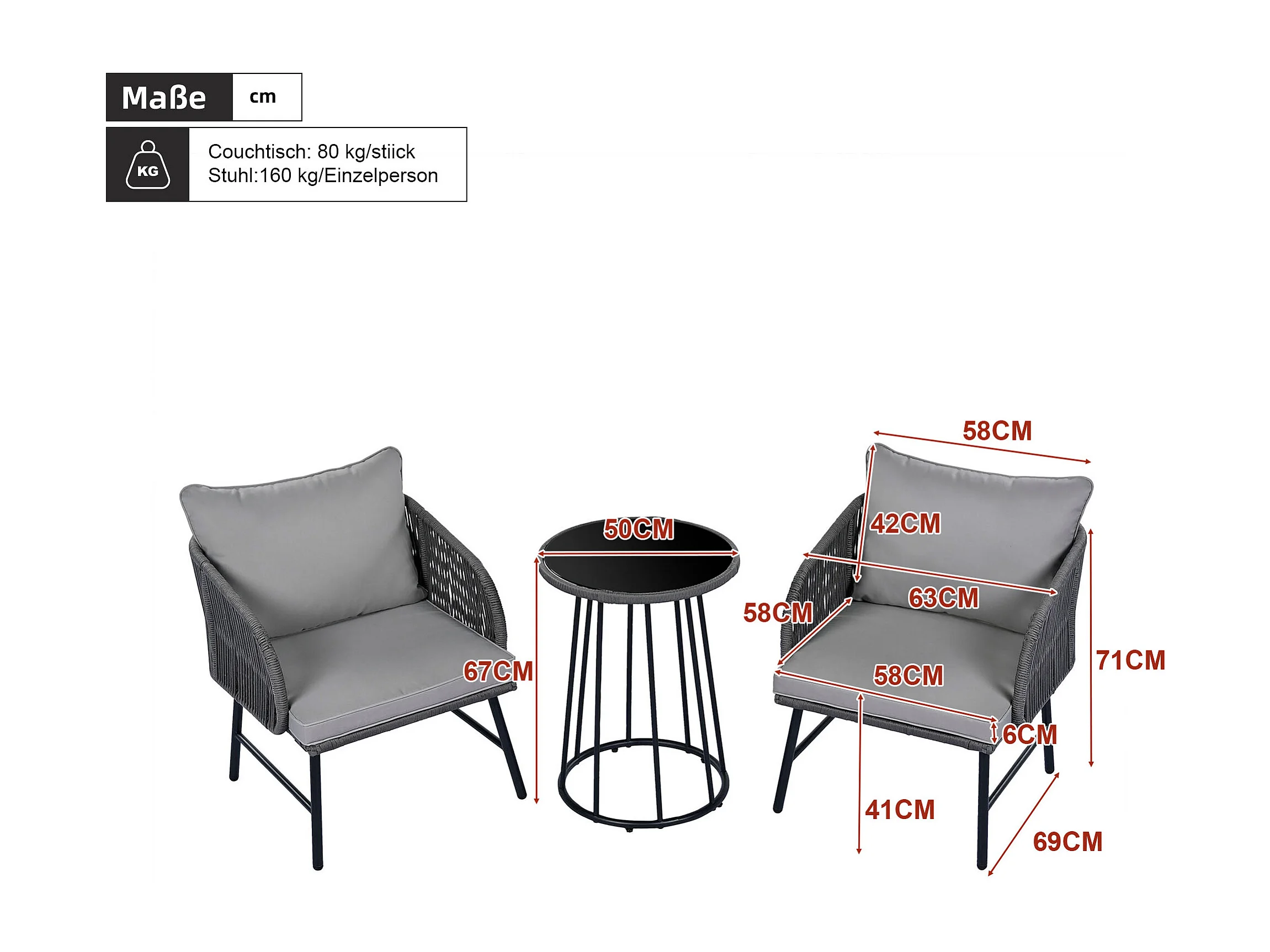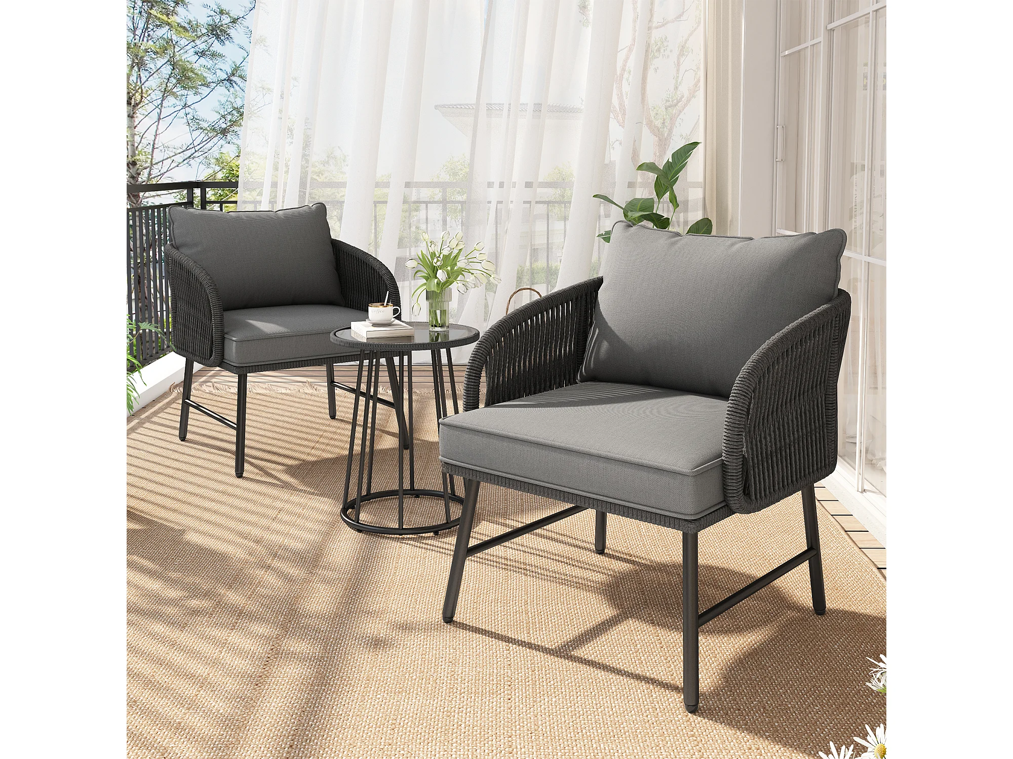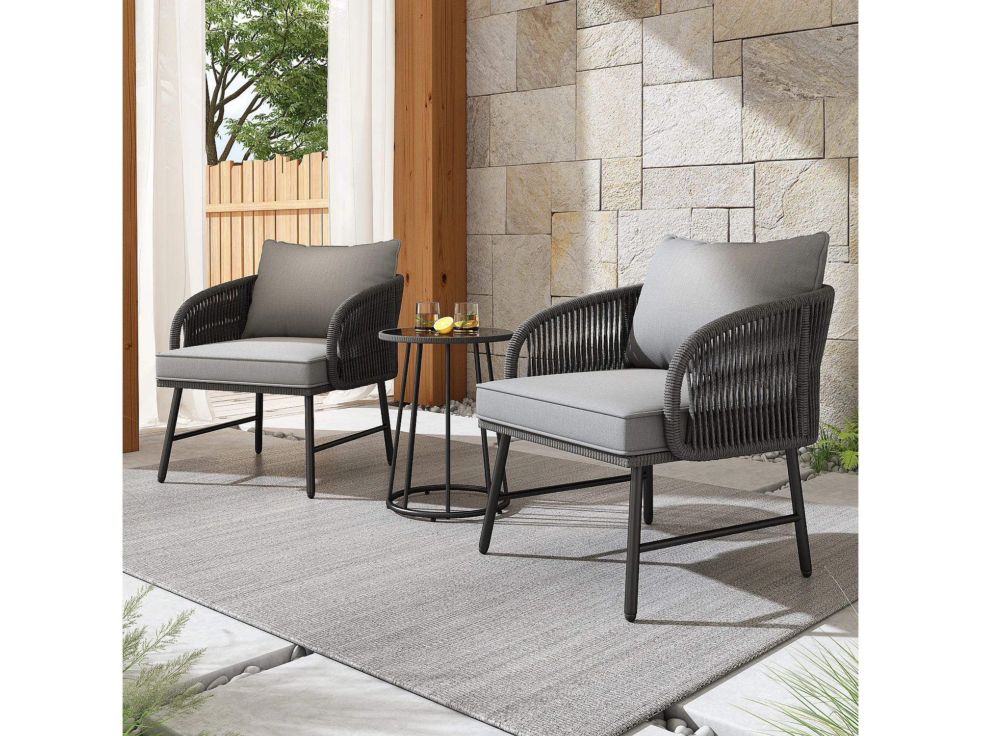 Set da bar da giardino 3 pezzi - tavolo e 2 sedie - piano in vetro - grigio