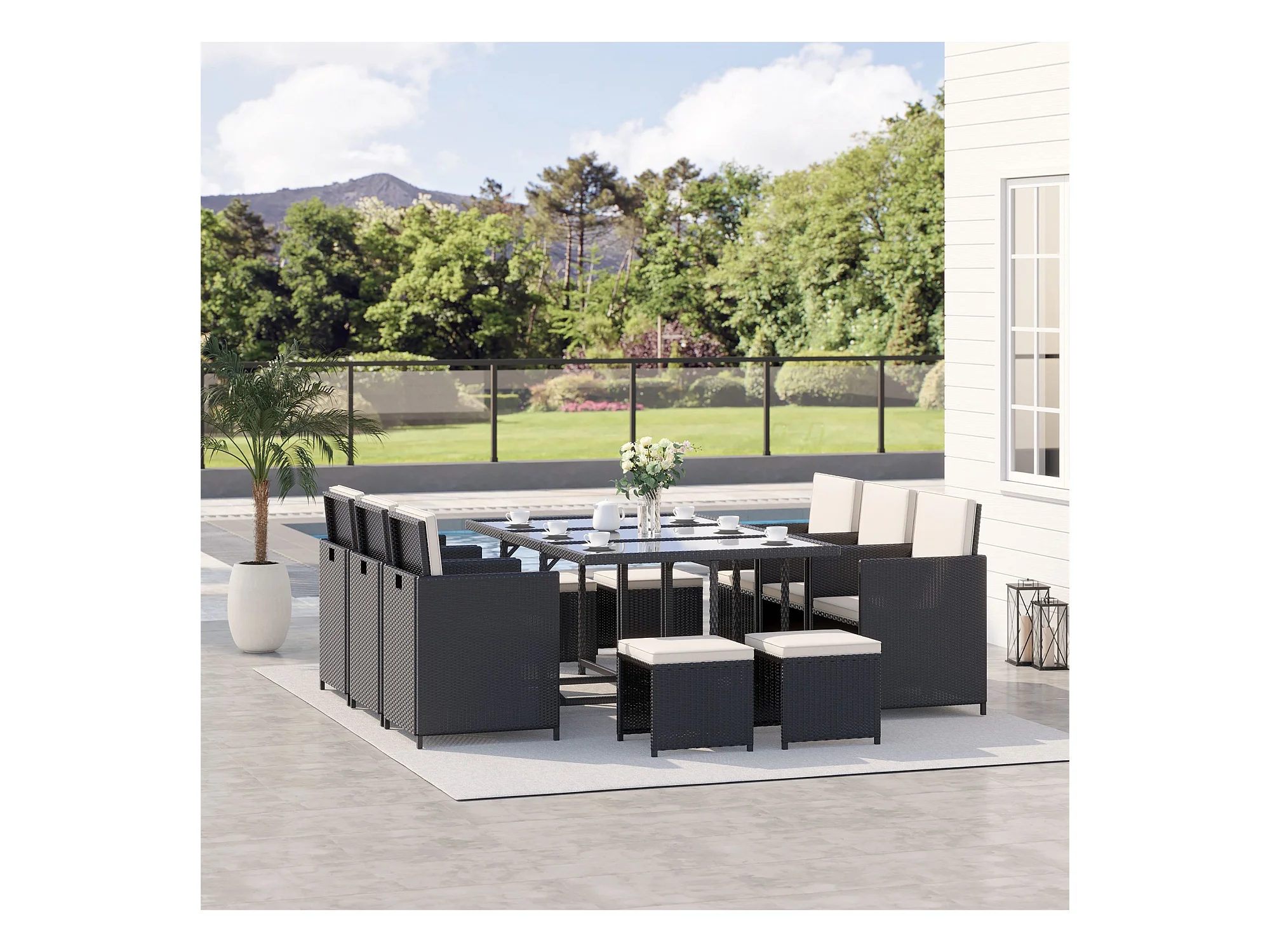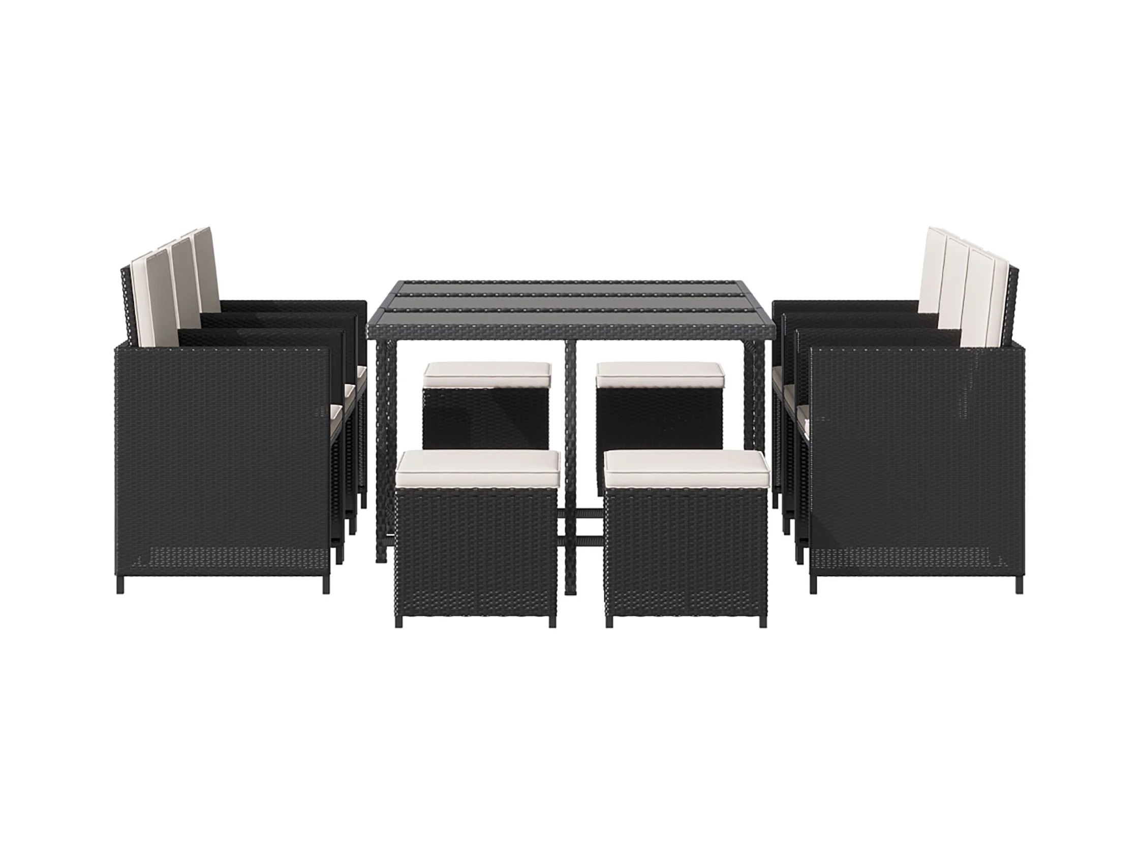 Set da giardino con tavolo 6 sedie e 4 sgabelli con cuscini nero