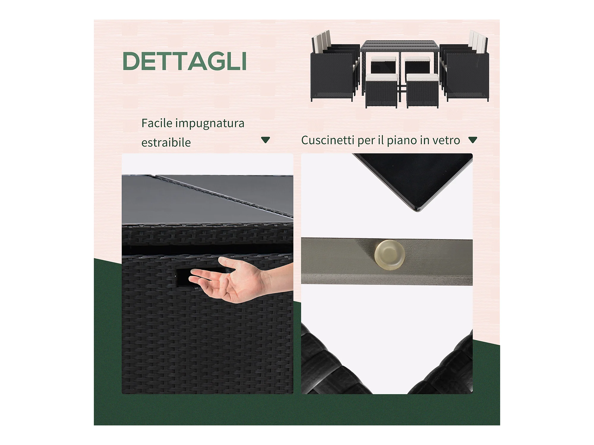 Set mobili da giardino con tavolo e 4 sedie imbottite salvaspazio