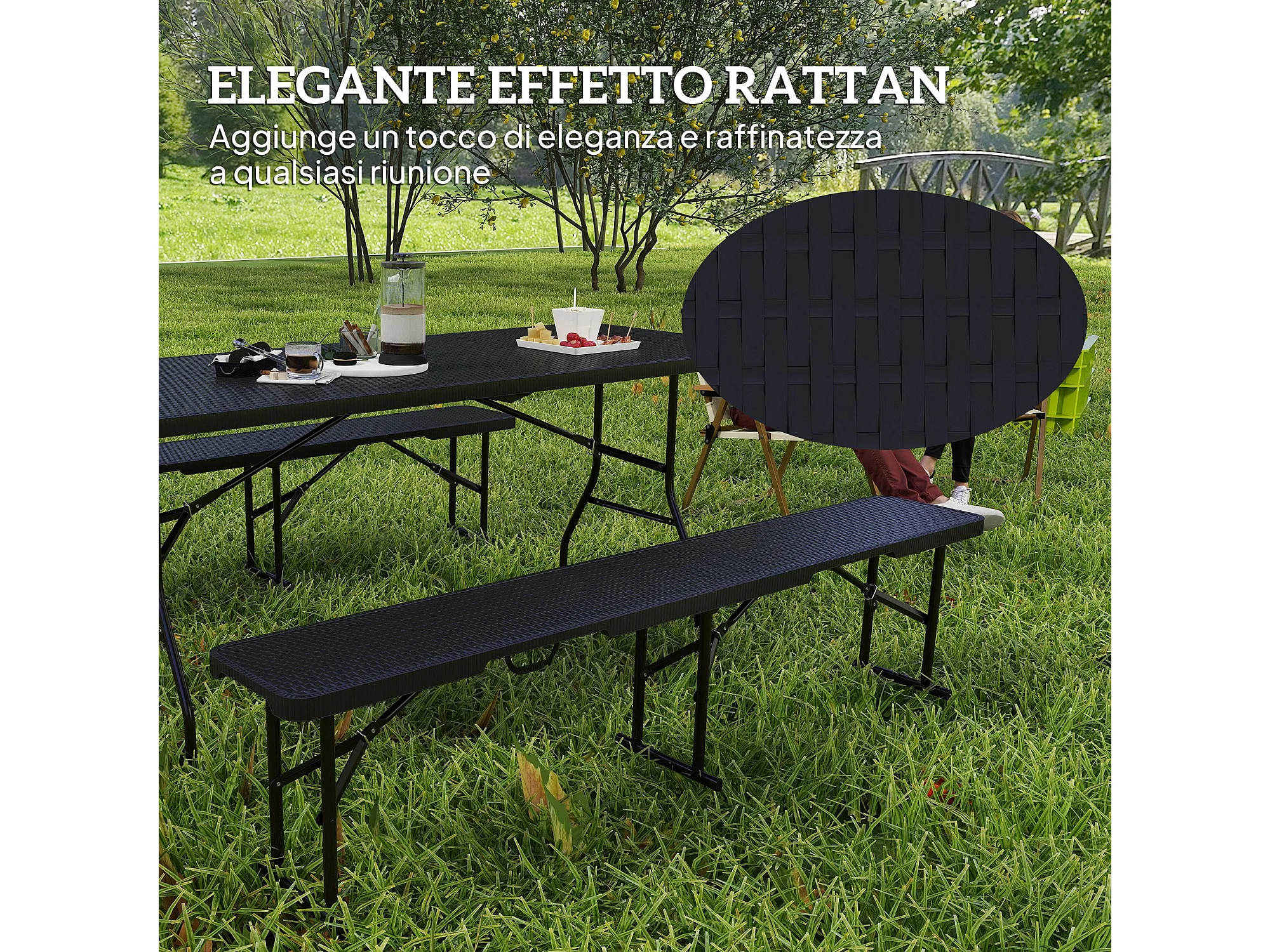 Set da pic nic pieghevole a 3 pezzi con tavolo e 2 panche nero