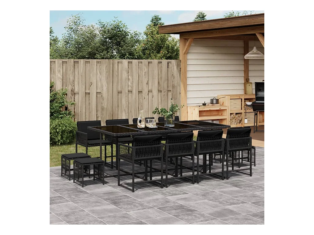 Set da Pranzo da Giardino 13pz con Cuscini Nero in Polyrattan