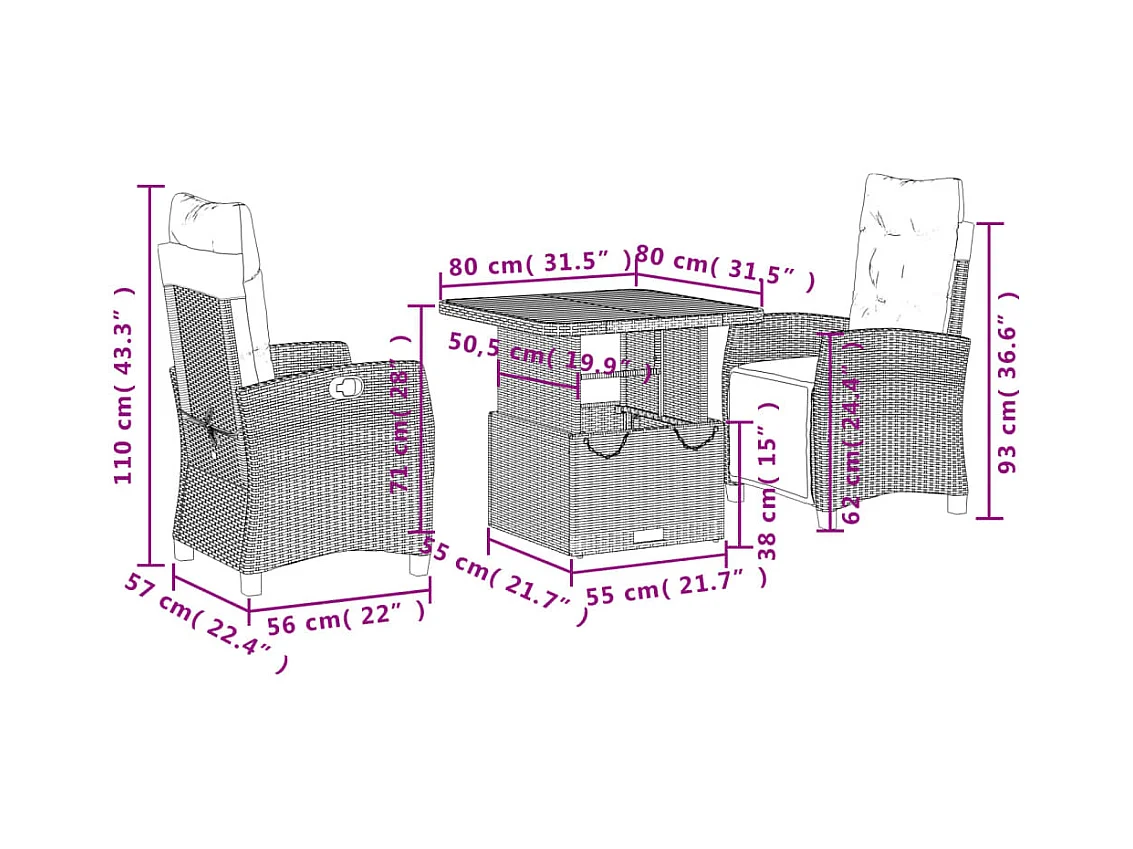 Set da Pranzo da Giardino 3 pz con Cuscini Nero in Polyrattan