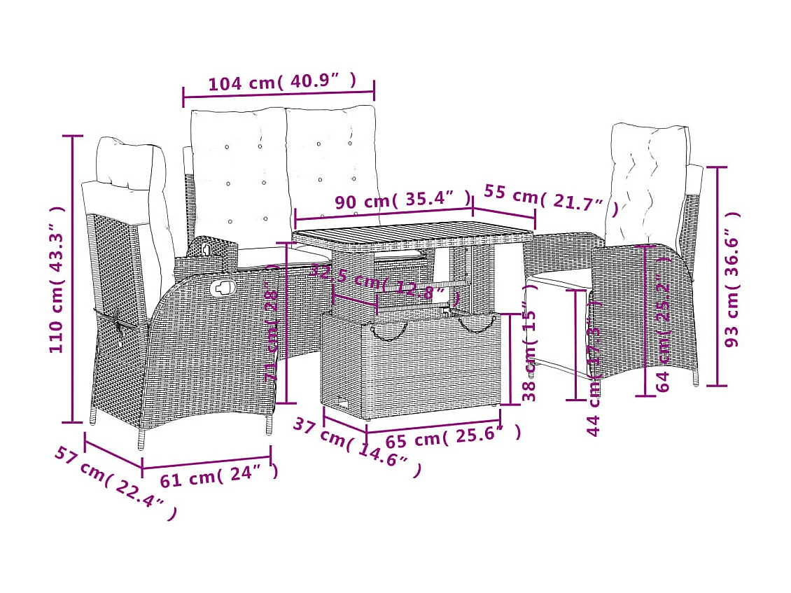 Set da Pranzo da Giardino 4 pz con Cuscini Nero in Polyrattan