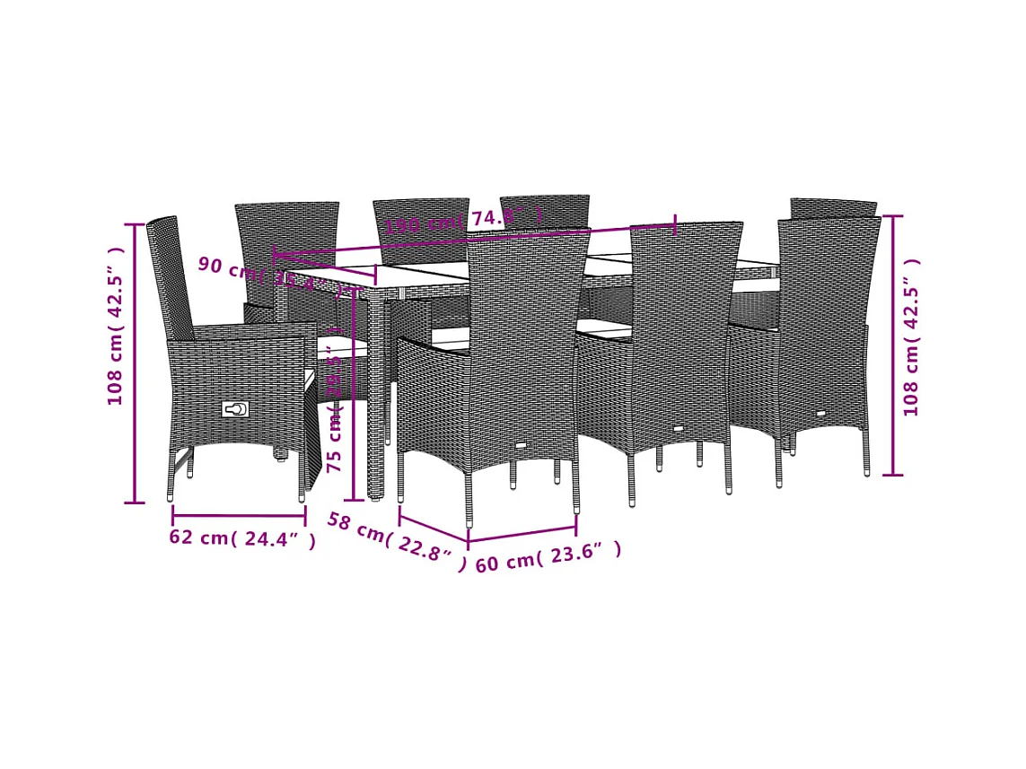 Set da Pranzo da Giardino 9 pz con Cuscini Polyrattan e Vetro