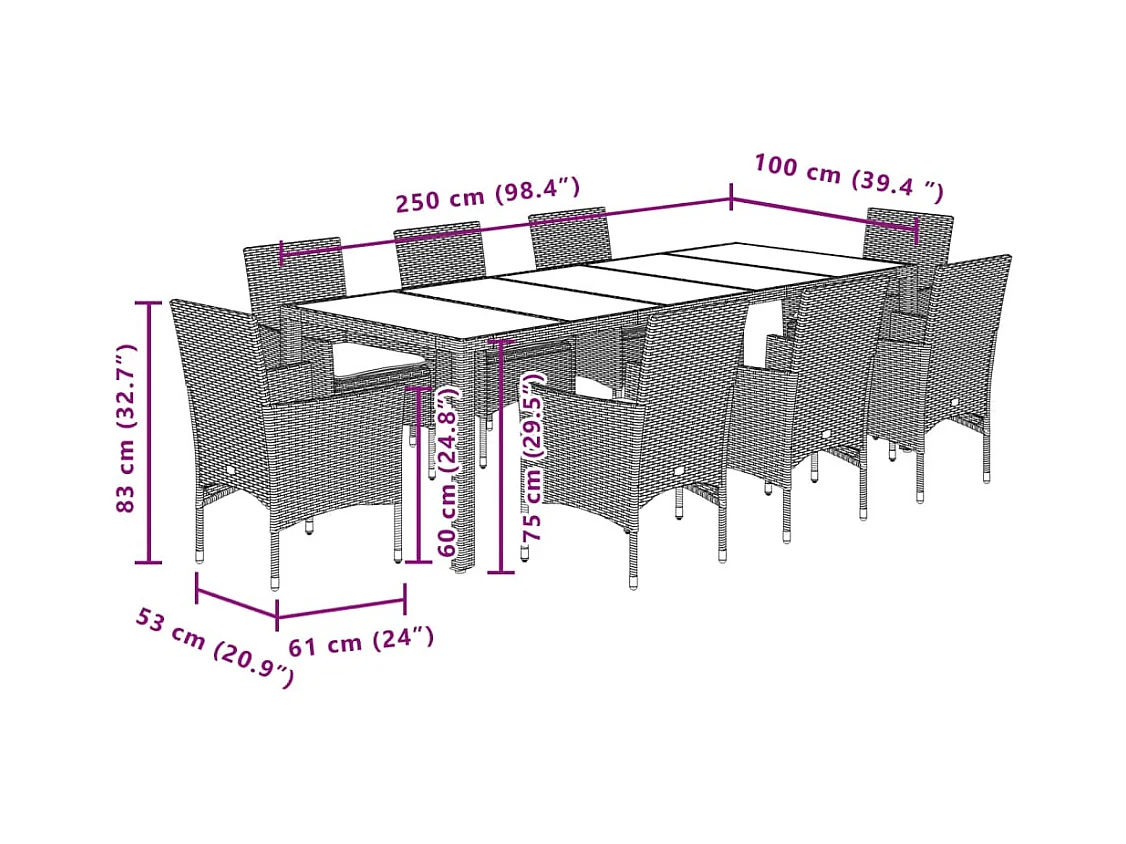 Set da Pranzo da Giardino 9 pz con Cuscini Polyrattan e Vetro