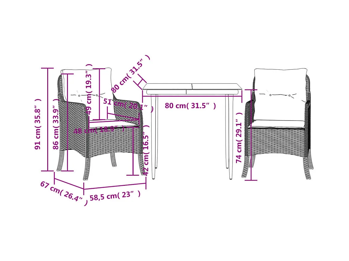 Set da pranzo da giardino con cuscini 3 pezzi nero