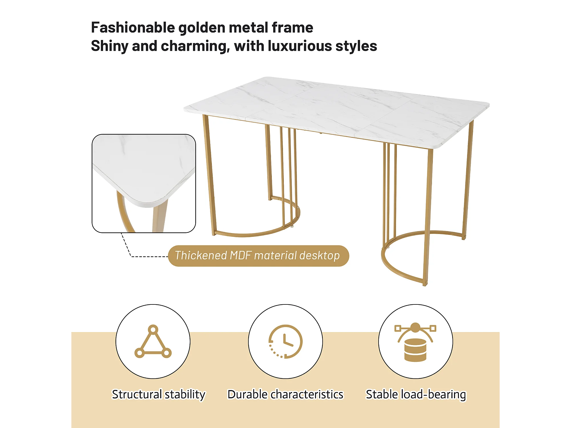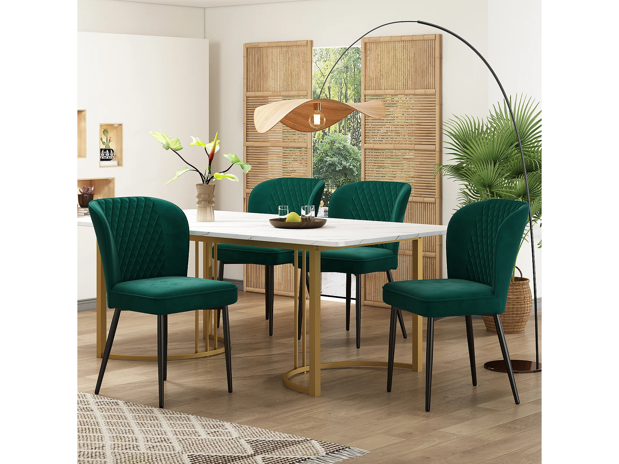 Set da pranzo da 5 pezzi, con 4 sedie, tavolo in MDF bianco, gambe in metallo dorato, sedie in velluto verde scuro (140x80x75 cm)