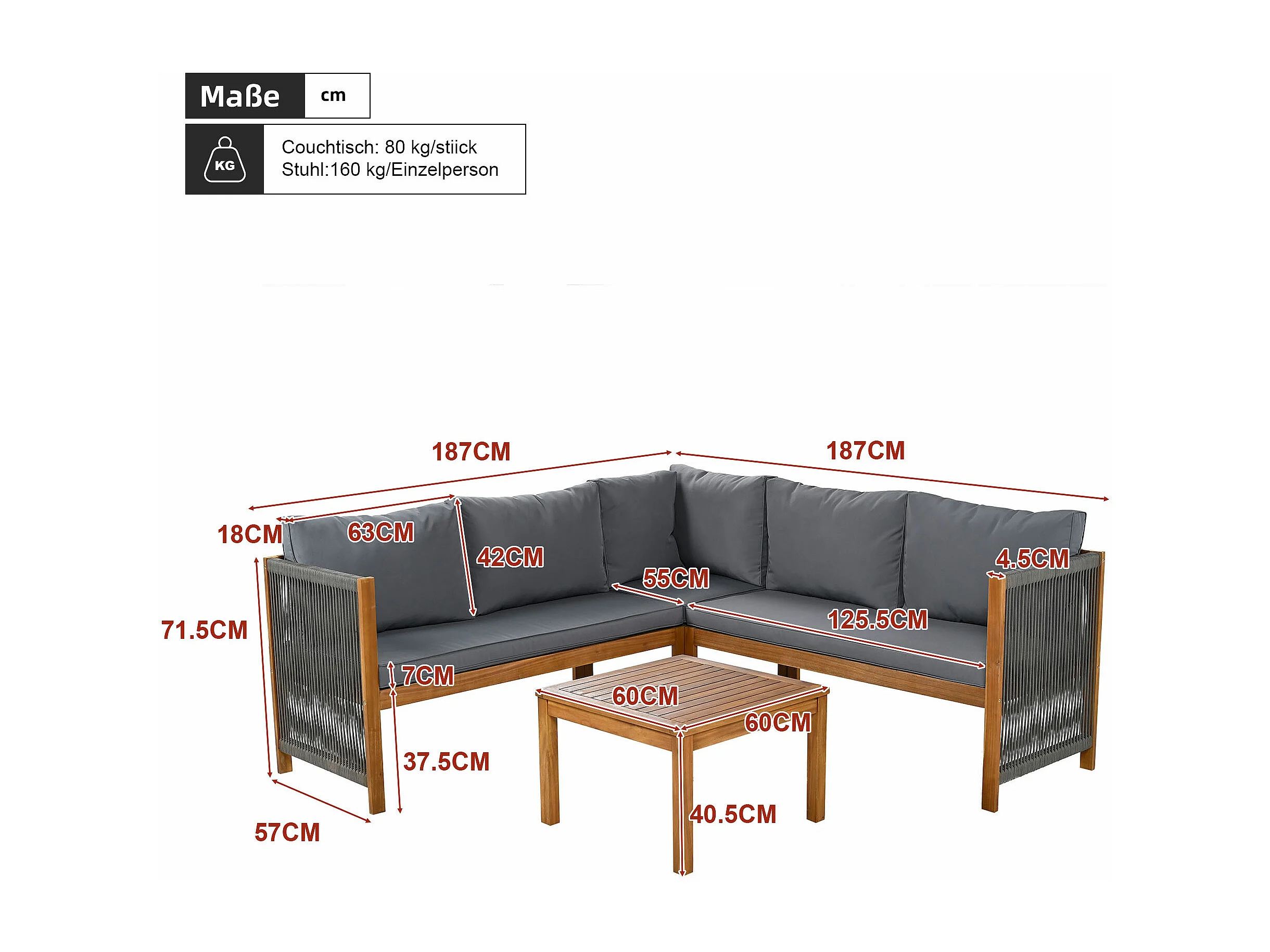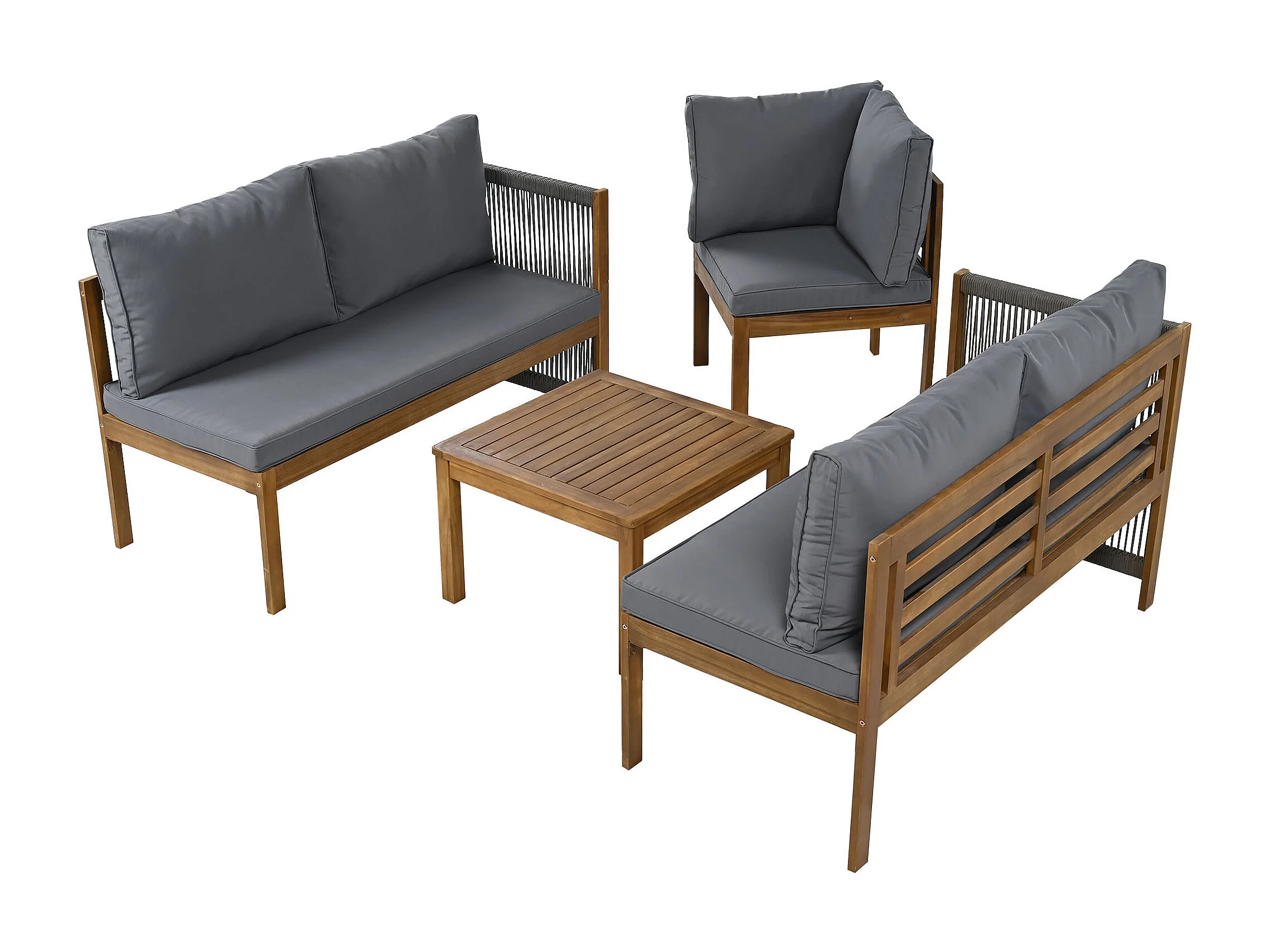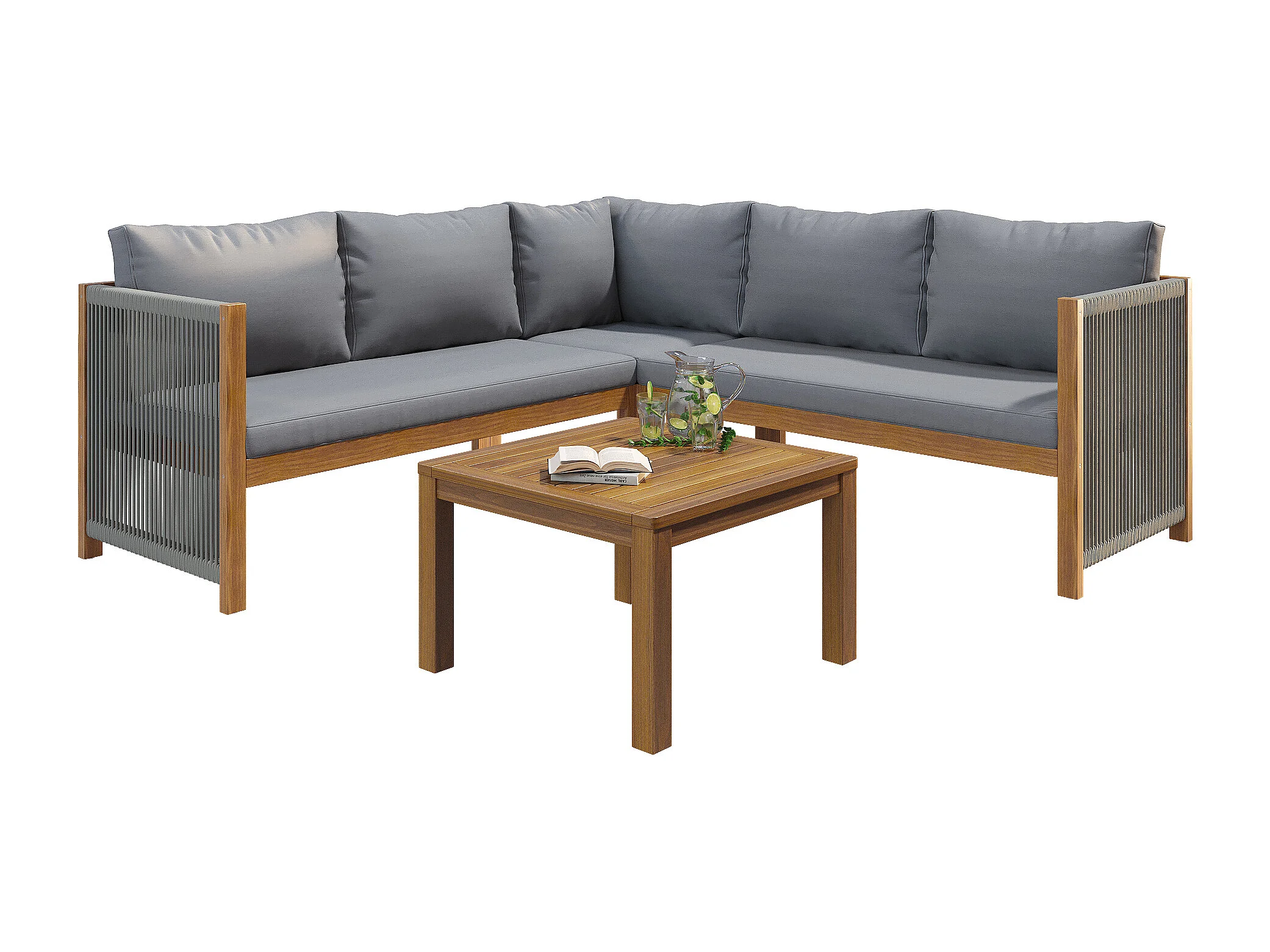Set da salotto da giardino per 5 persone, divano angolare + tavolino basso, struttura in acacia, in corda intrecciata, grigio