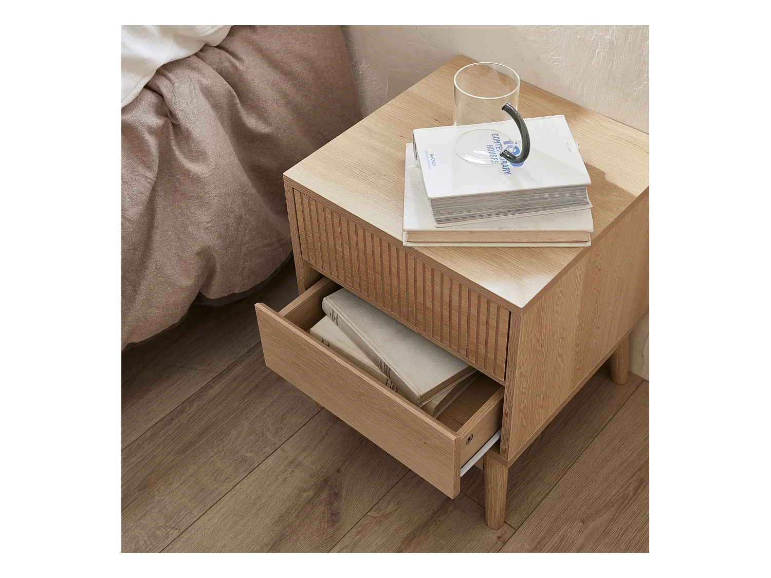 Comodino scandinavo con decori in legno scanalato, marrone