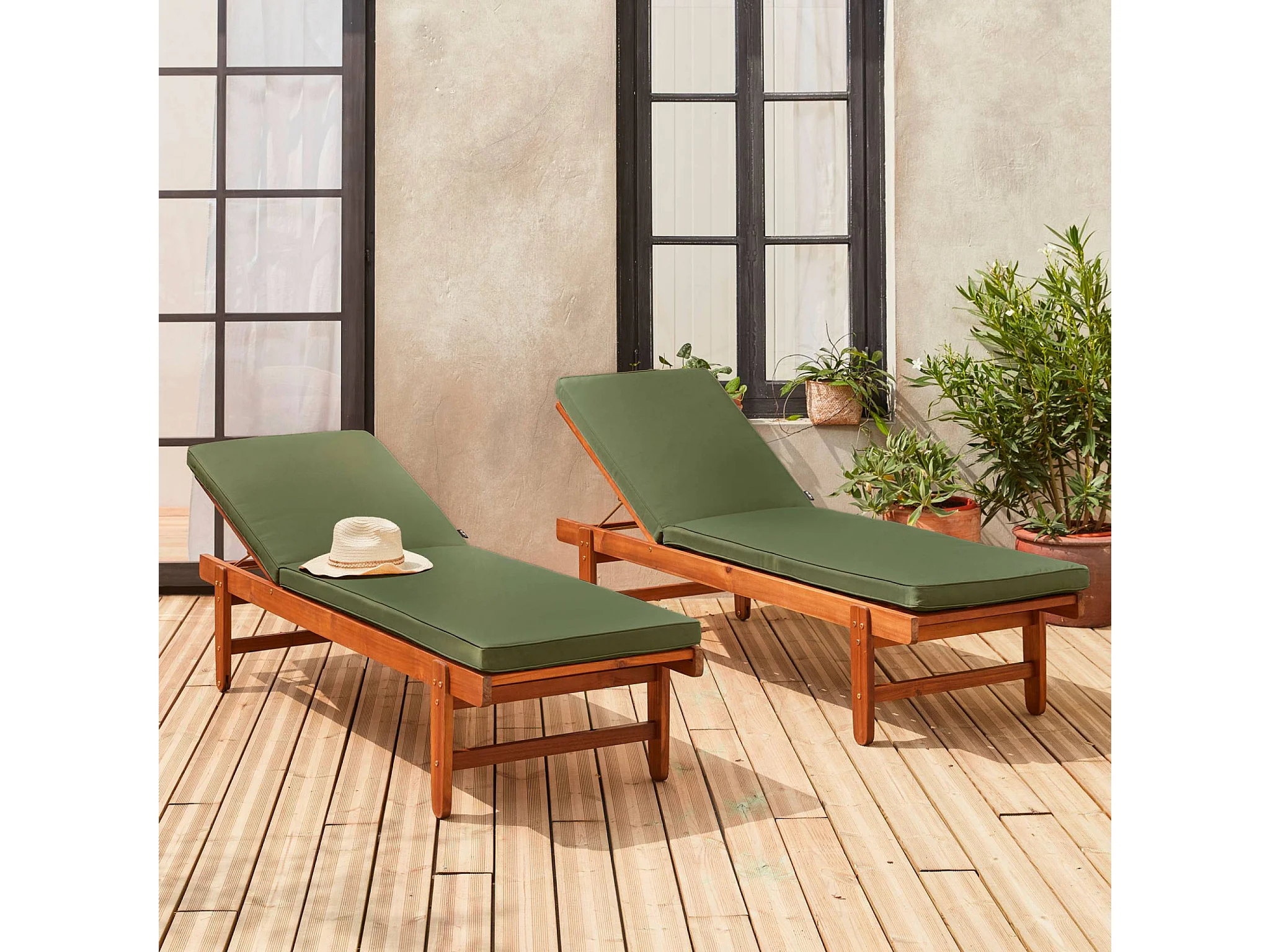Set di 2 lettini prendisole in legno multiposizione, verde kaki