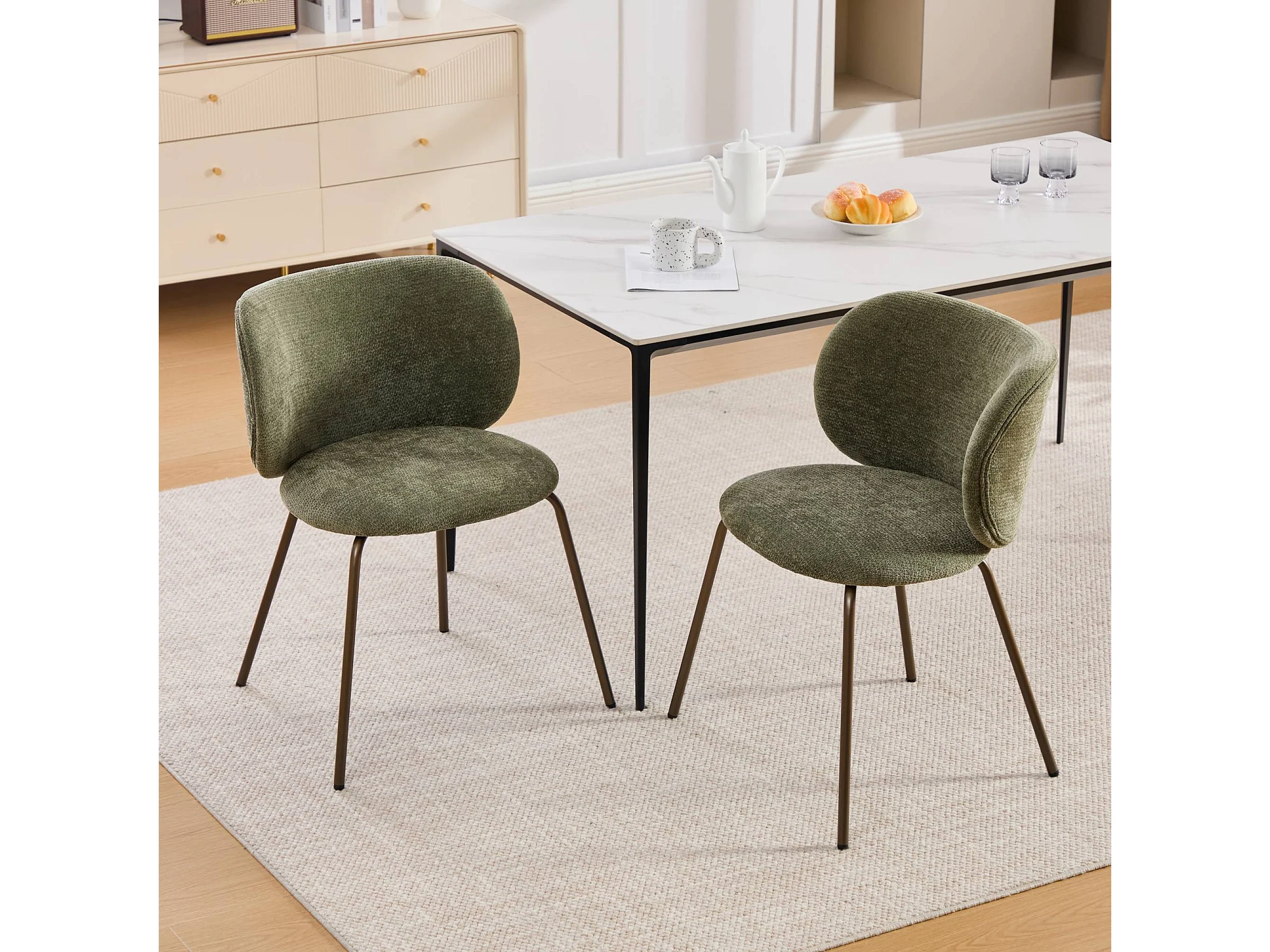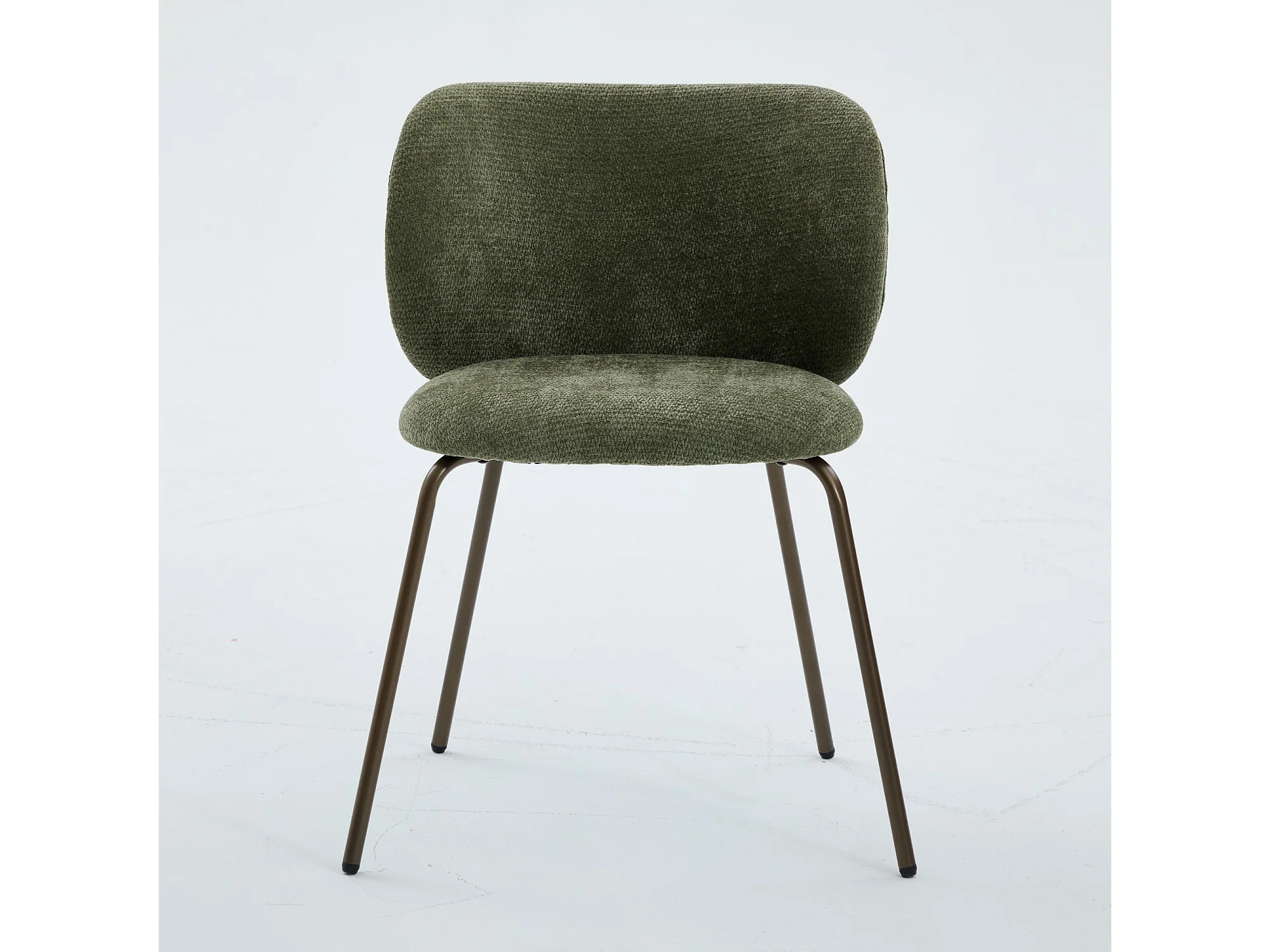 Set di 2 sedie da pranzo in ciniglia verde con gambe in metallo color bronzo.