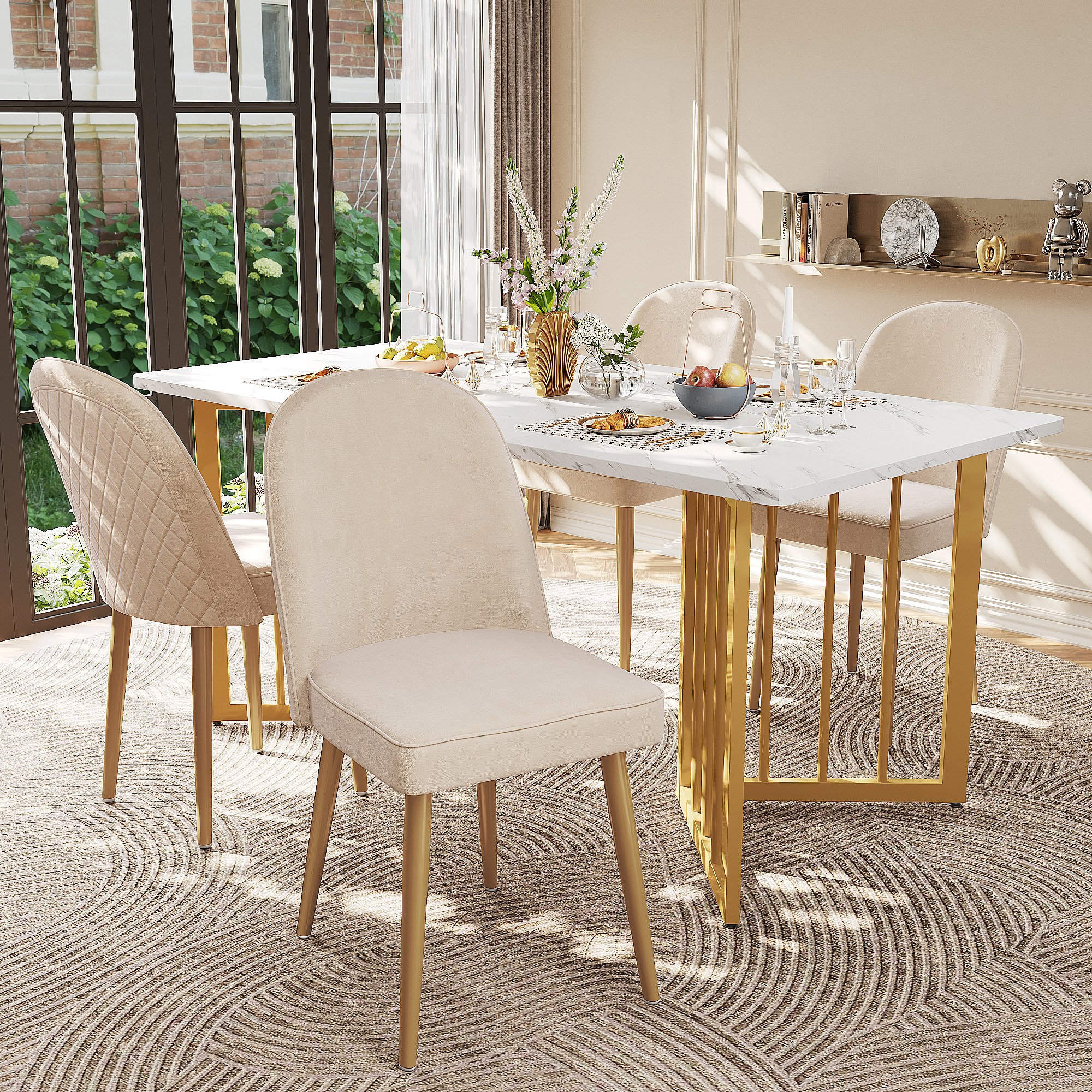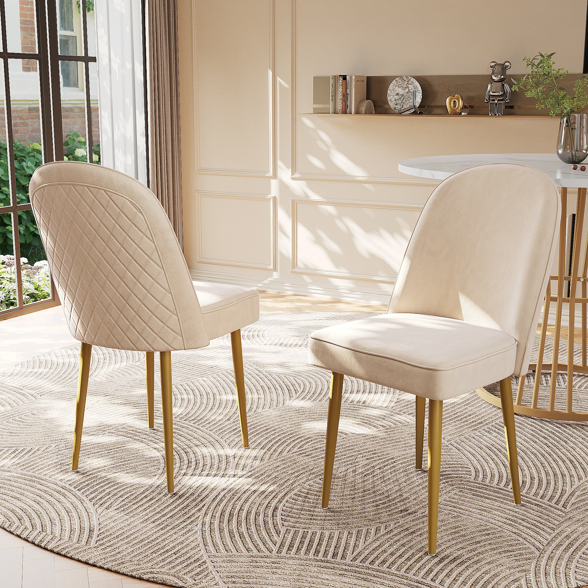 Set di 2 sedie da pranzo in velluto beige, sedia imbottita con schienale, gambe in metallo dorato