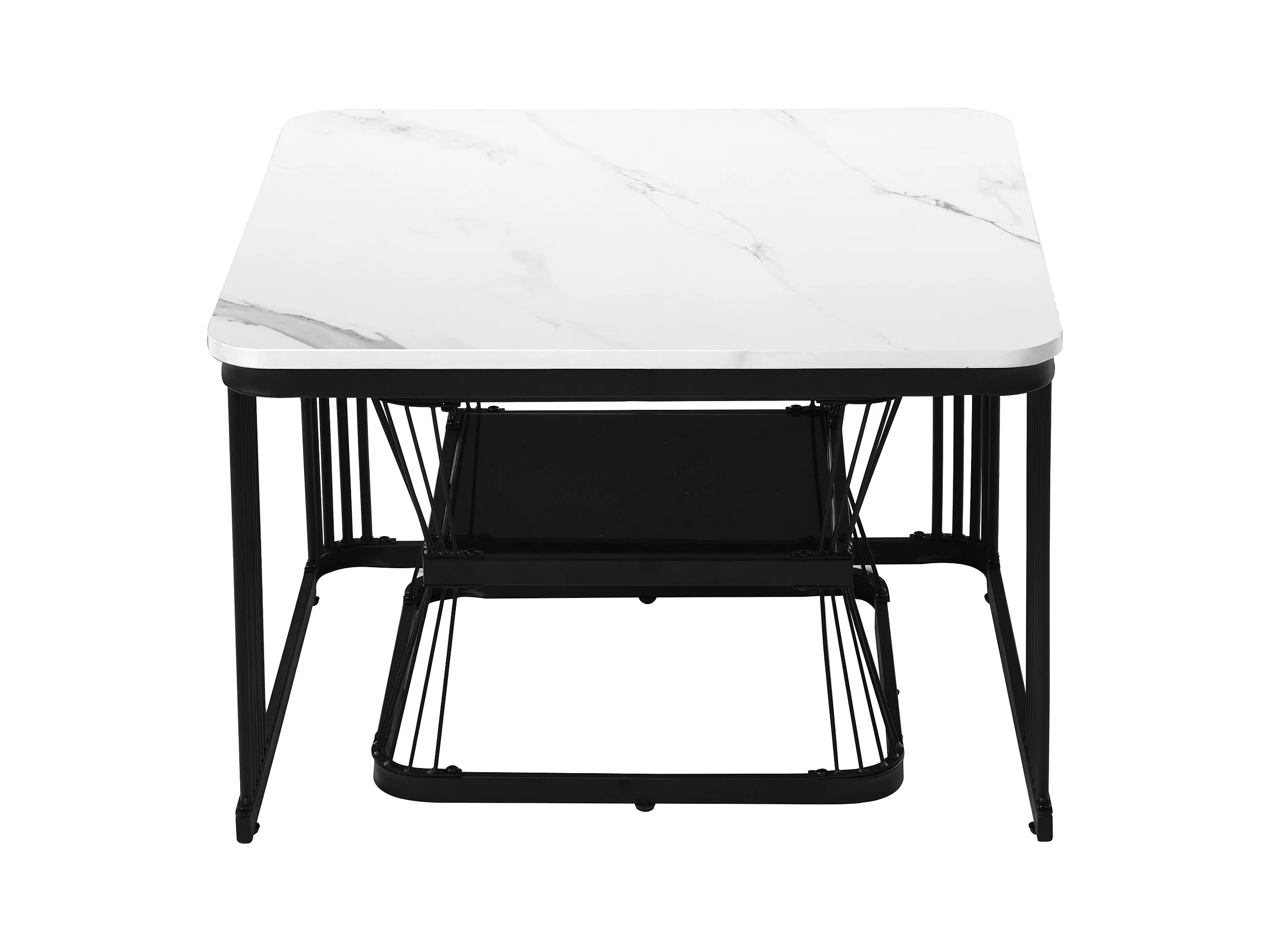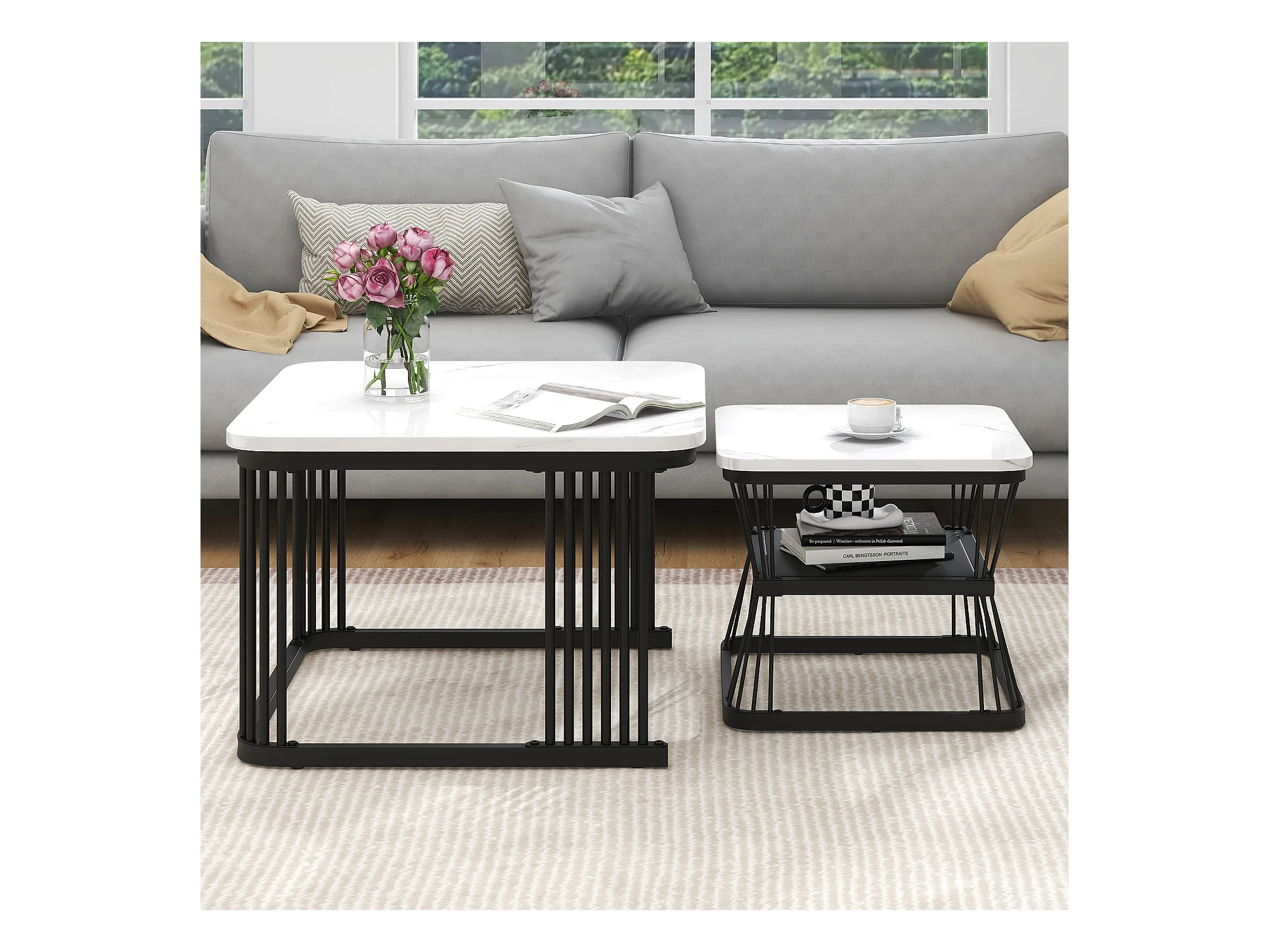 Set di 2 tavolini da caffè impilabili, piani effetto marmo bianco, gambe nere