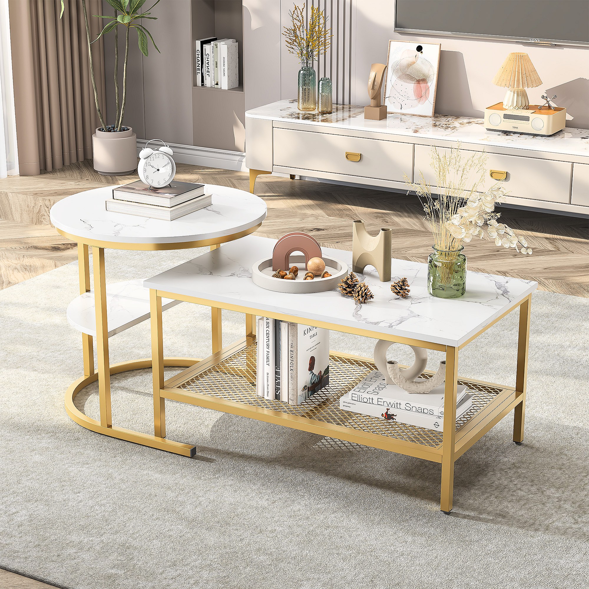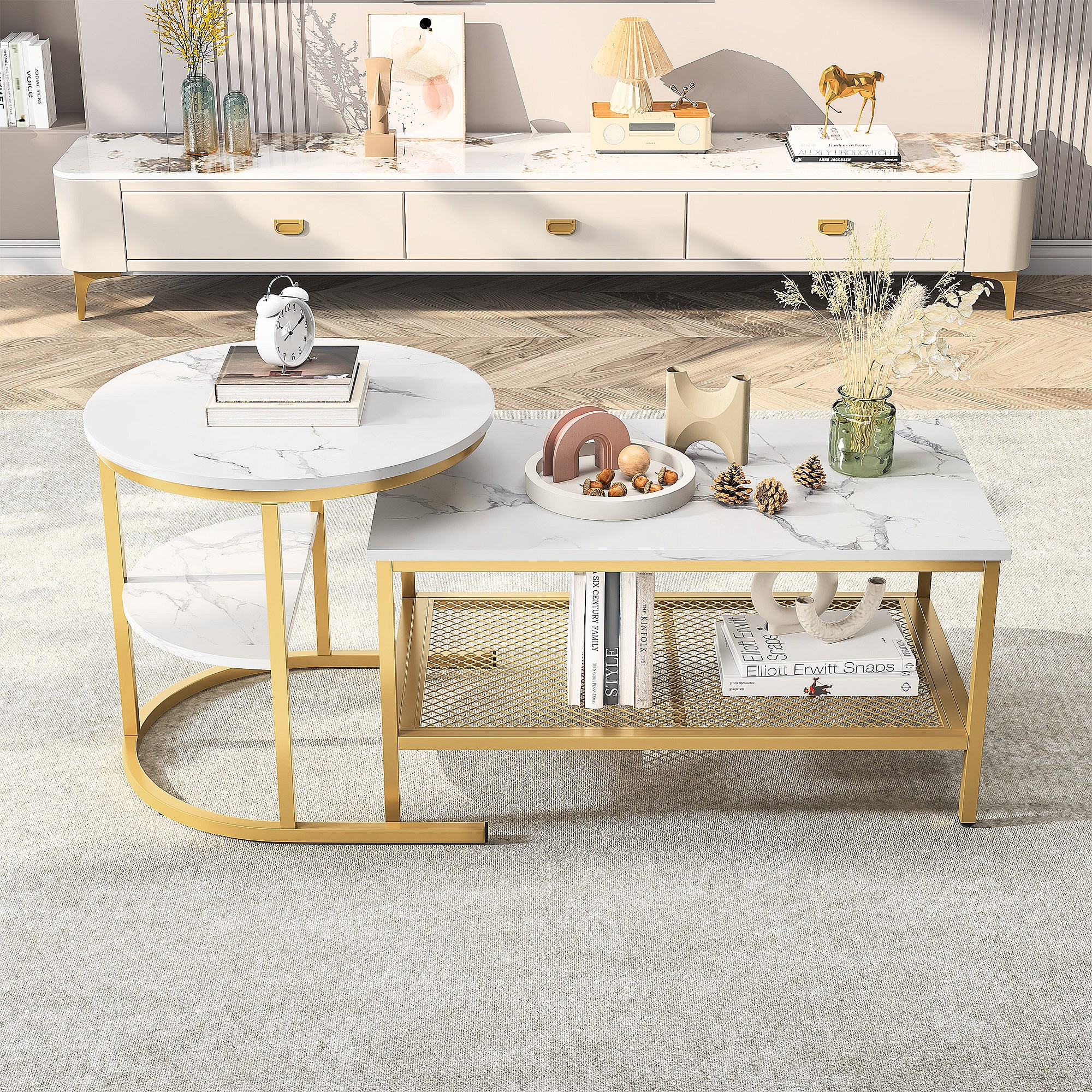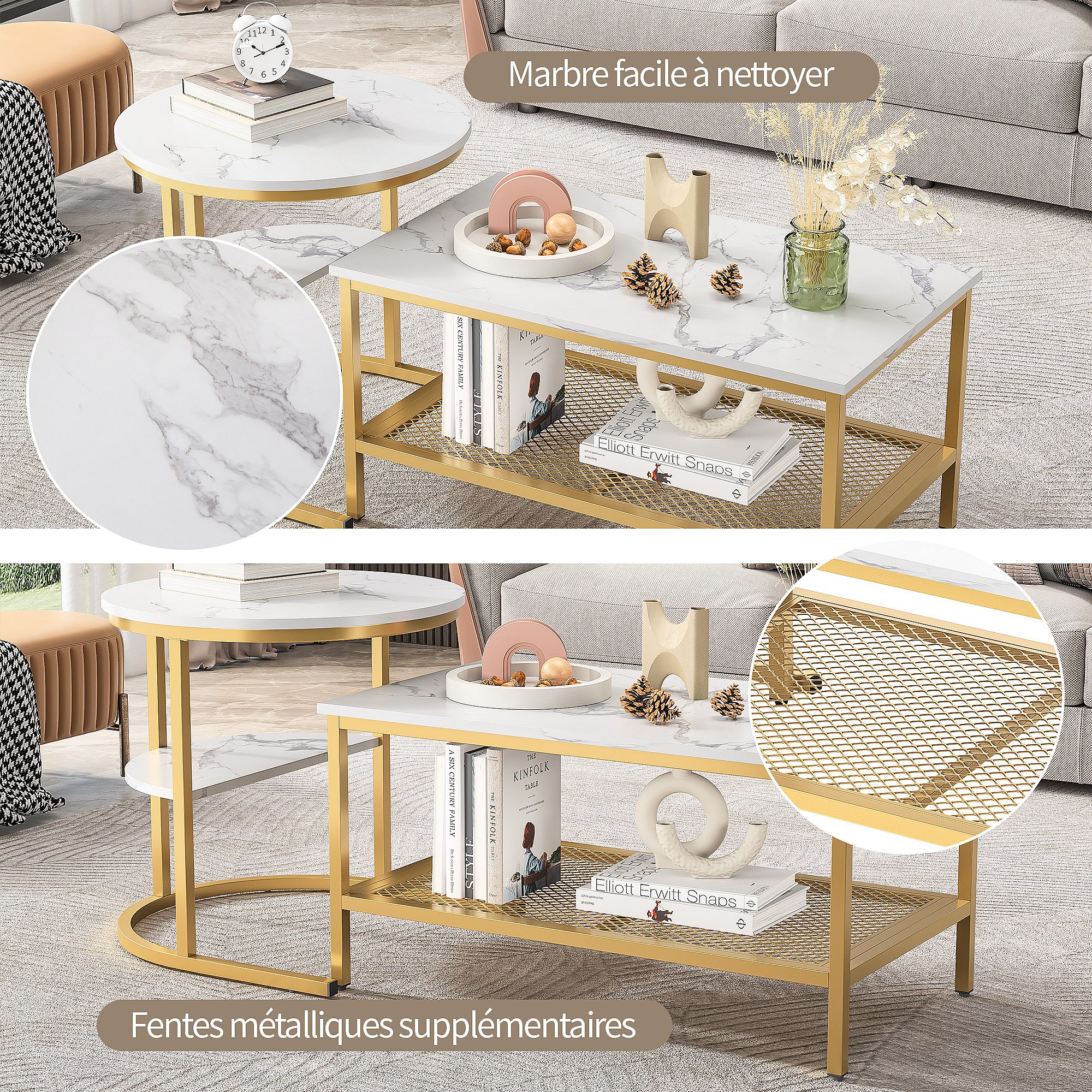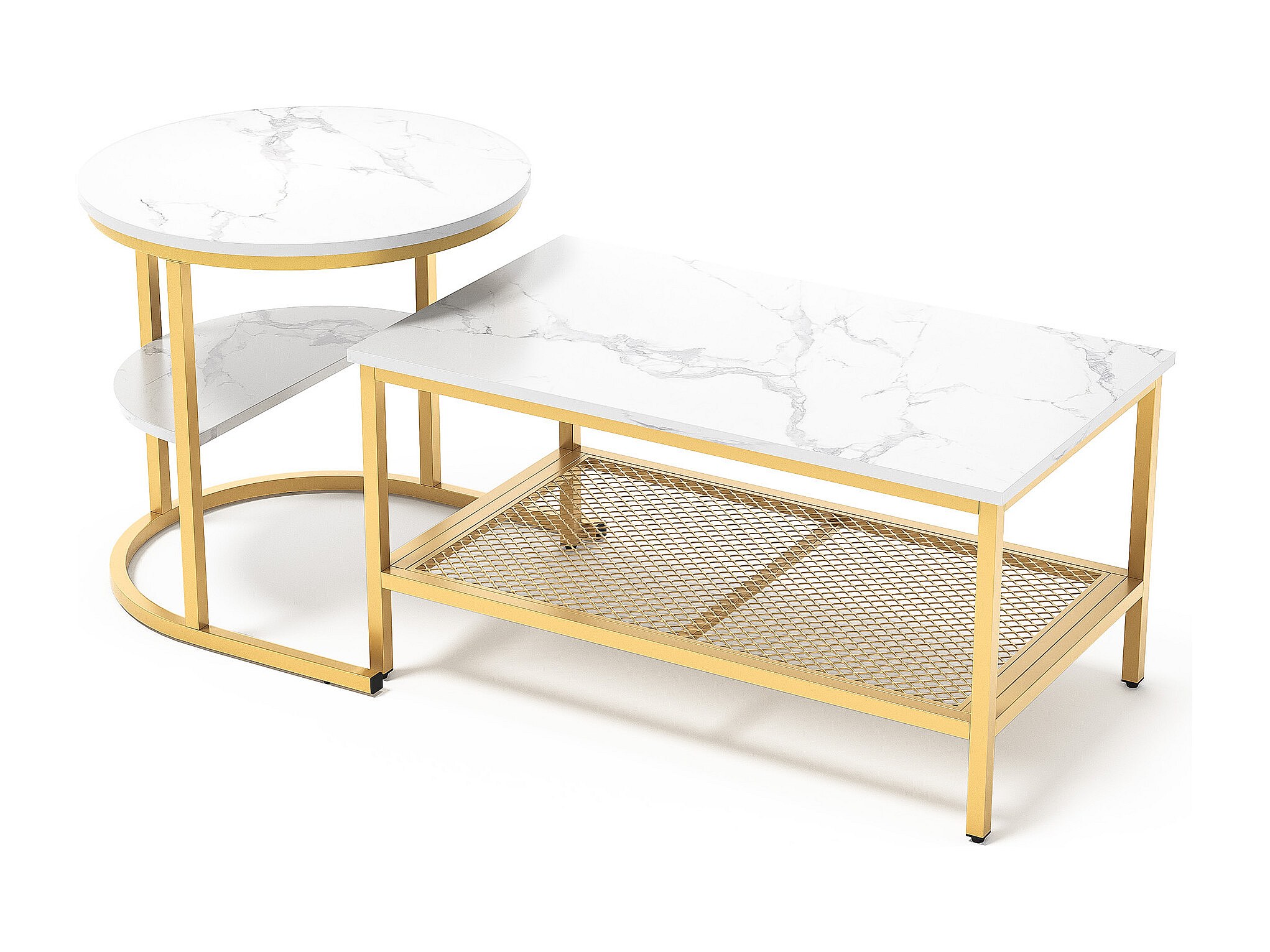 Set di 2 tavolini da caffè impilabili, tavolino con design in marmo, struttura in metallo dorato