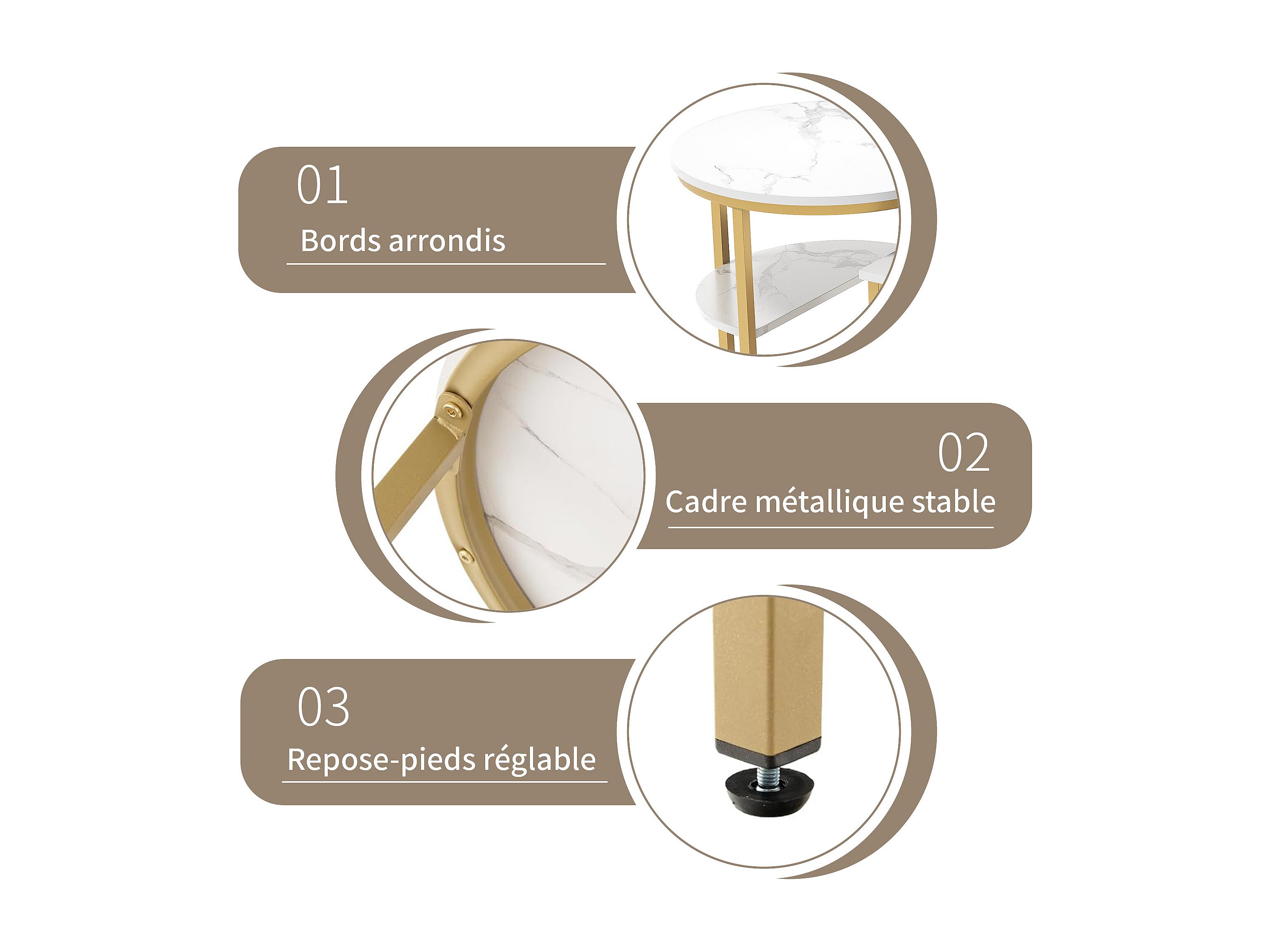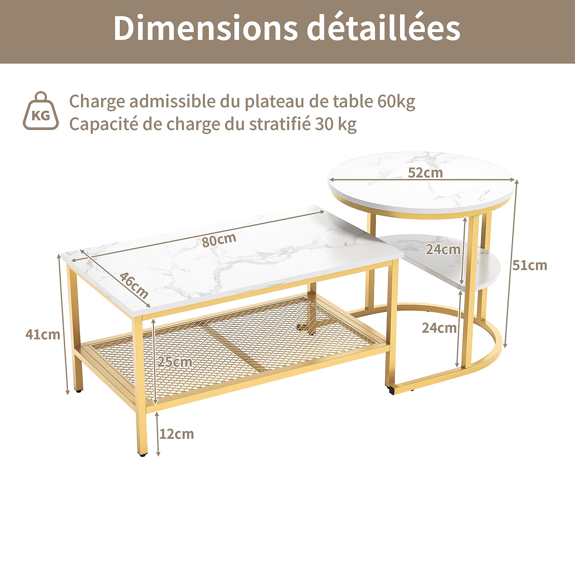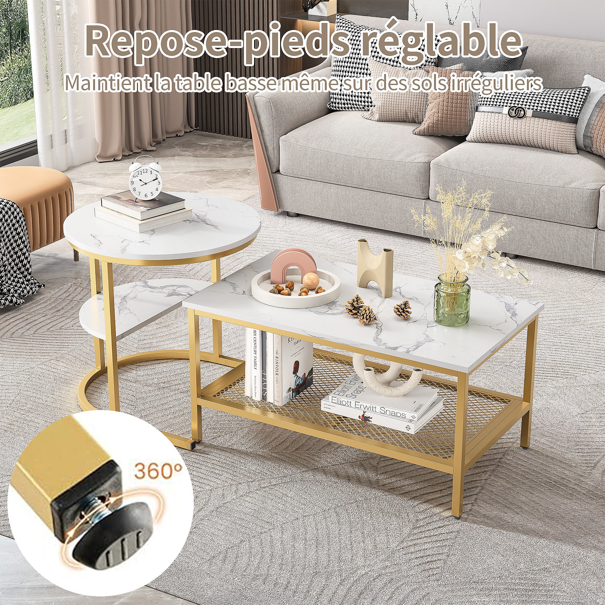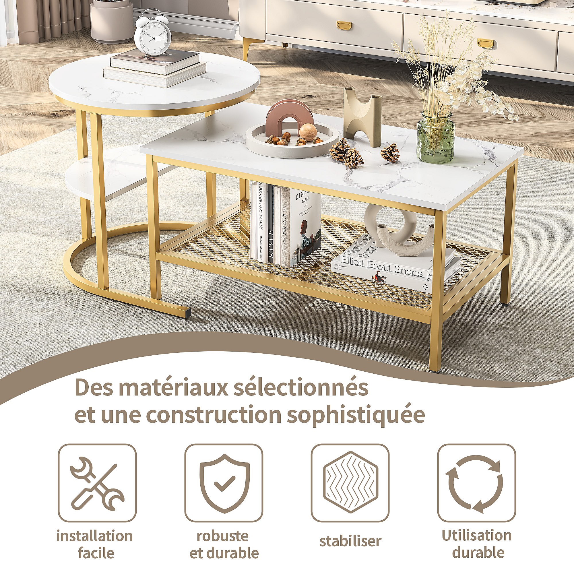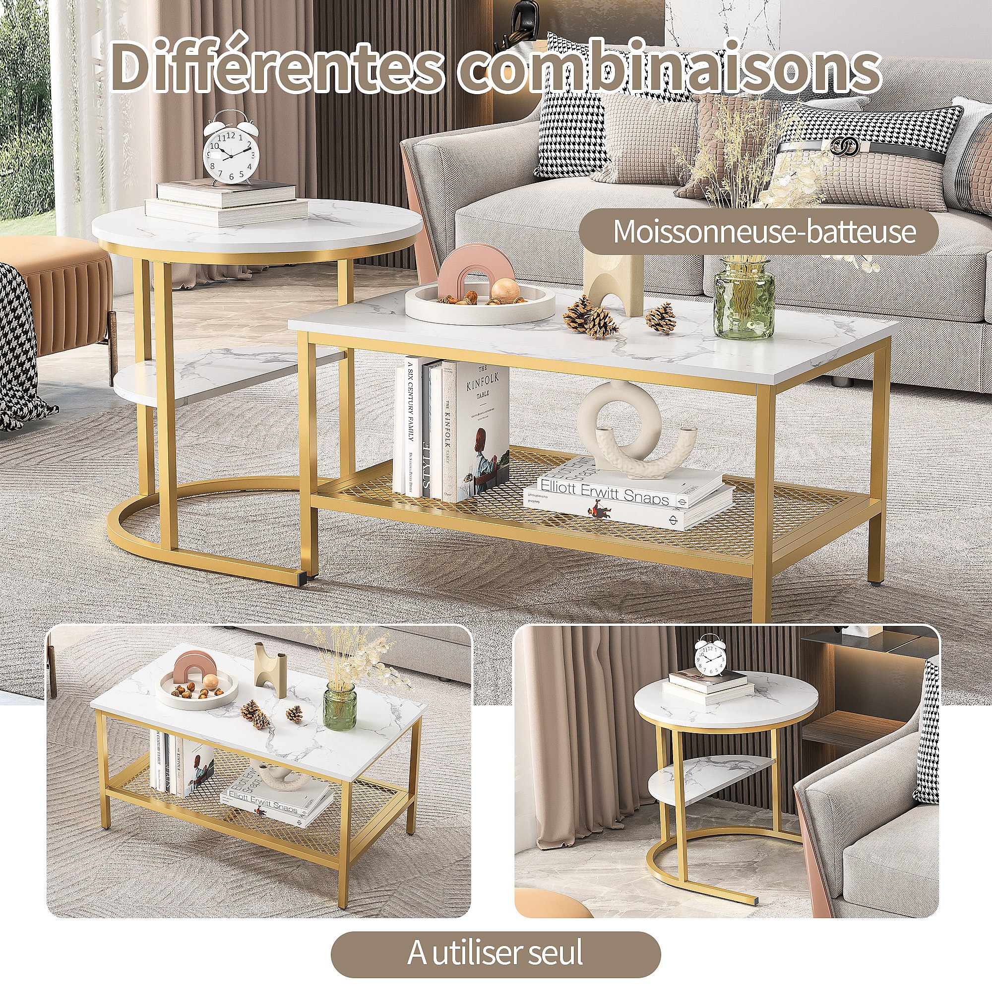 Set di 2 tavolini da caffè impilabili, tavolino con design in marmo, struttura in metallo dorato