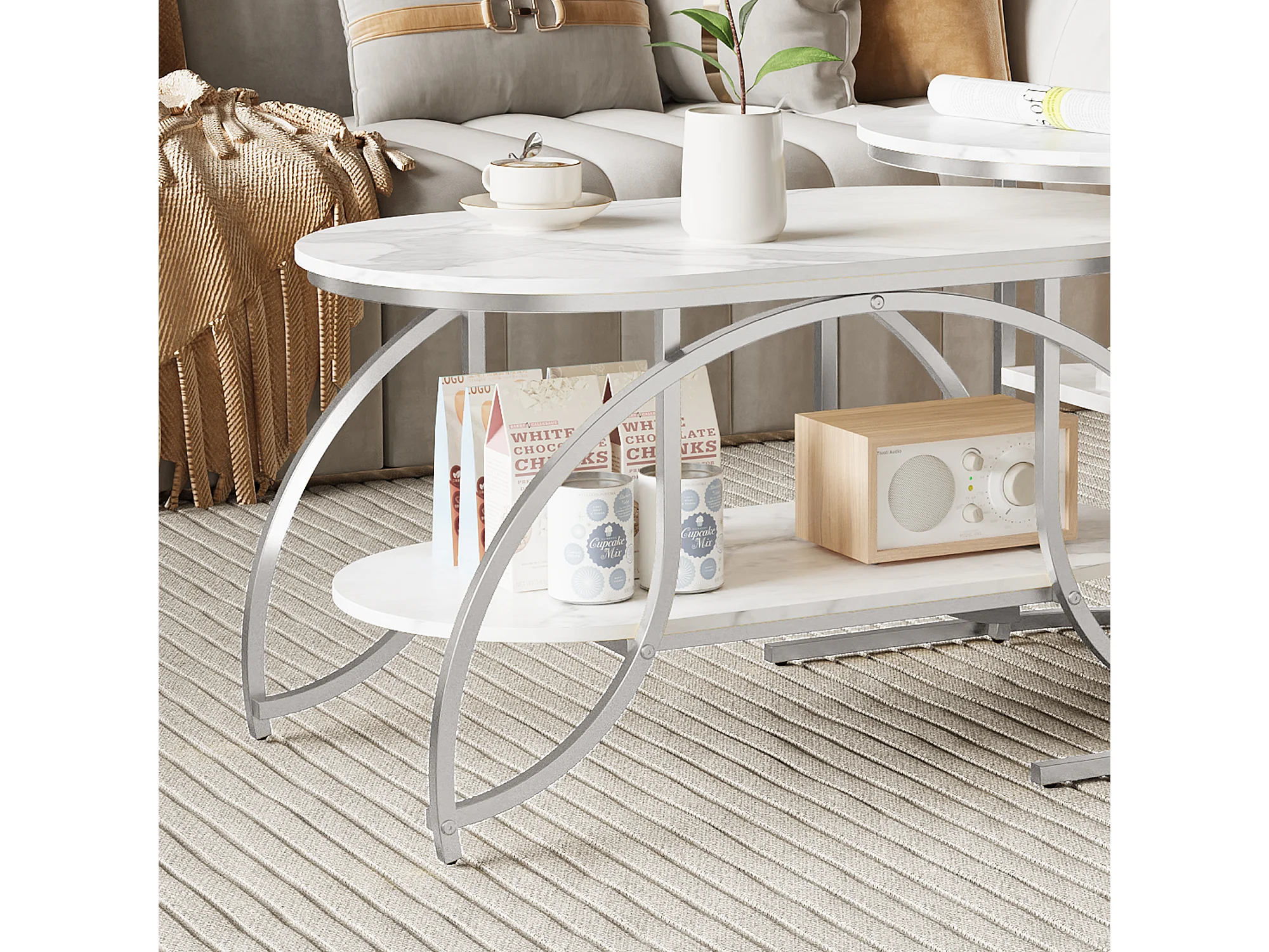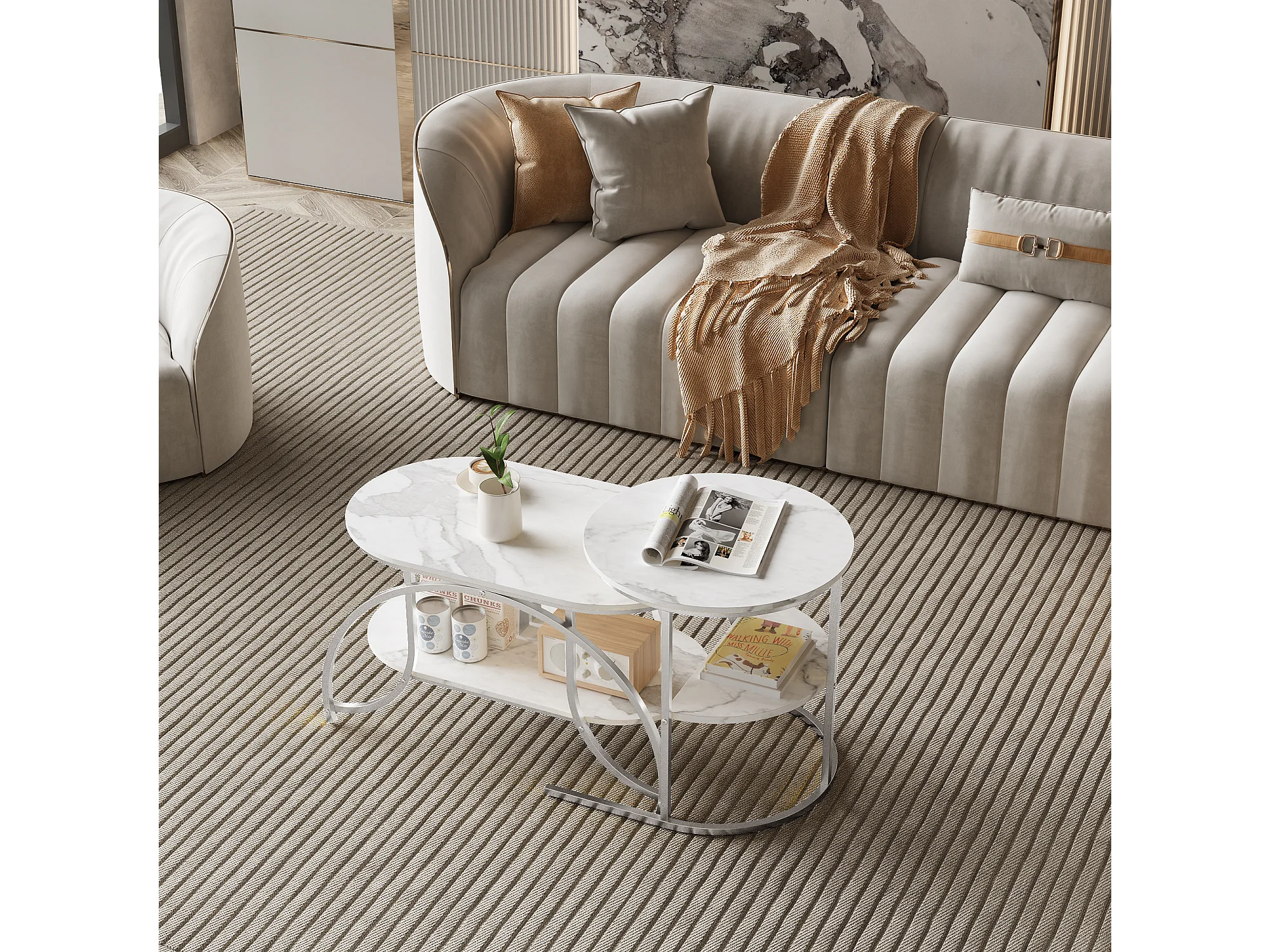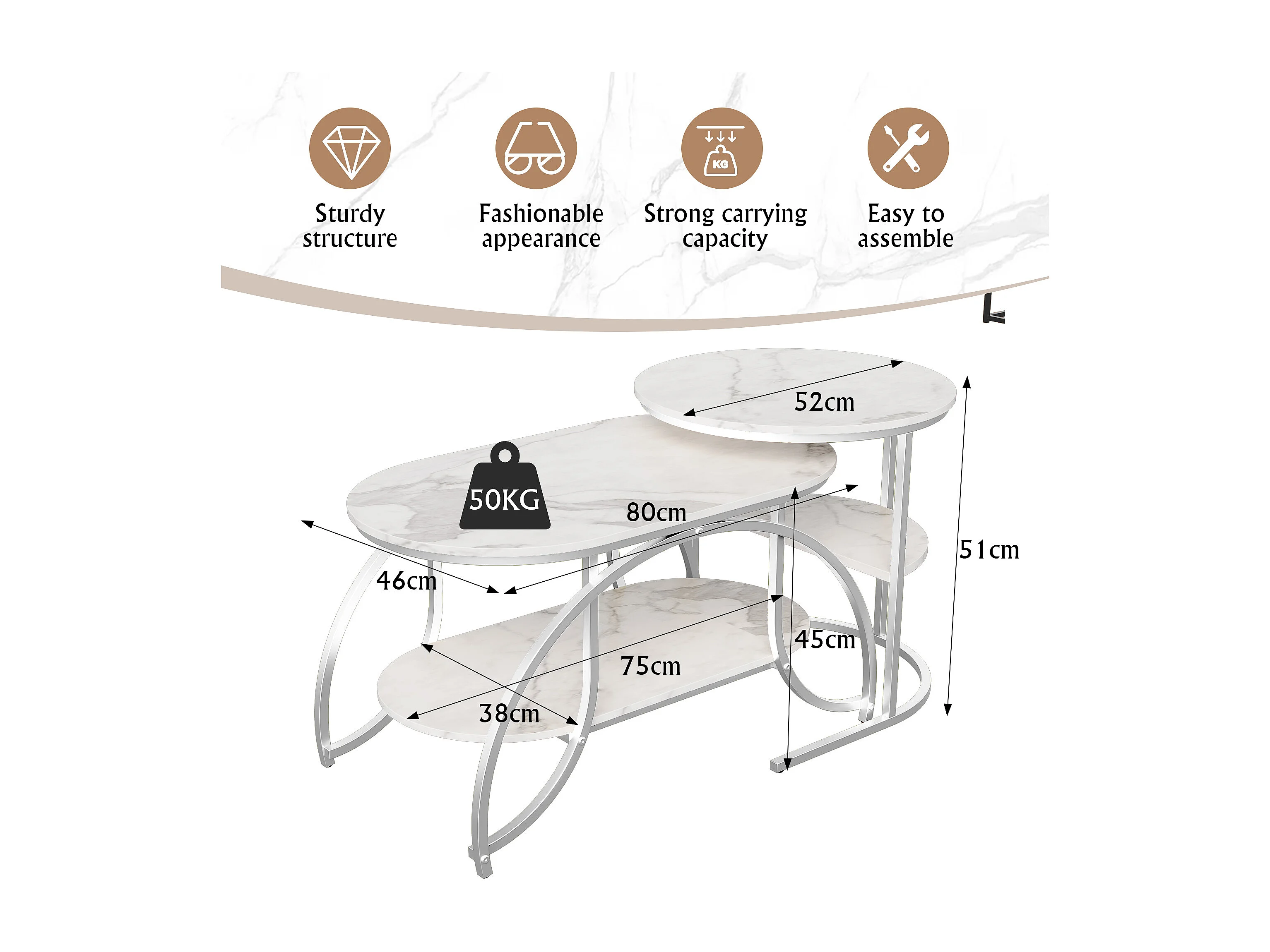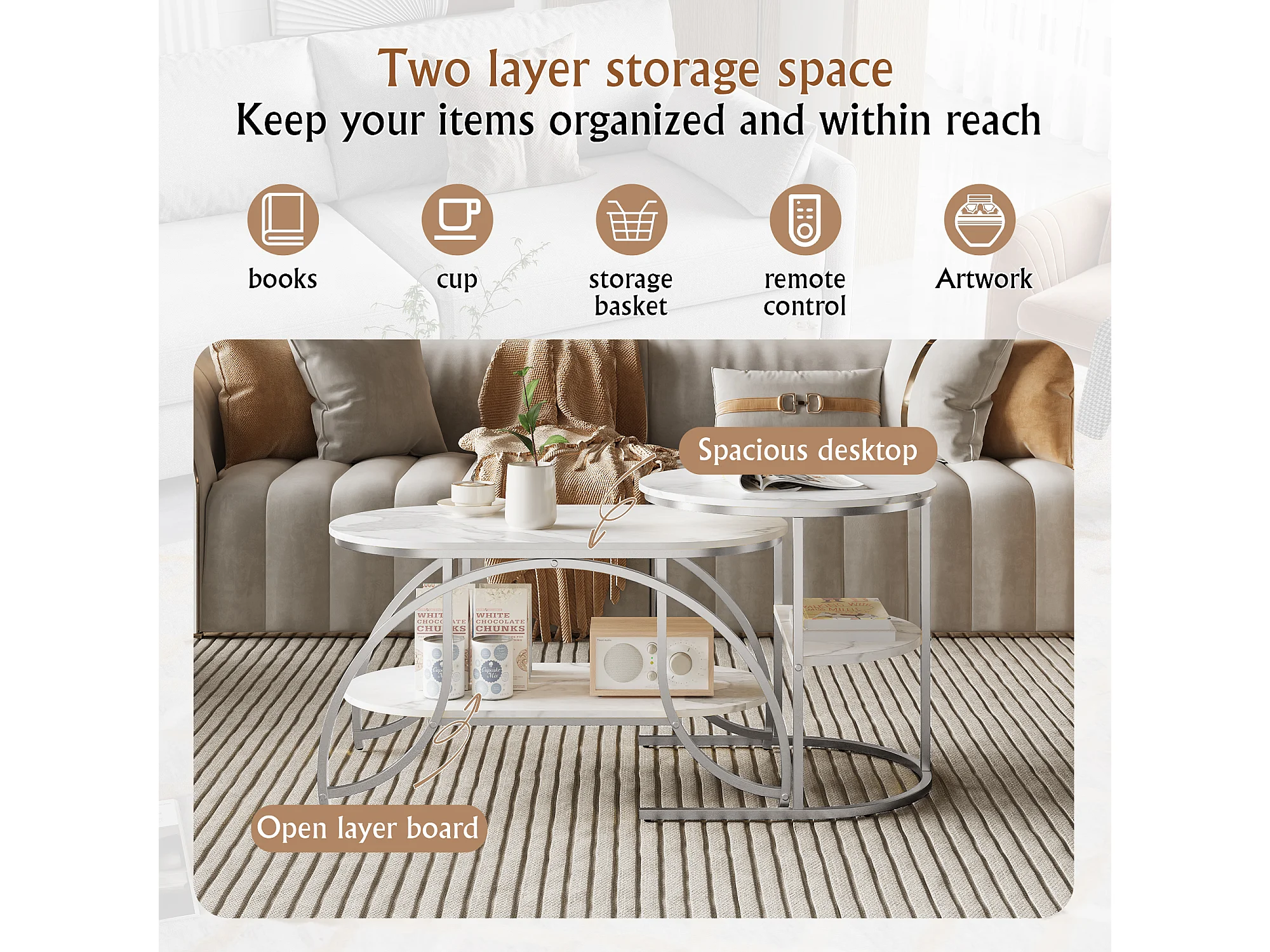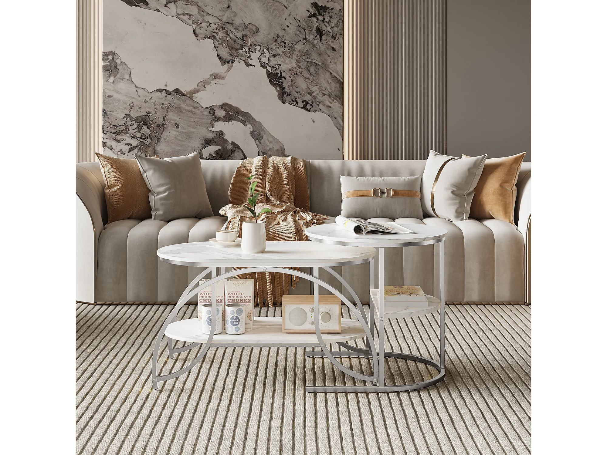 Set di 2 tavolini da caffè impilabili, tavolino da caffè rotondo in marmo, tavolini laterali rotondi, argento + bianco