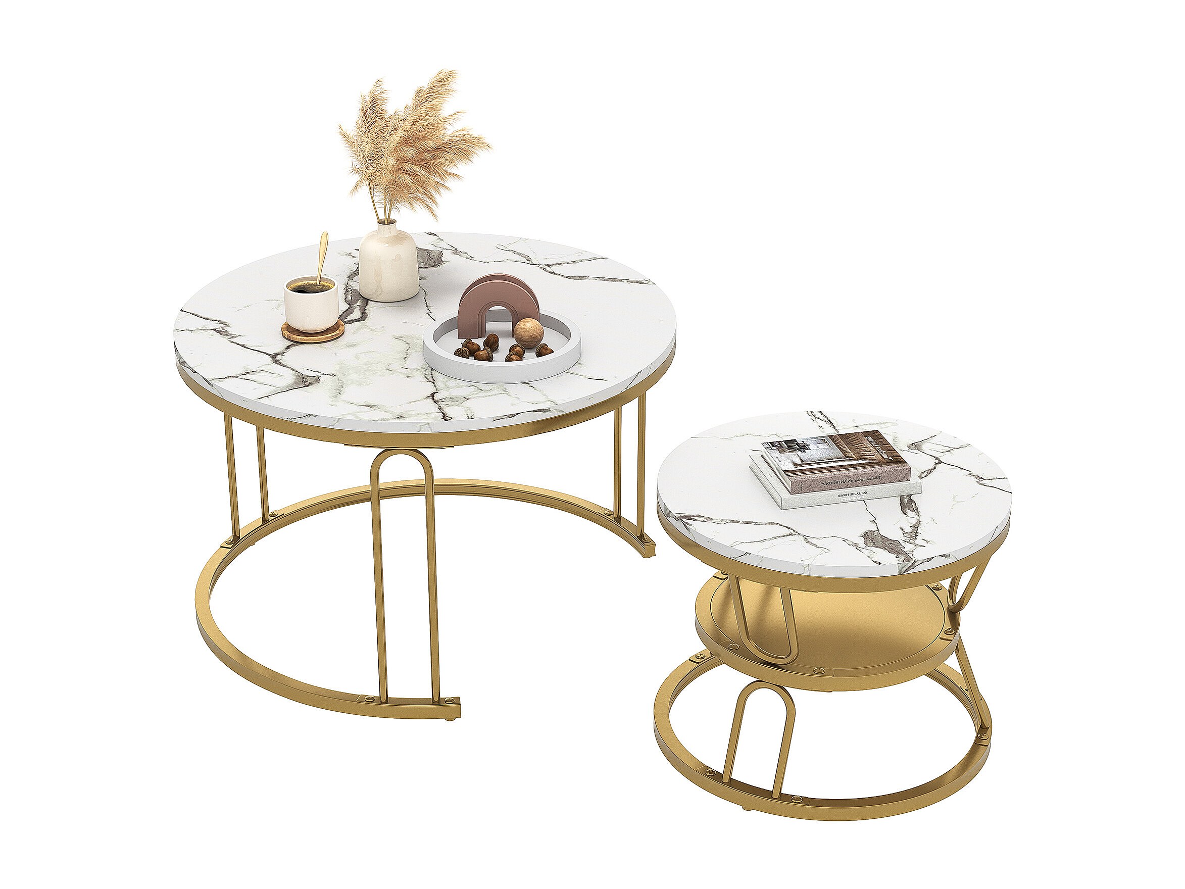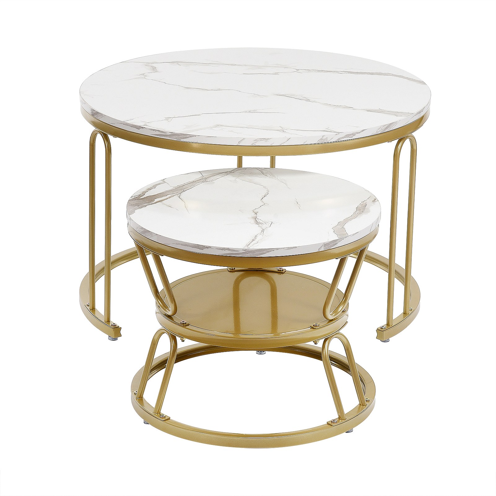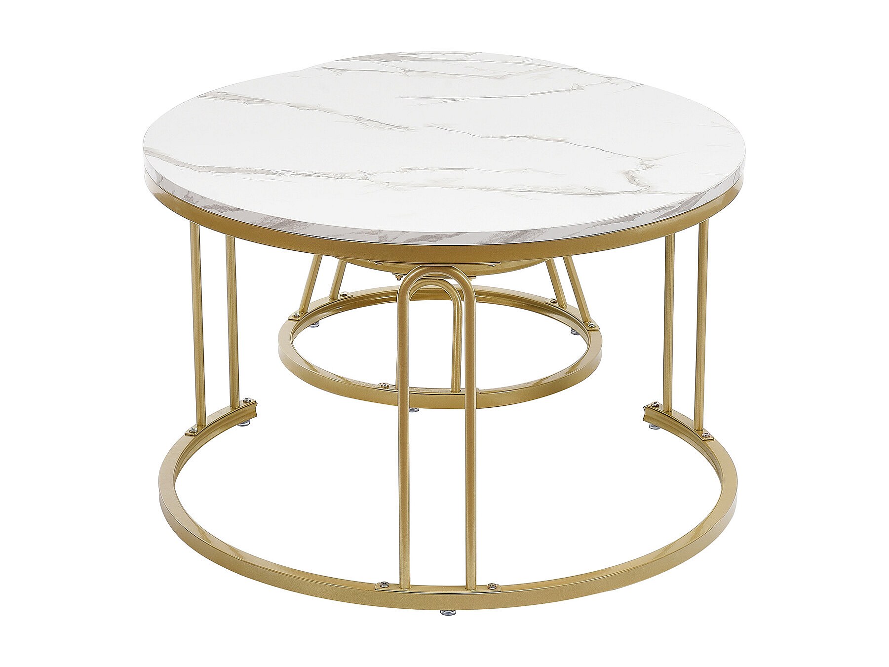 Set di 2 tavolini da caffè rotondi in legno impilabili - Effetto marmo - A forma di U color oro