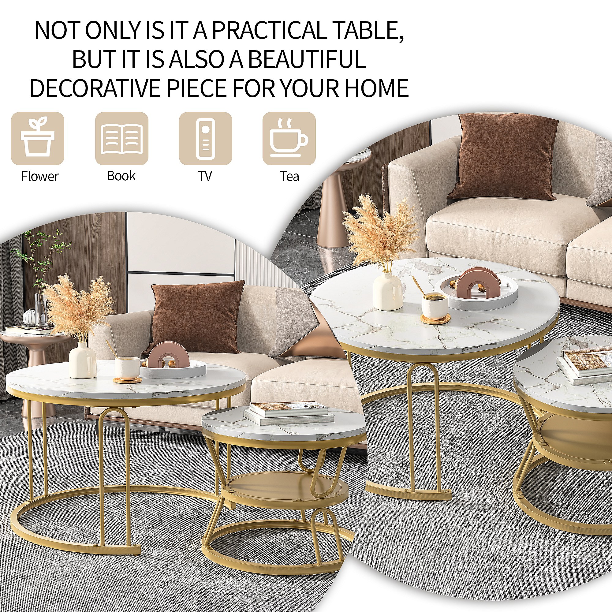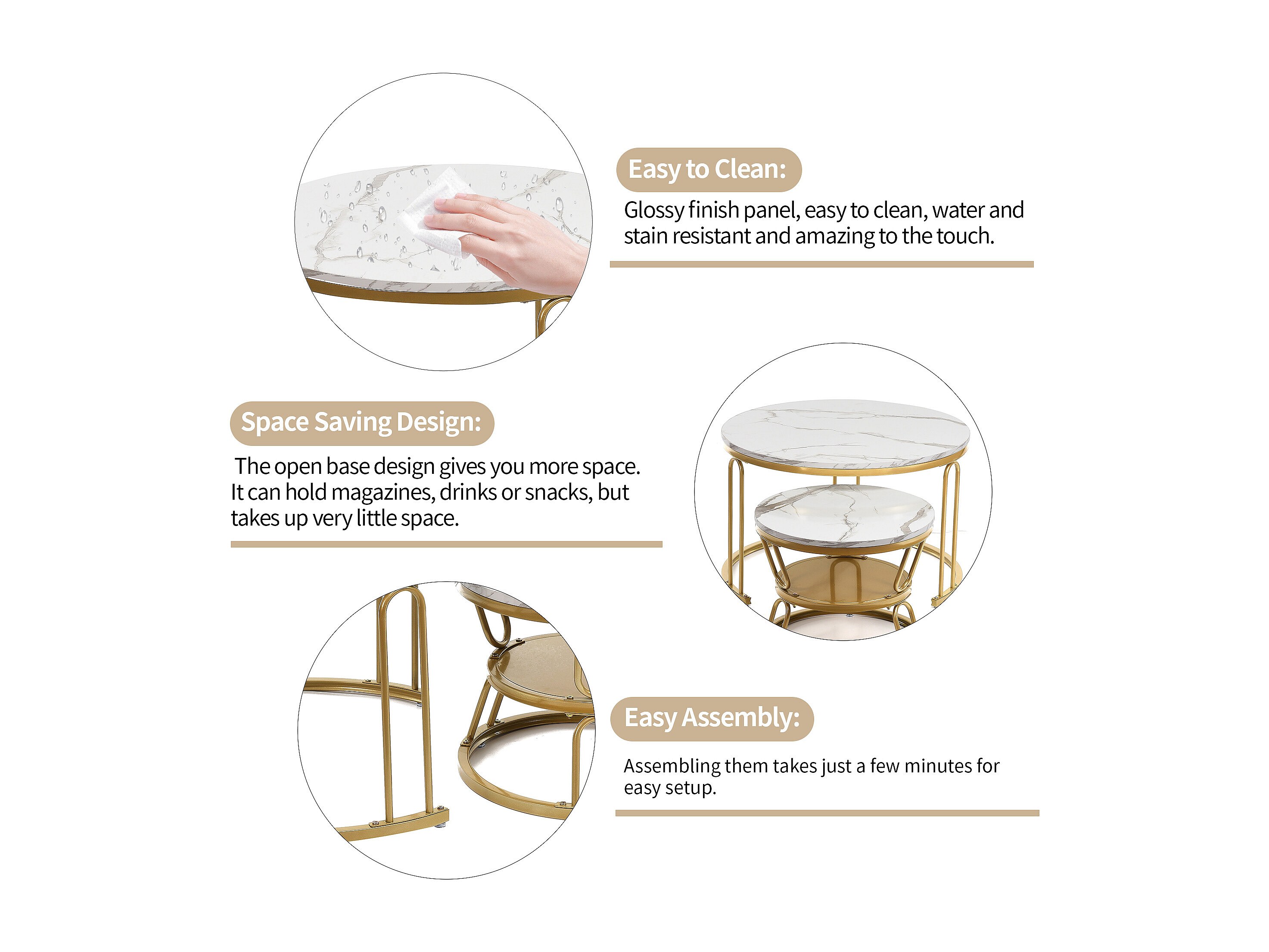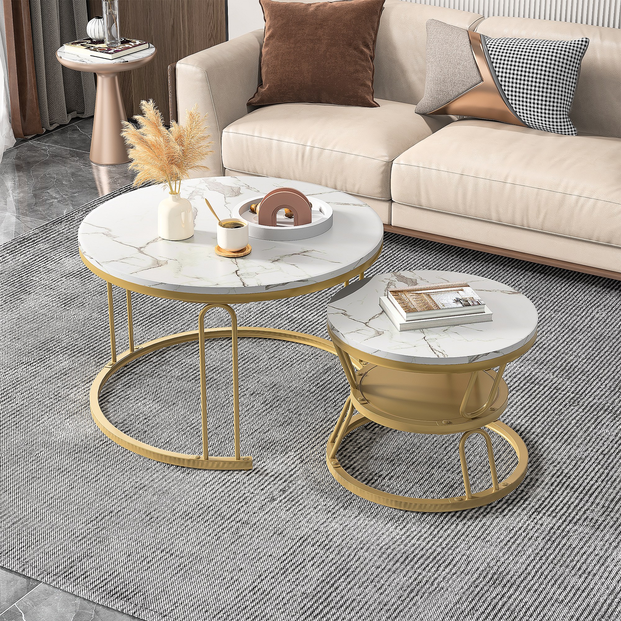 Set di 2 tavolini da caffè rotondi in legno impilabili - Effetto marmo - A forma di U color oro